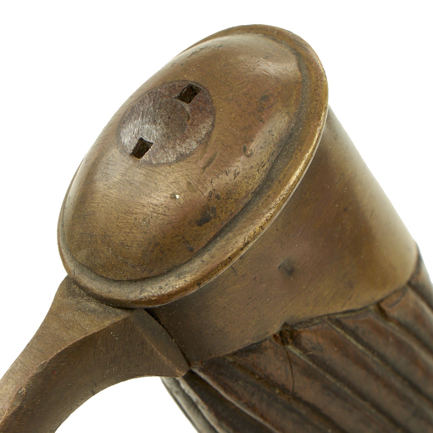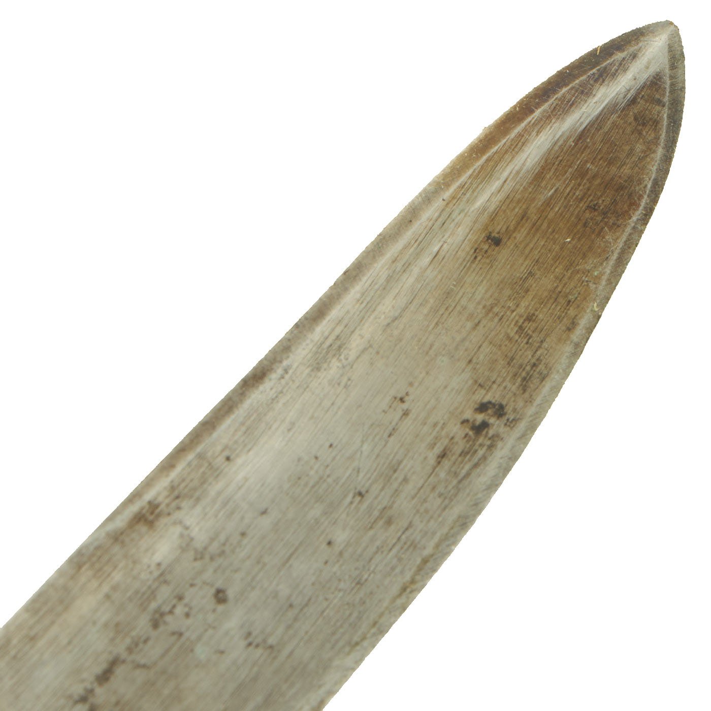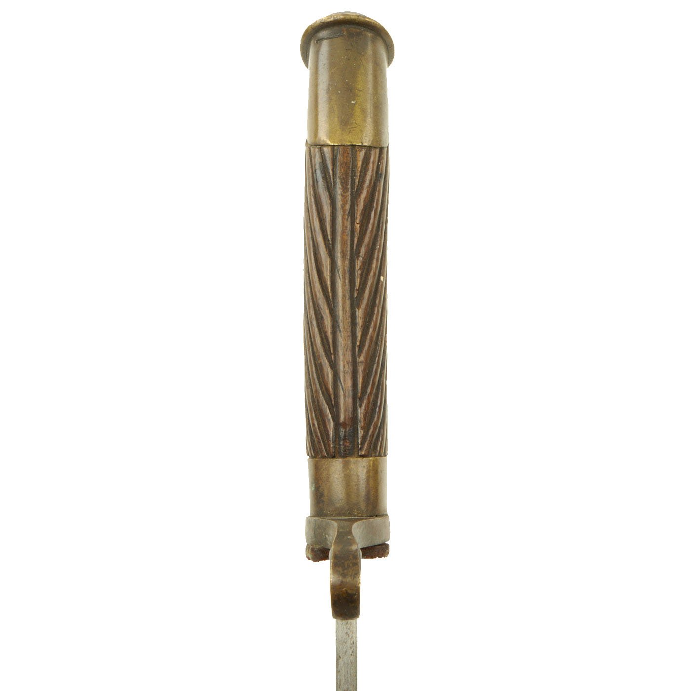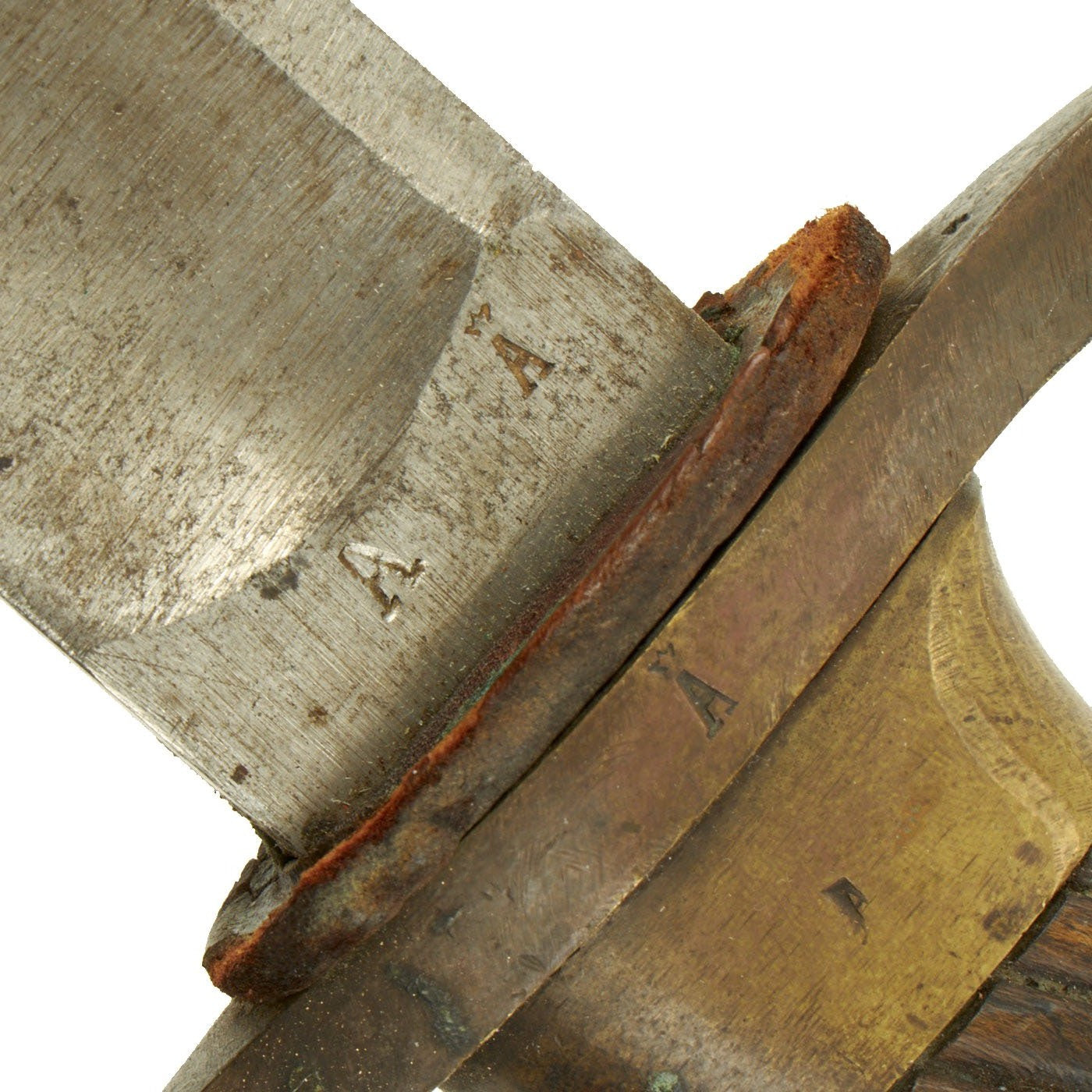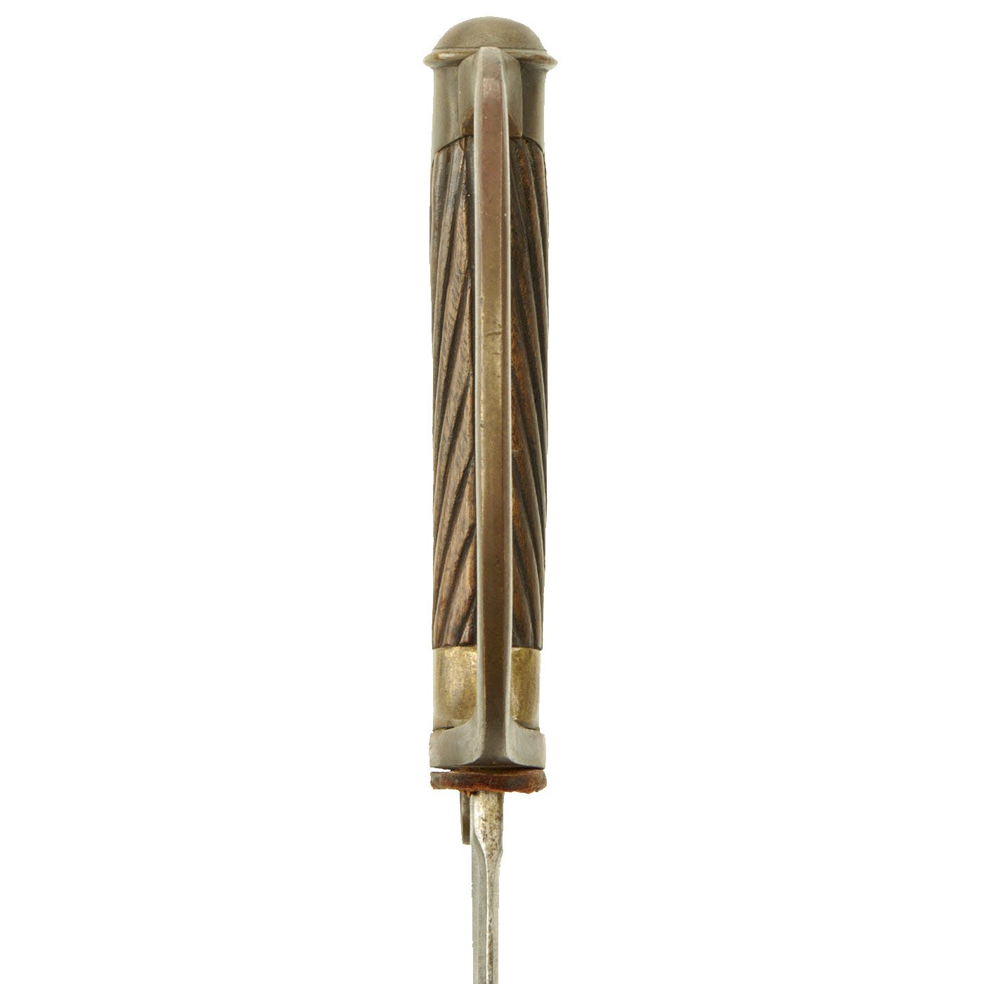 The hilt is still very snug on the tang, with no wobble, and the original leather blade buffer is present as well. The tang nut does not show any signs of turning any time recently, and is level with the pommel. The hilt overall has a lovely patina, and the grooved wooden grip is still in very good shape.