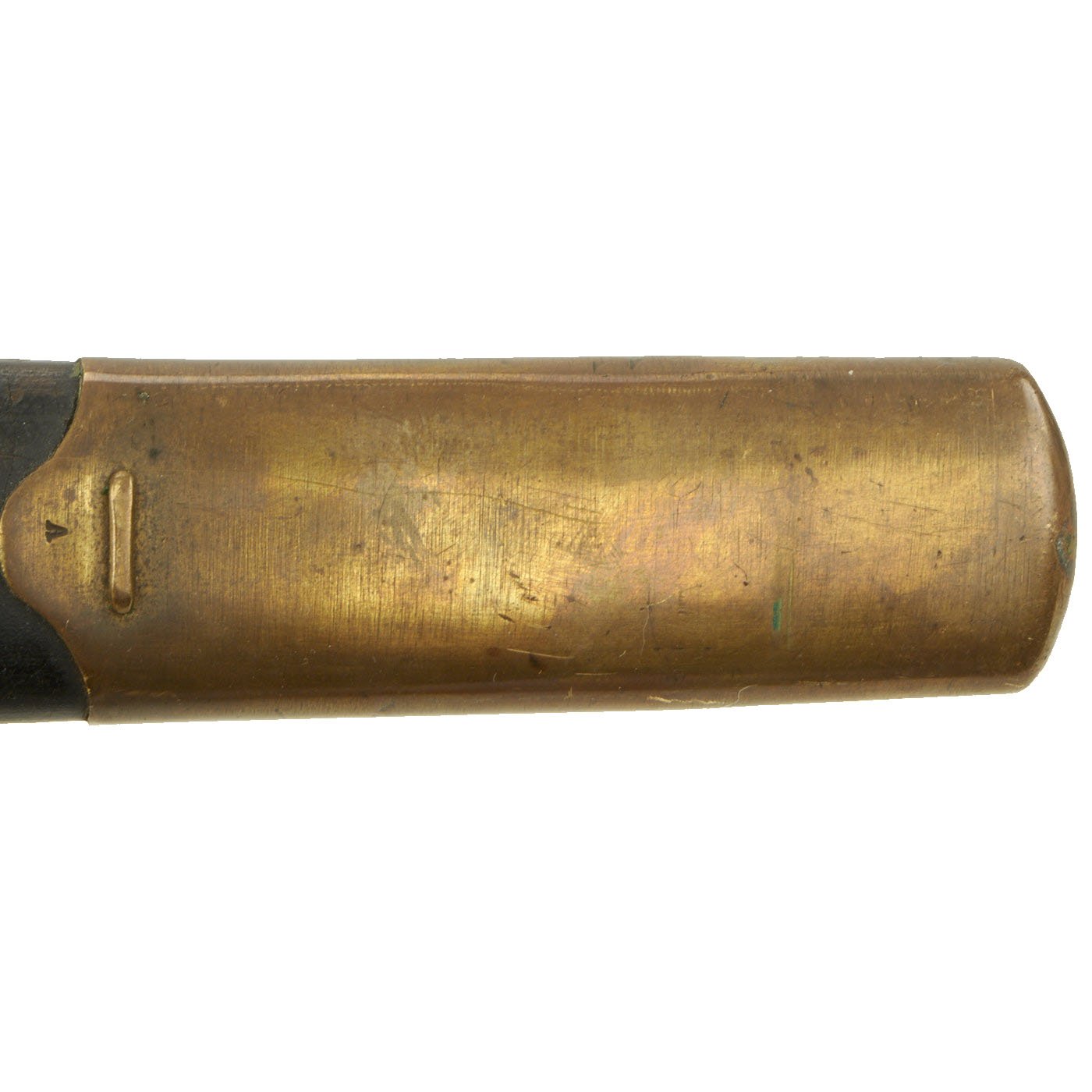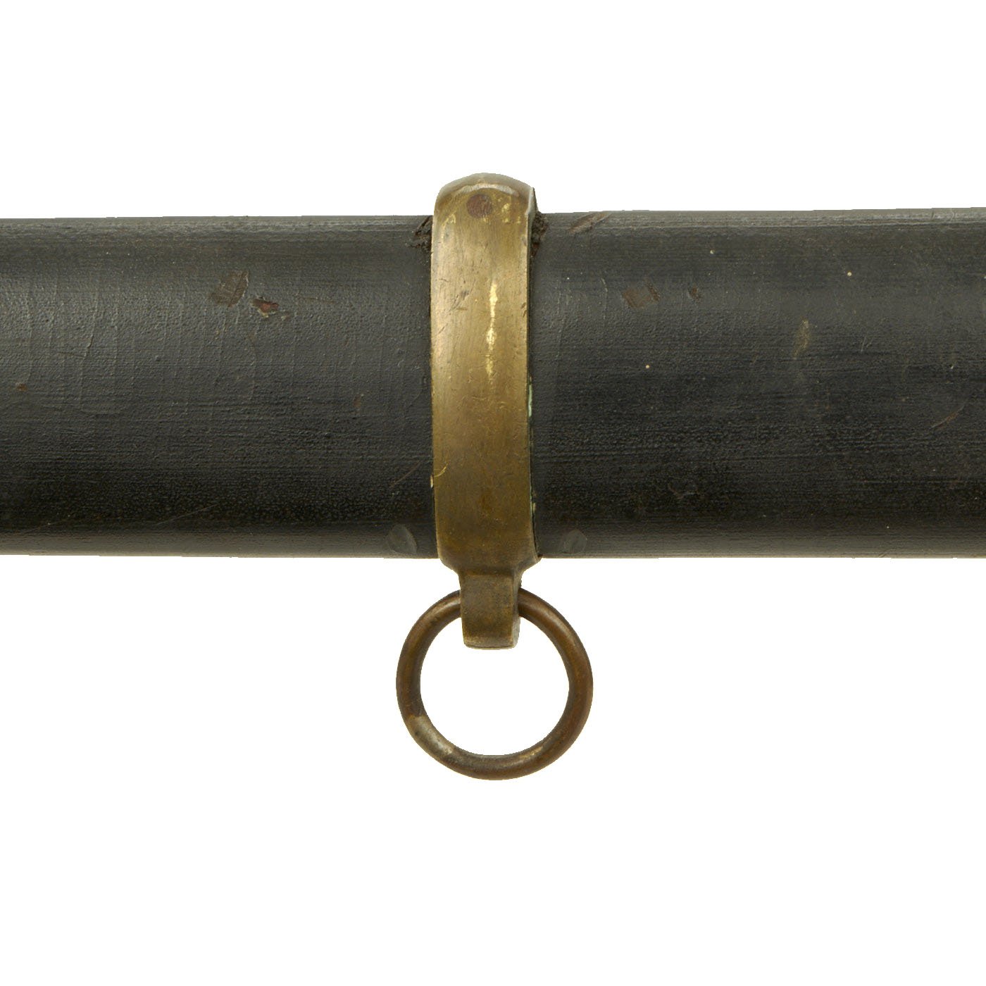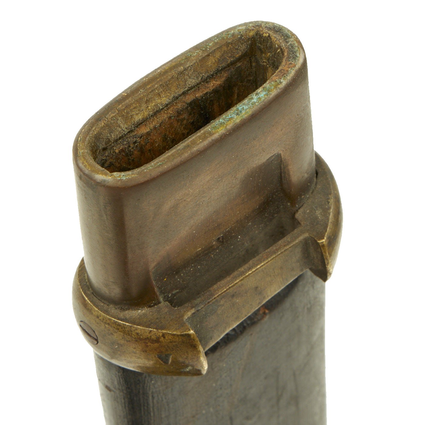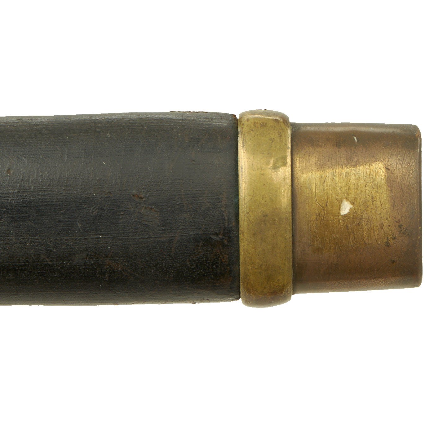 The Included scabbard is the correct leather covered wood, with intact brass fittings. Some scabbards were also outfitted to hold a Mosin-Nagant bayonet, however this one is not. The condition is very good, with almost all of the leather and finish intact. There is just a bit of chipping on the top about 10 inches from the end. These were worn edge up, so often the top of the scabbard would see more wear and denting than the bottom.