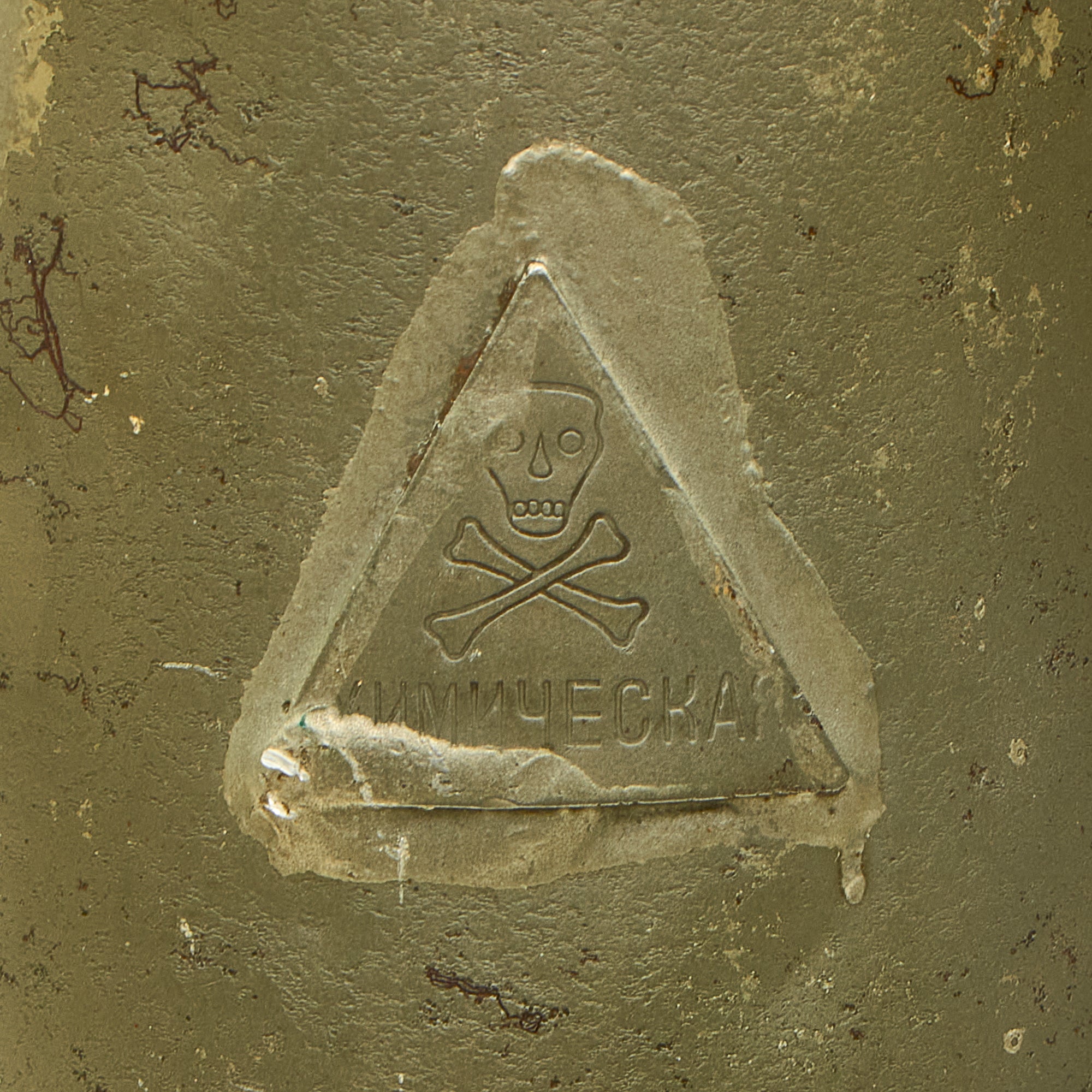 The M1917 is a modified and larger M1914 that expels chemical gas when it "detonates". The primary chemical agent in this grenade is 500g of Chloropicrin, which is an irritant. The M1917 can be told apart from the M1914 because it is larger than the M1914 and has a skull and crossbones on it with the Russian word for chemical underneath the image which is still present on this example.