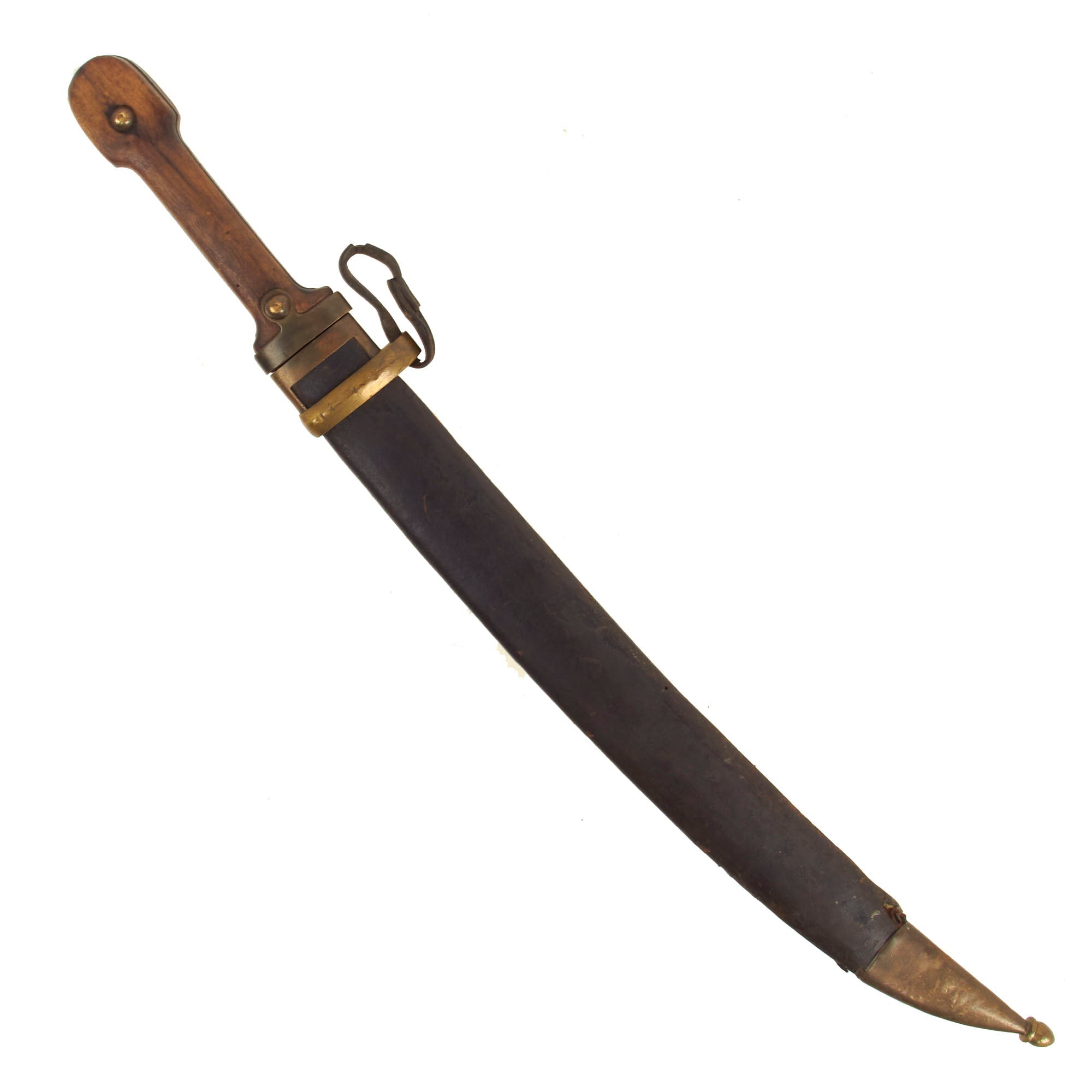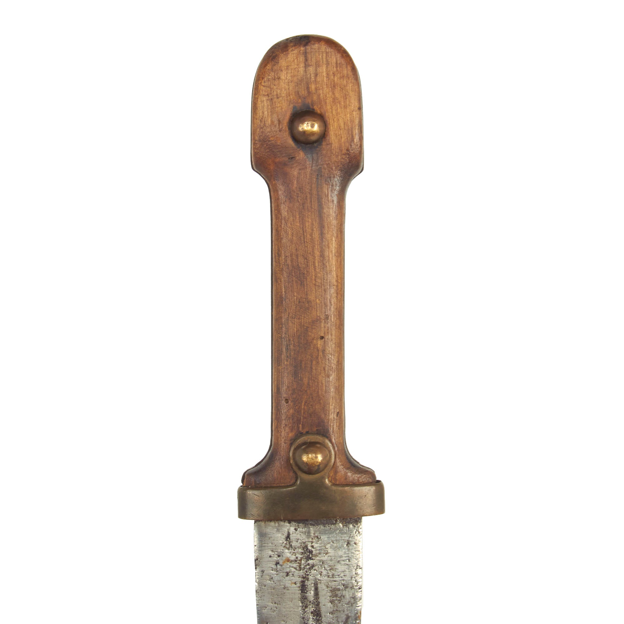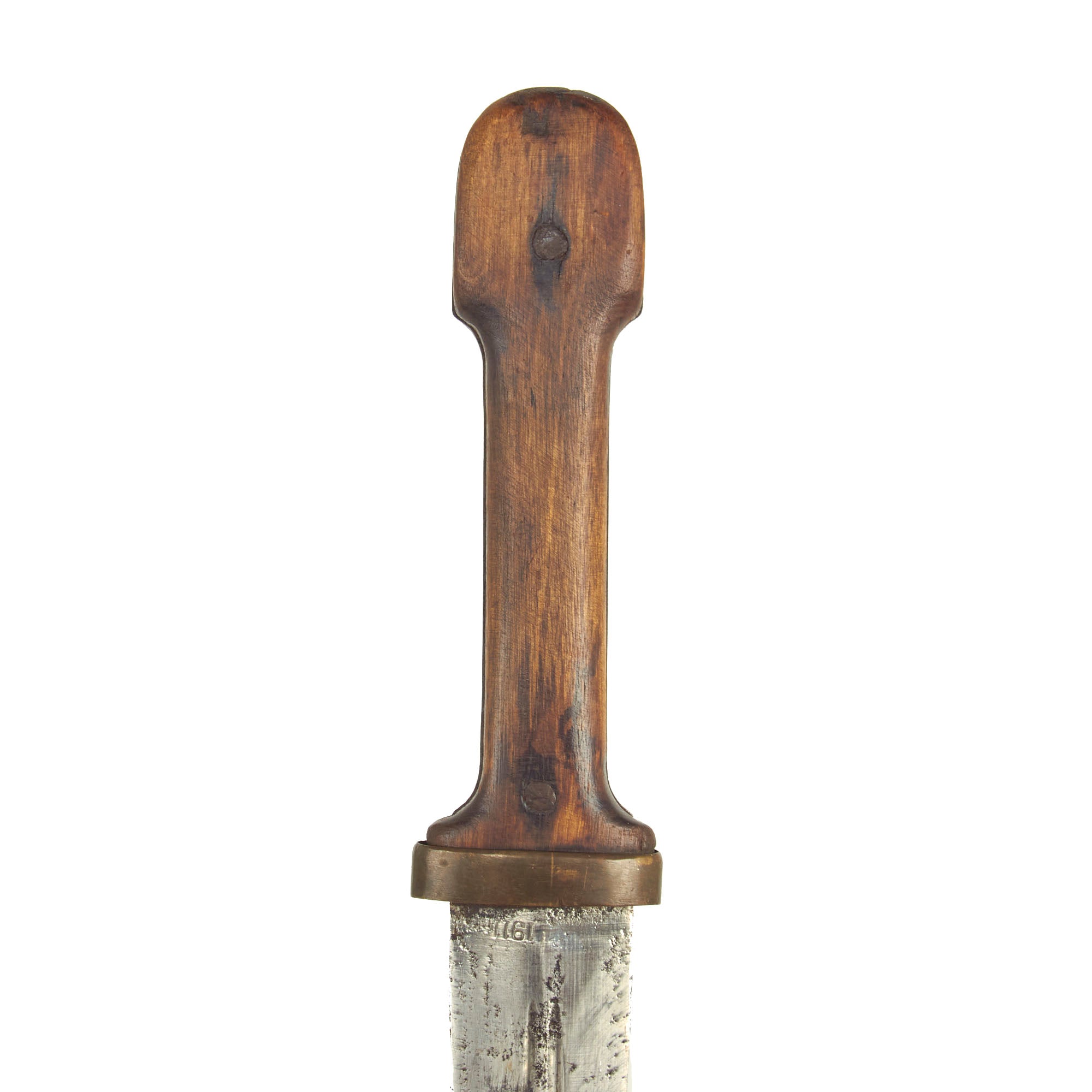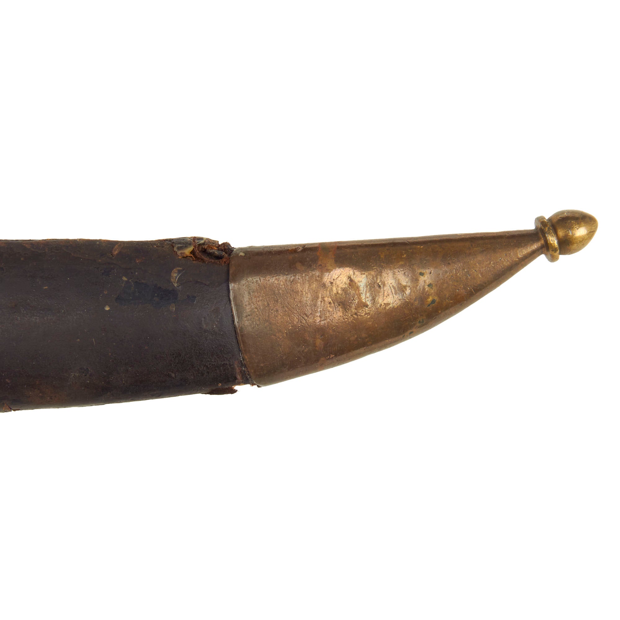 It was produced before the outbreak of WWI, so it almost certainly saw service during the conflict, and possibly afterwards. The grip is the standard wood with brass fittings, secured with two large dome headed rivets, which is the traditional design. The original finish has worn away for the most part, indicating long service. The included brass fitted wooden scabbard is in good condition, without a small leather belt loop