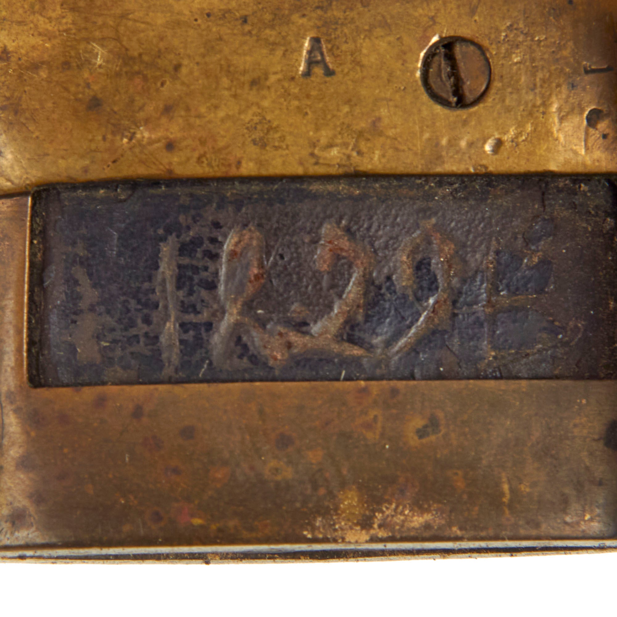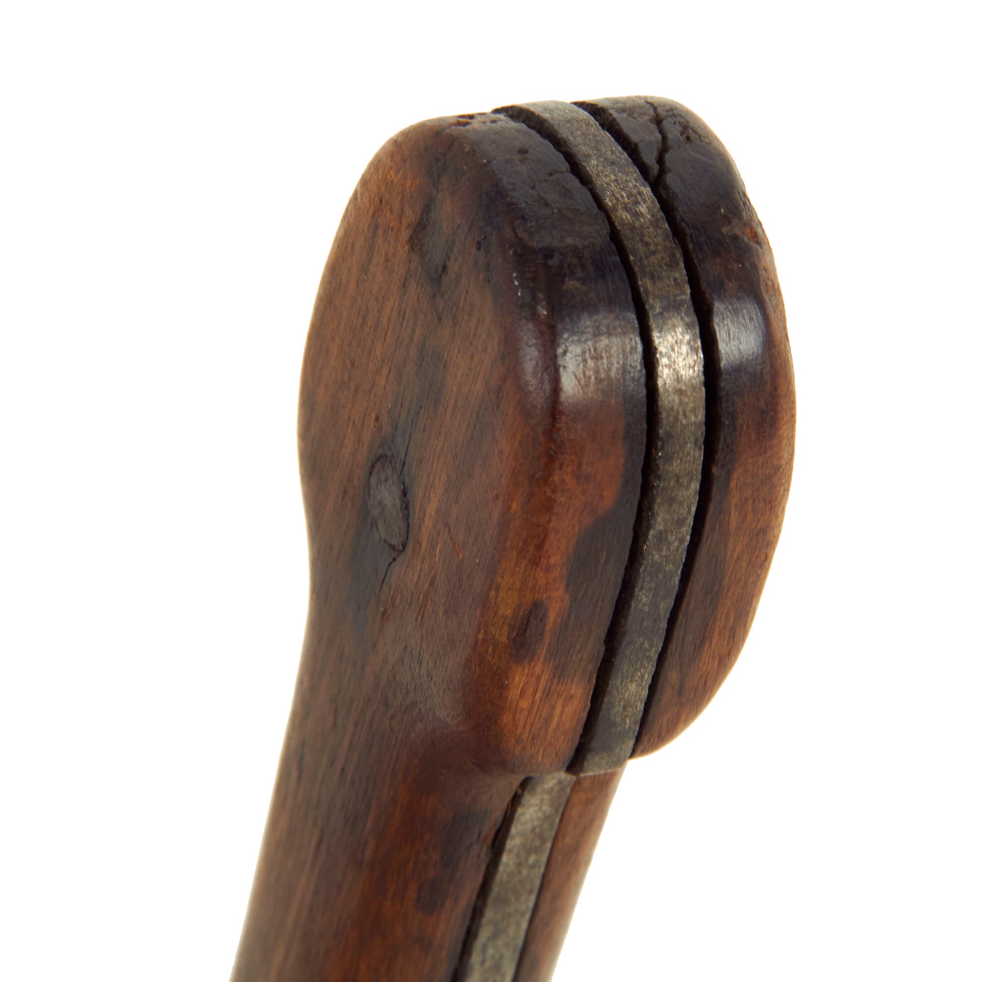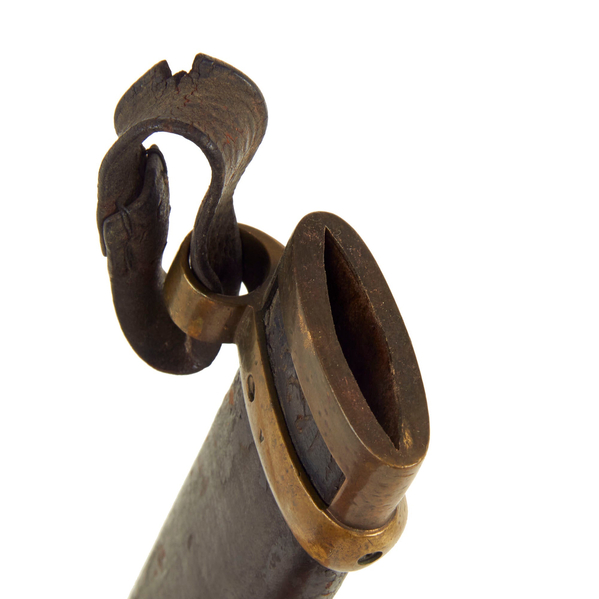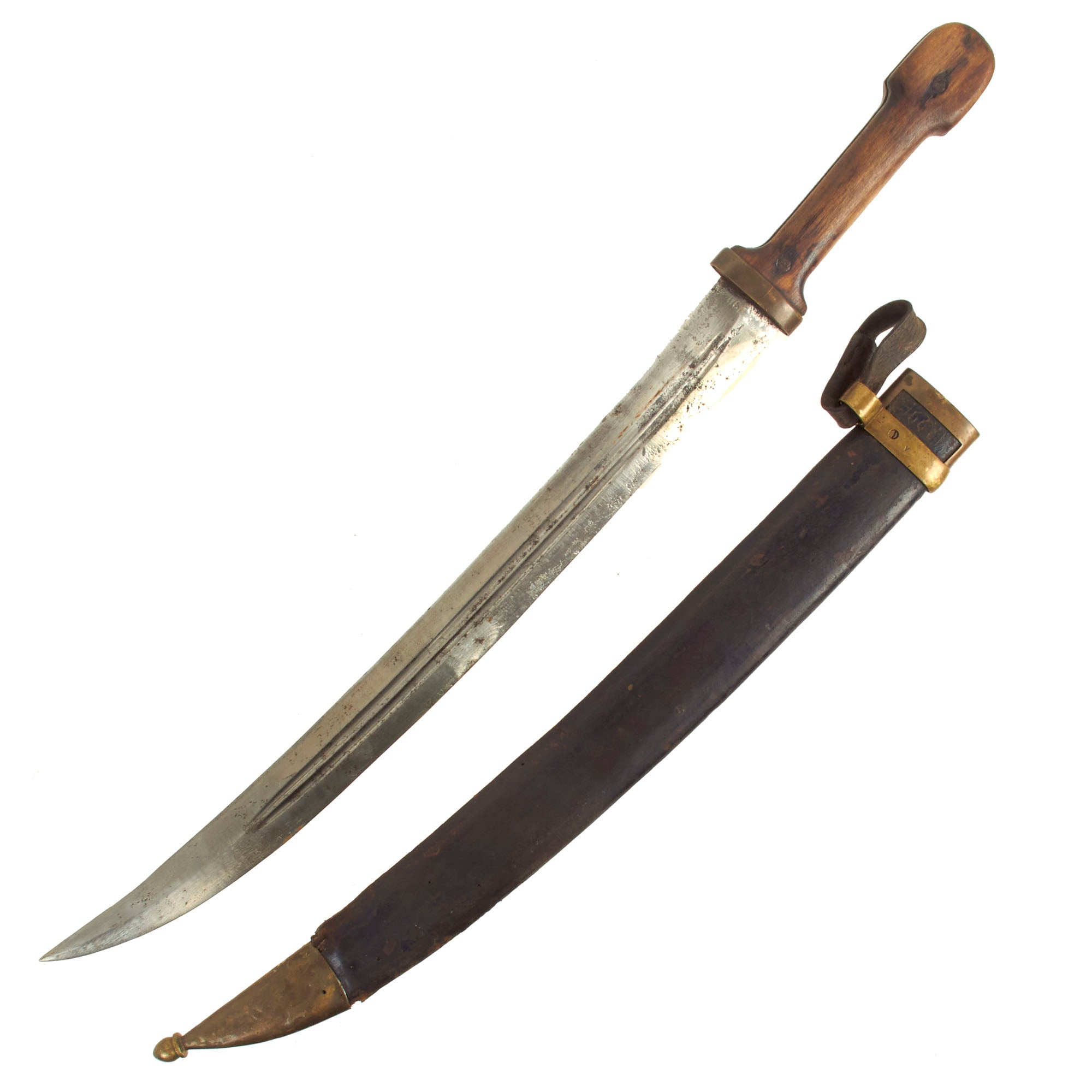 It was produced before the outbreak of WWI, so it almost certainly saw service during the conflict, and possibly afterwards. The grip is the standard wood with brass fittings, secured with two large dome headed rivets, which is the traditional design. The original finish has worn away for the most part, indicating long service. The included brass fitted wooden scabbard is in good condition, without a small leather belt loop