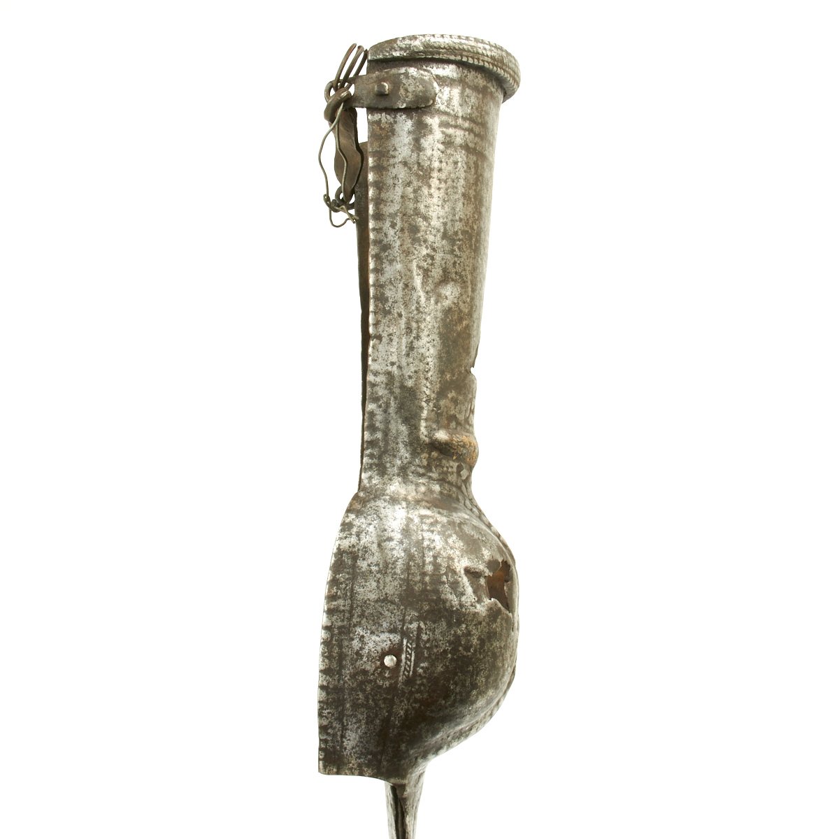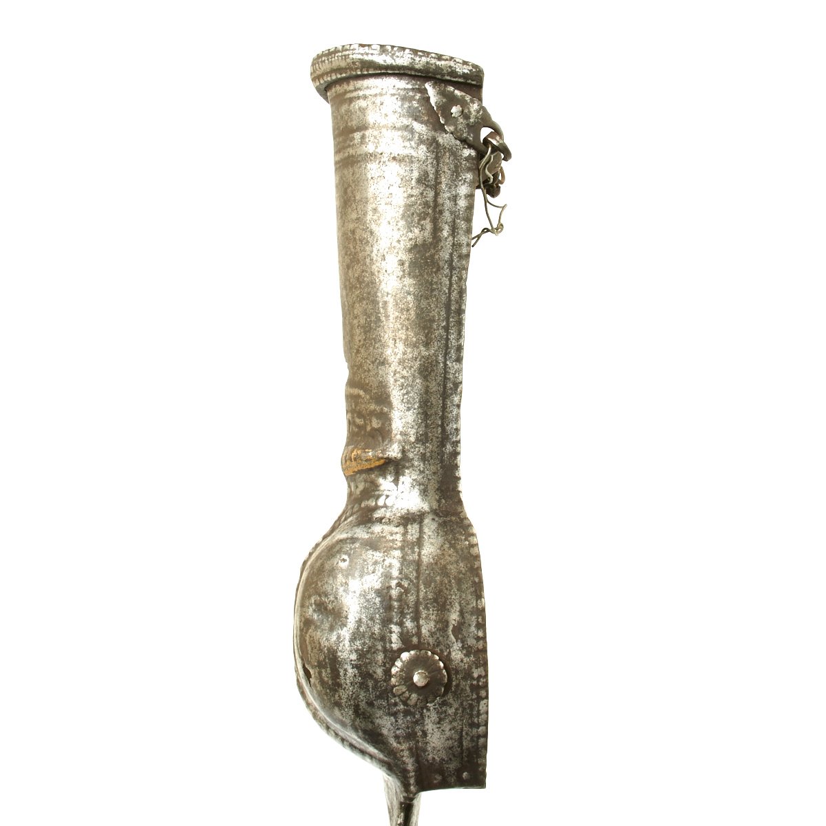 Our example is very old and originates from a Museum Collection in Europe, it shows much use and honest wear from it's possible 4-500 years of age. The armored gauntlet decorated with embossed designs and also shows sign of some old gold embellishments mostly worn away.