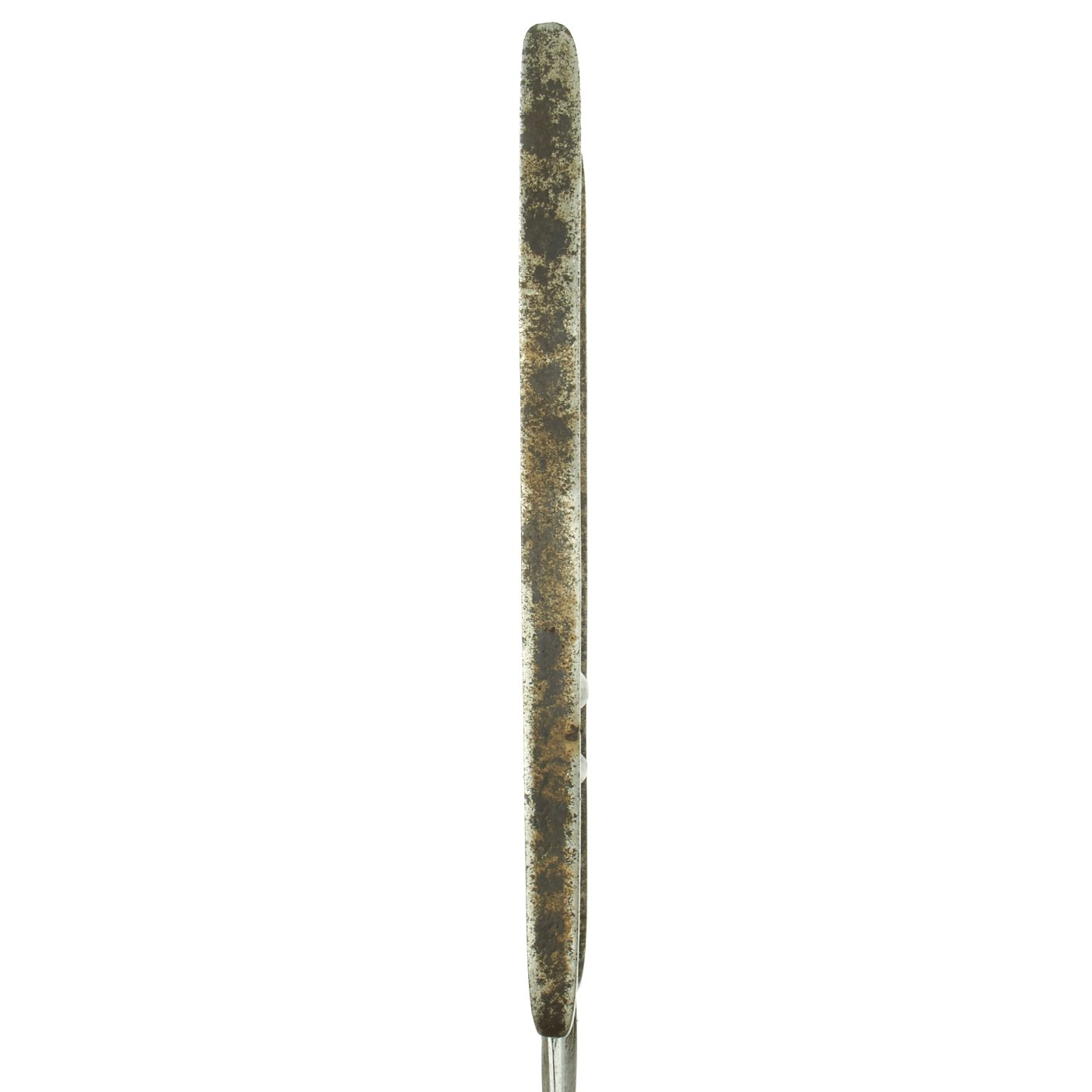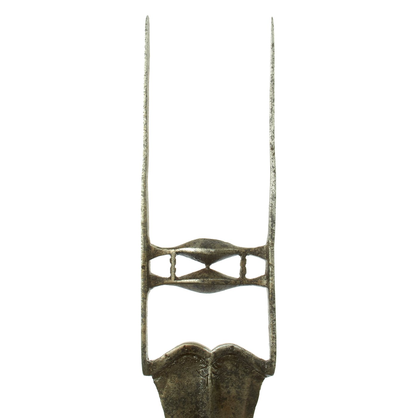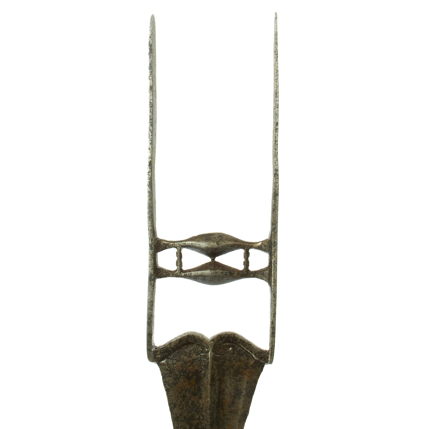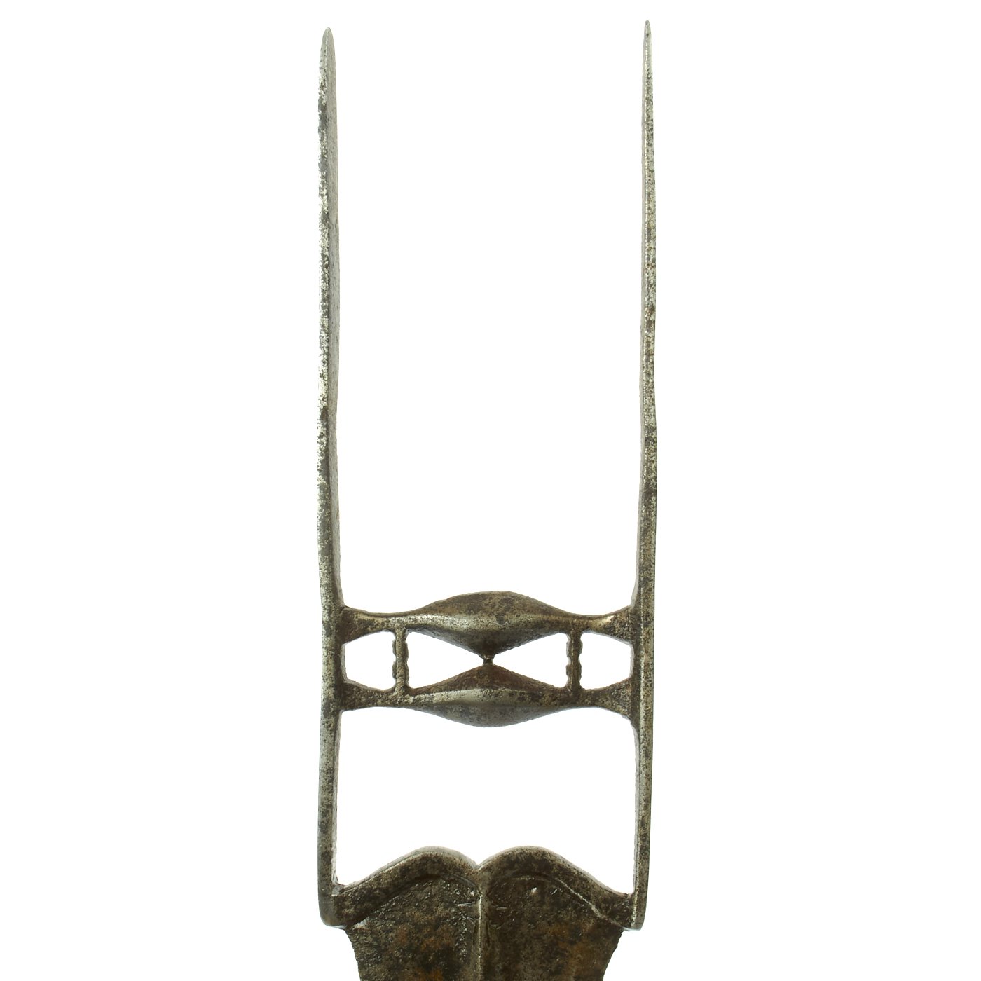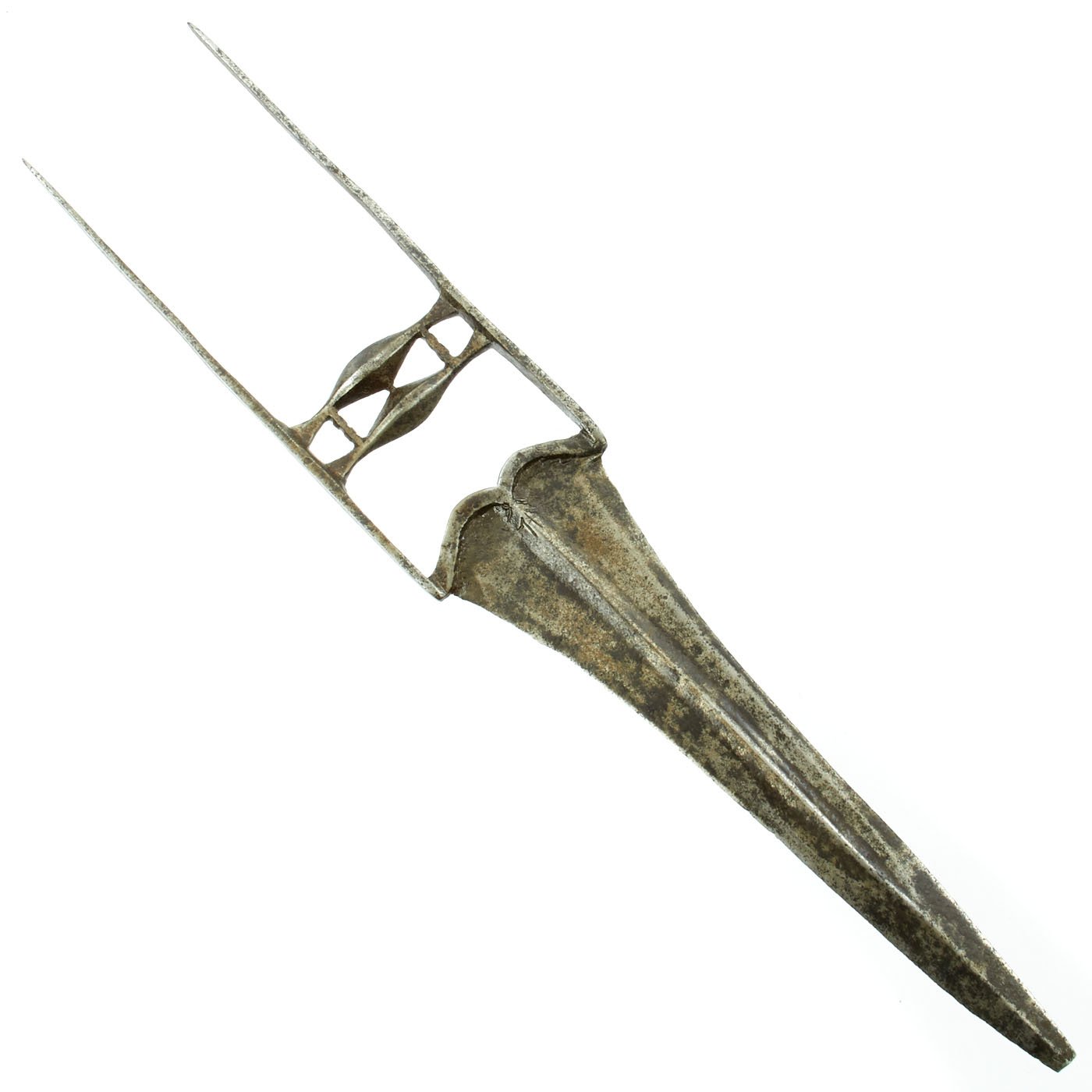 The weapon is of forged iron construction, with a rather strange design for a hilt. Intended to be grasped by the two horizontal cross bars, the long uprights naturally extended up your arm. It was then bound in place and securely held so your arm became a trusting weapon. The long upright protected you arm from any sword blade attack, and there was no way for the warrior to drop the weapon once in place.