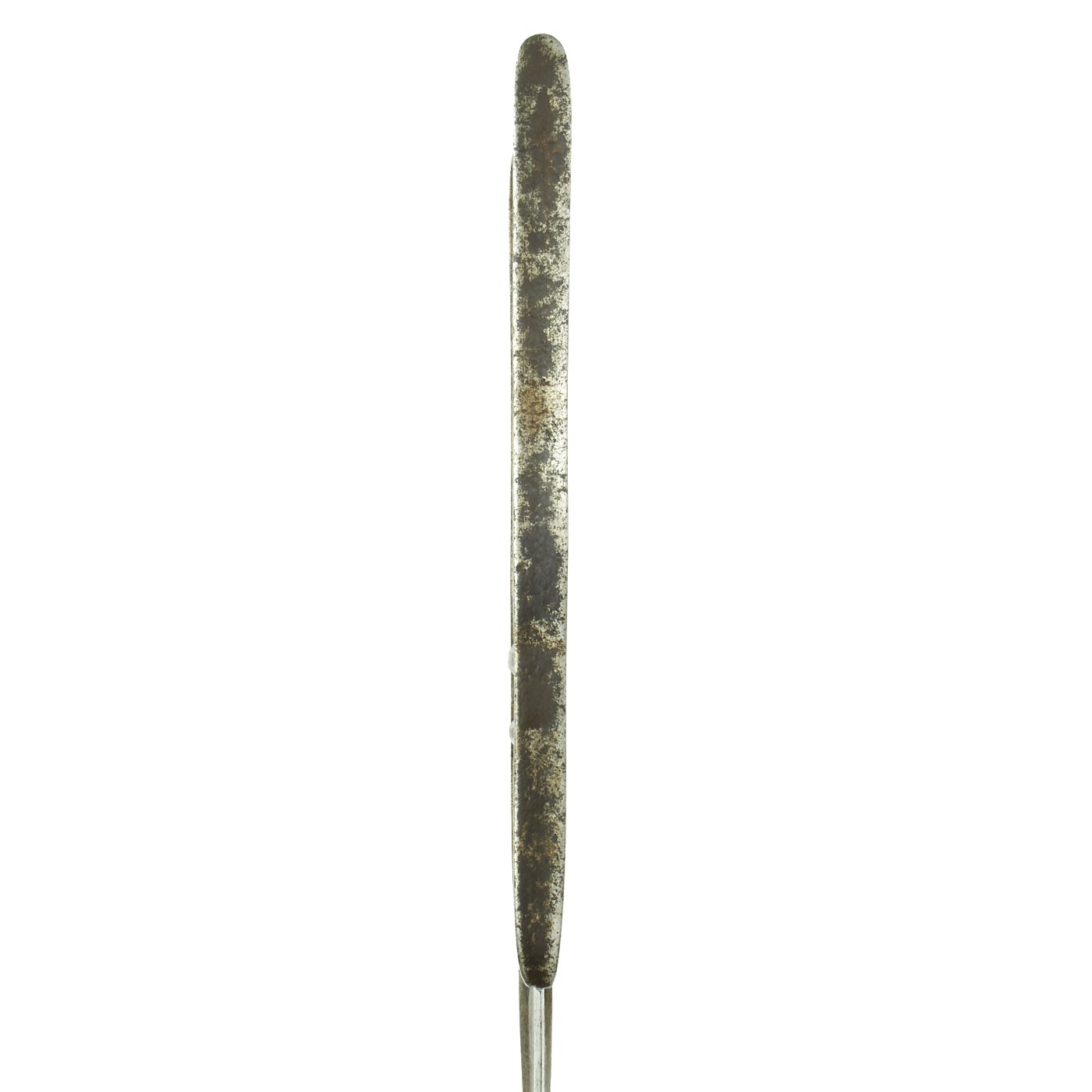 Original Item: Only One Available. The katar is definitely an odd looking weapon, however it was very effective against Chain Mail and even much plate armor found in India at the time. The tip of the blade is somewhat thickened to give it the strength to penetrate the sturdiest body defense. Our example has had the blade tip damaged, no doubt in combat. It measures 17 inches overall, with a 9 1/2 inch double edged blade.