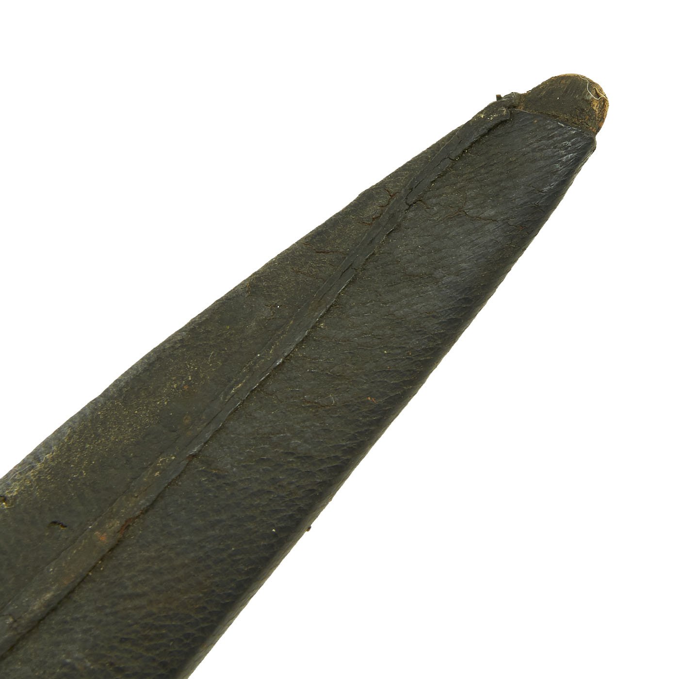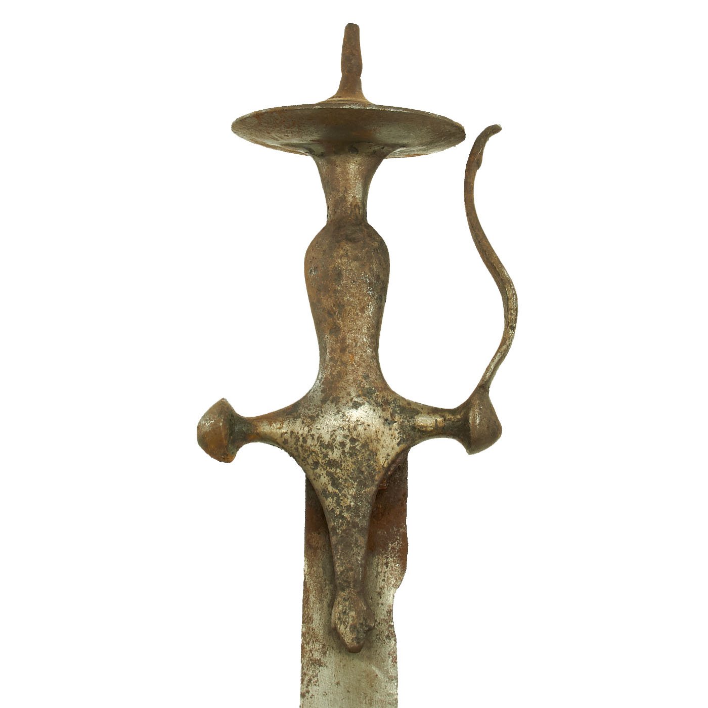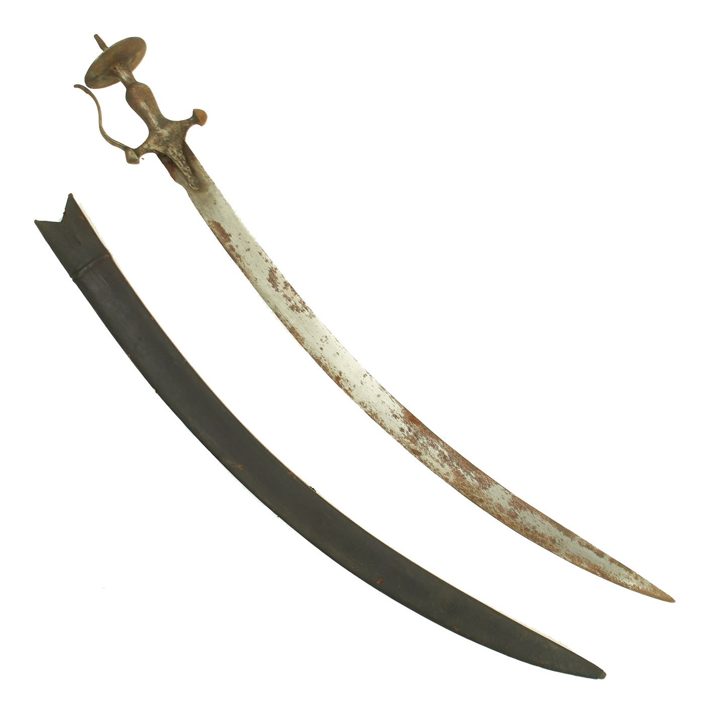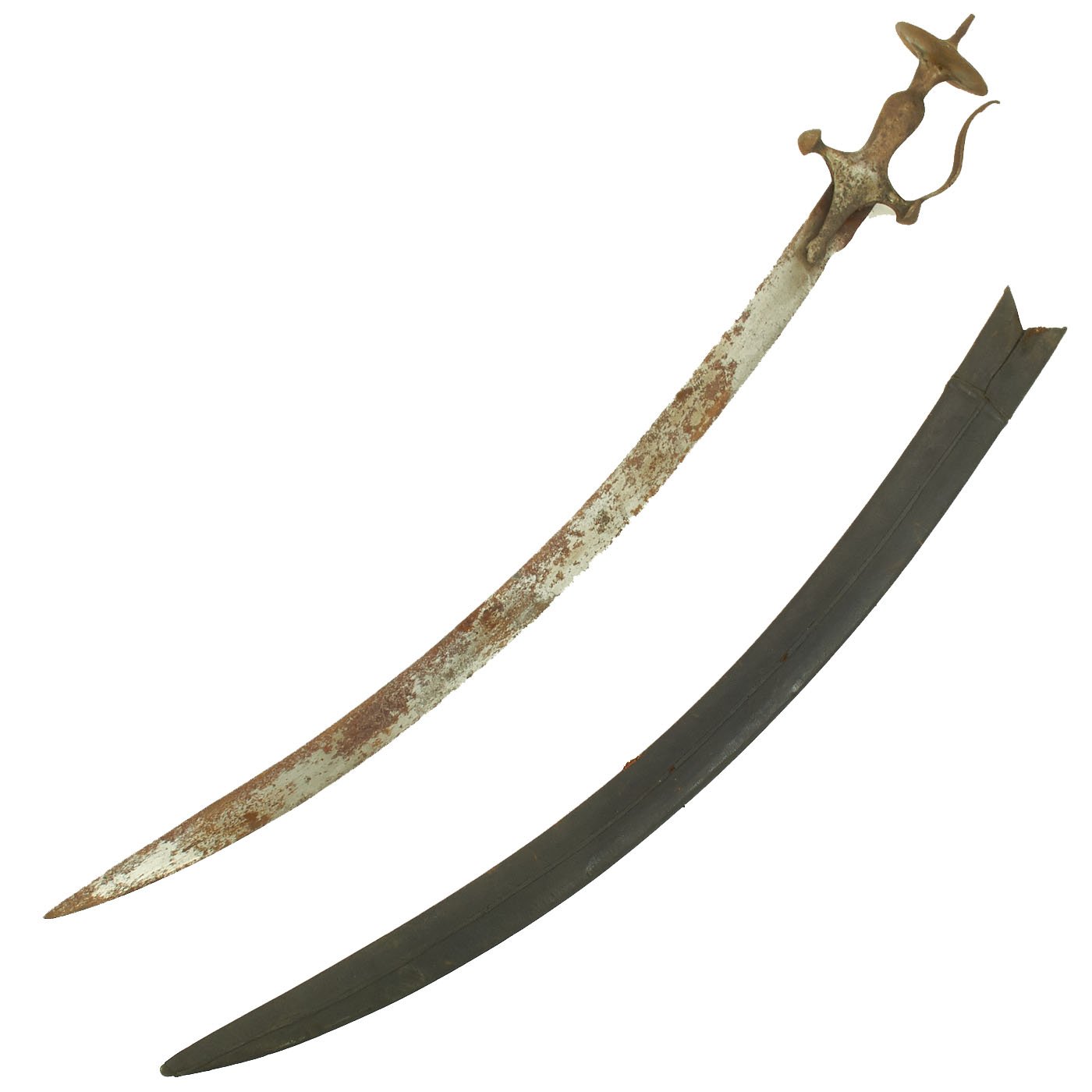 This fine example measures 35" in overall length and is fitted with a very curved blade of 28 1/2" which is substantially made. The edge is still relatively sharp, though there is some oxidation and wear.