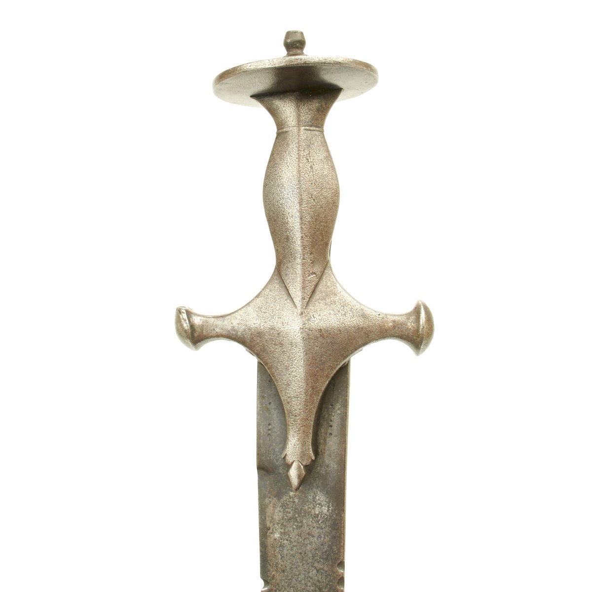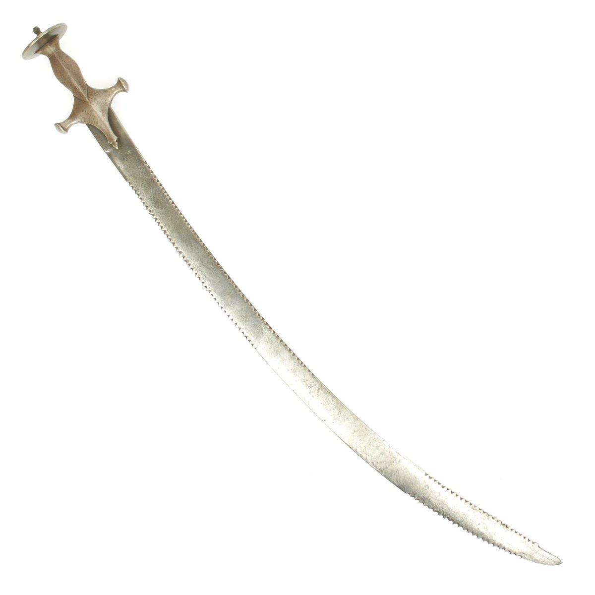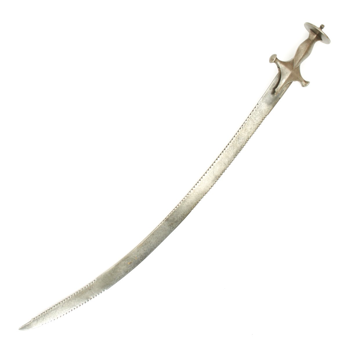 Original Item. Only One Available. Measuring 34" inches overall with a 29" SERRATED blade. Cut with teeth on top and bottom 7" toward the point and a further 12" at the upper rear. Designed to do terrible damage upon any enemy these swords were in wide use all over India from the very late 17th Century up until the end of the reign of Queen Victoria in 1901. Before the adoption of the circular disc hilted Tulwar swords the Indians used what we call "FIRANGI" swords mostly using European blades supplied as "used" surplus by the Portuguese traders in Goa.