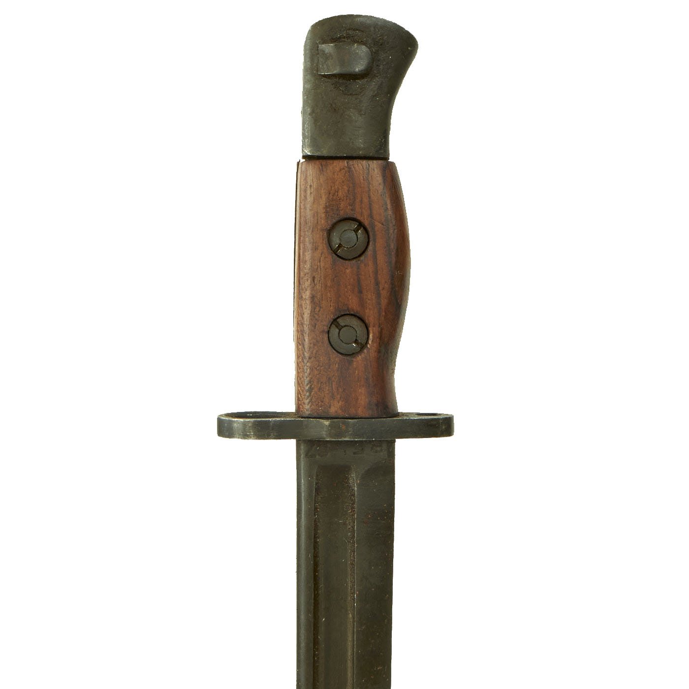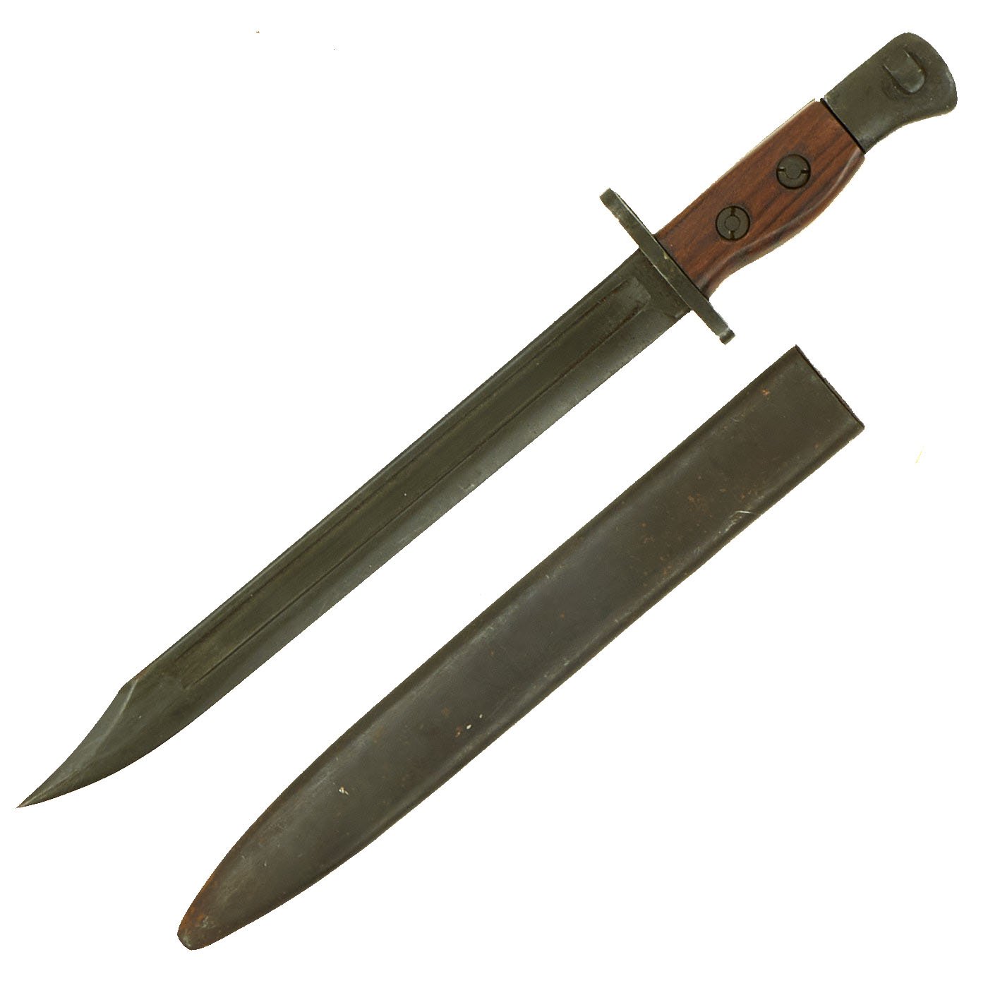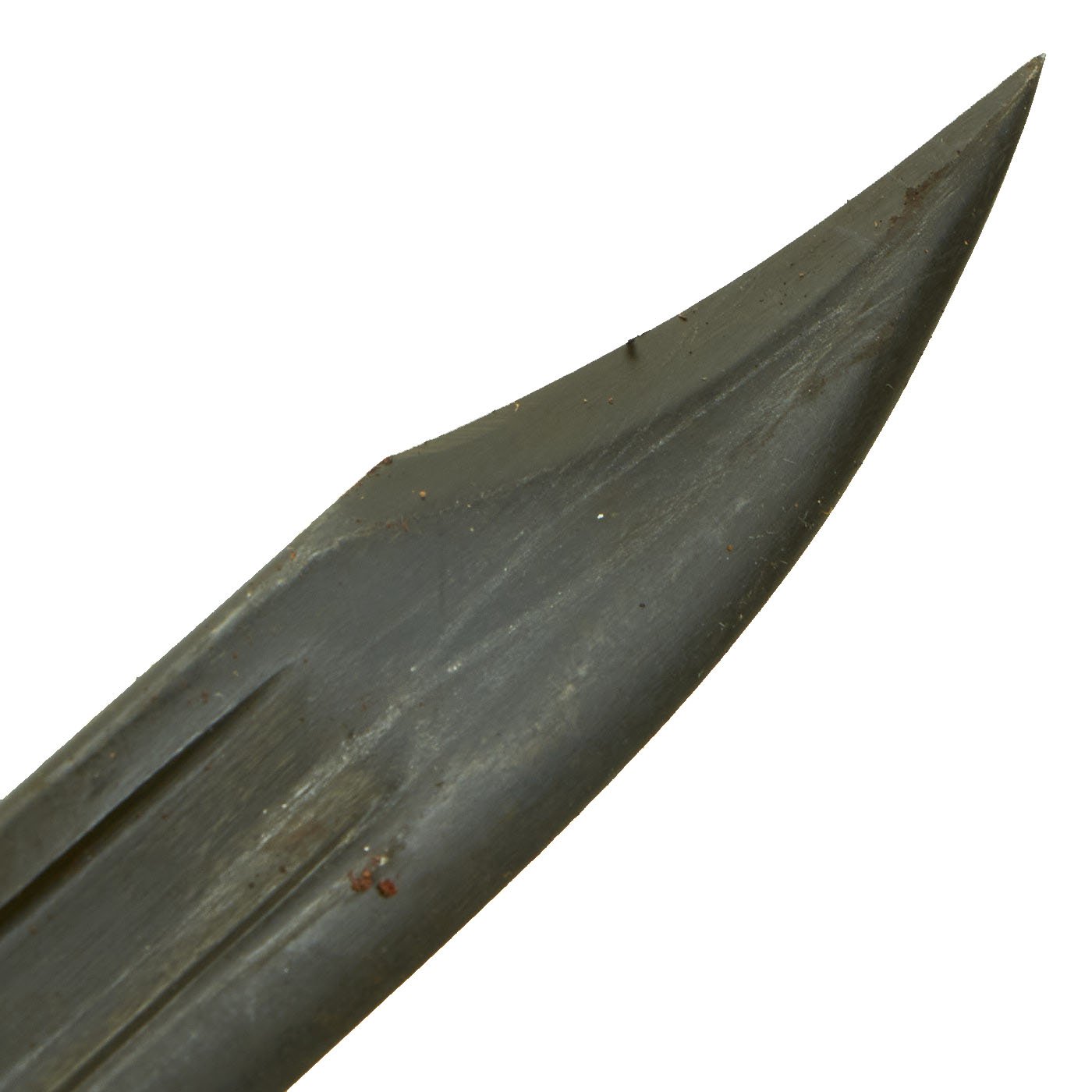 The bayonet has a 10 inch "bowie" style clip-point blade, with a wide fuller running down each side, with an overall length of about 14 inches. Unlike most bayonets, the wooden grip scales wrap completely around the tang. Comes complete with a rare correct scabbard.
