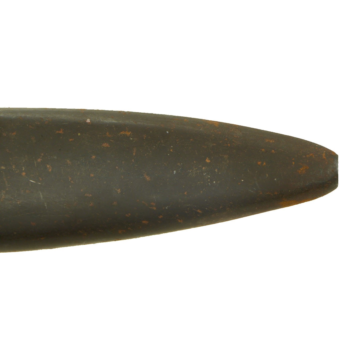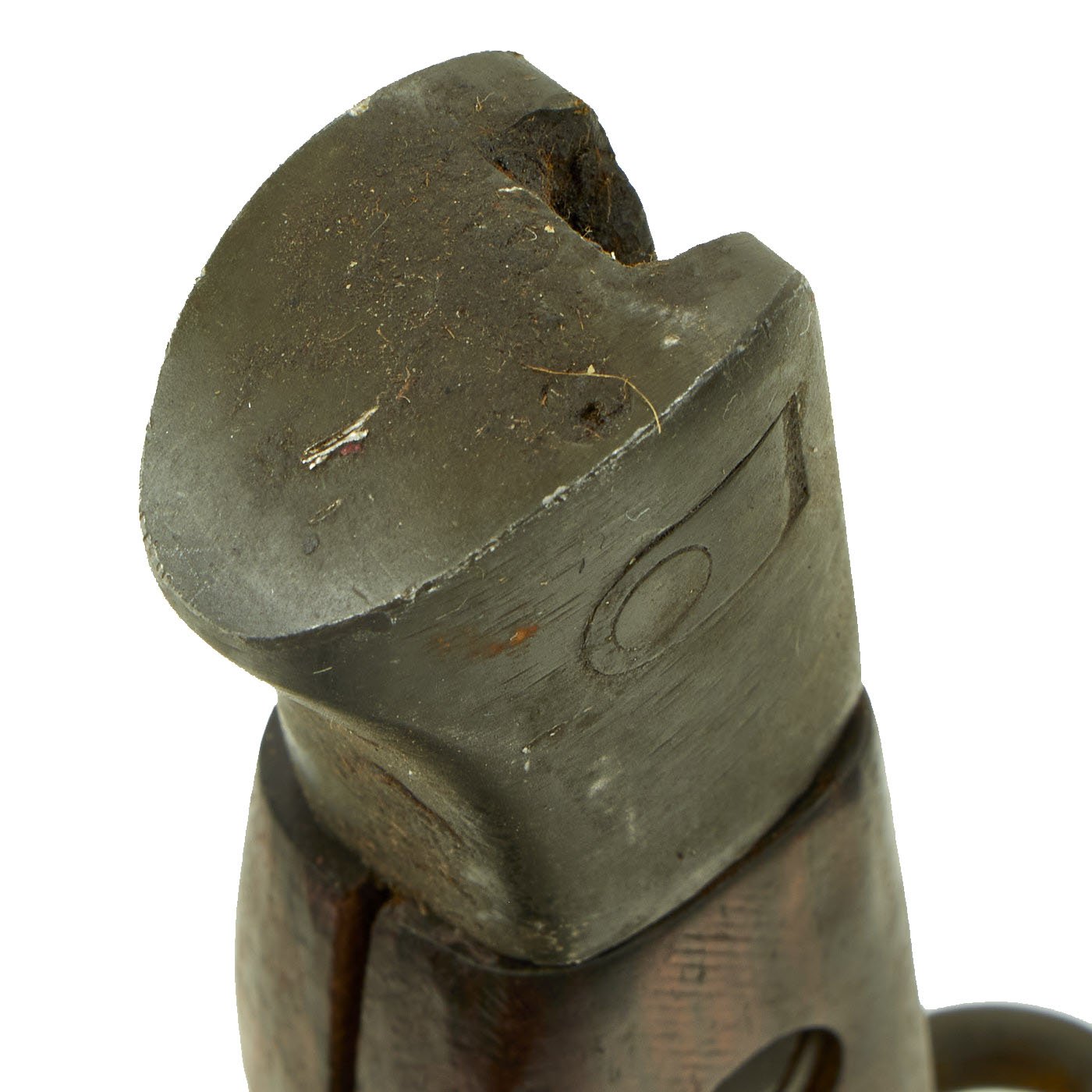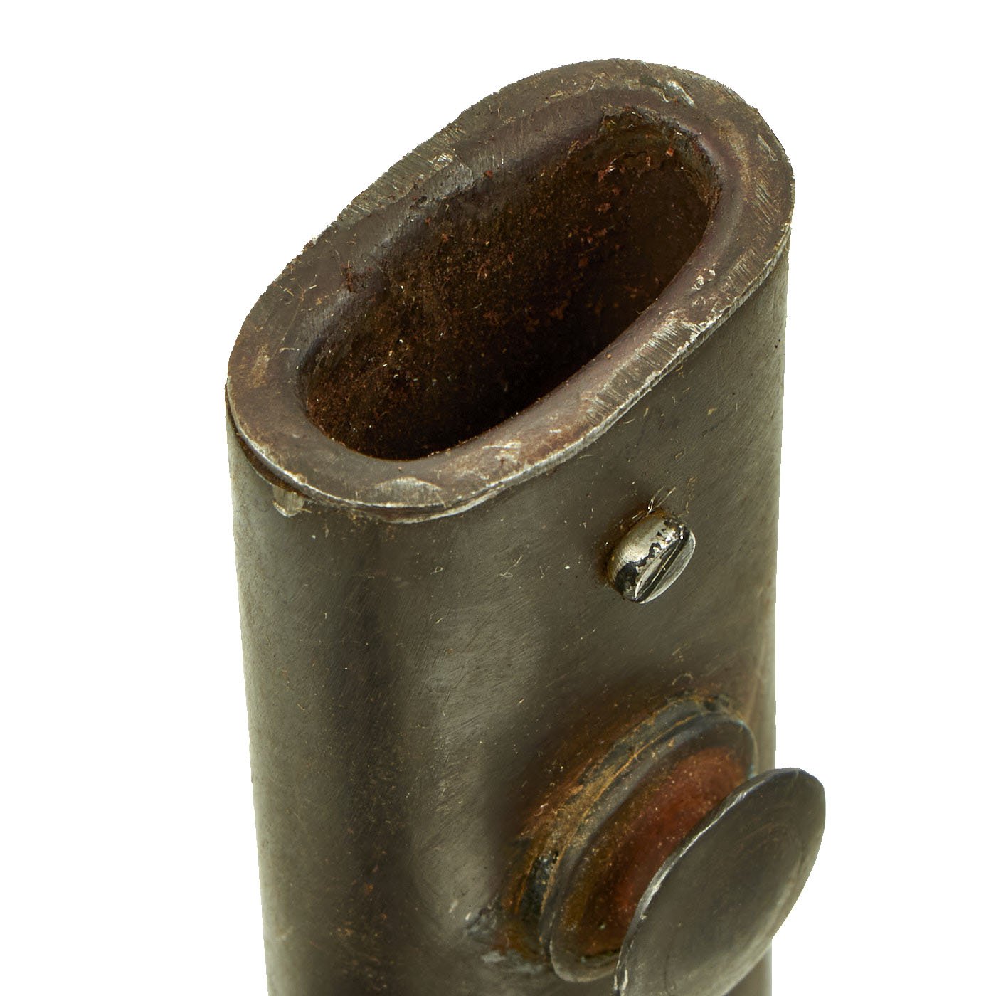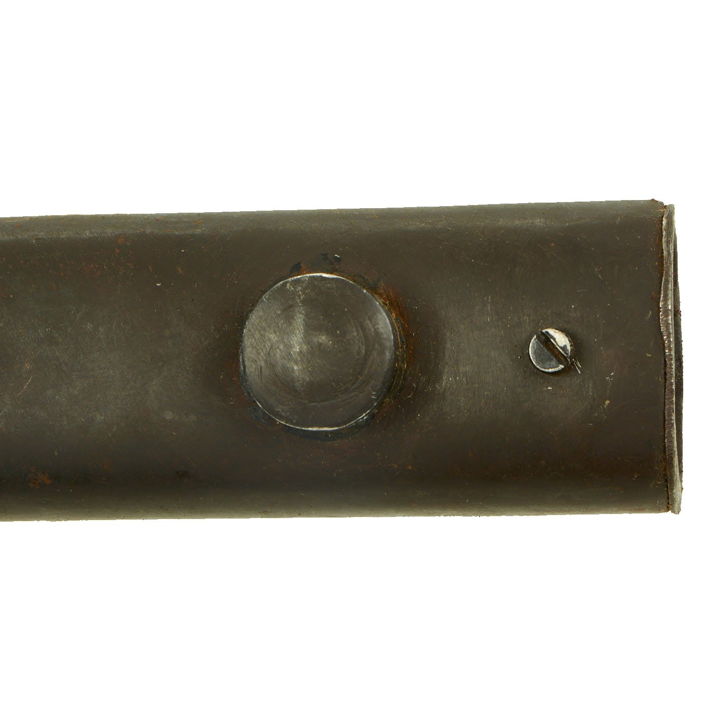 The bayonet has a 10 inch "bowie" style clip-point blade, with a wide fuller running down each side, with an overall length of about 14 inches. Unlike most bayonets, the wooden grip scales wrap completely around the tang. Comes complete with a rare correct scabbard.
