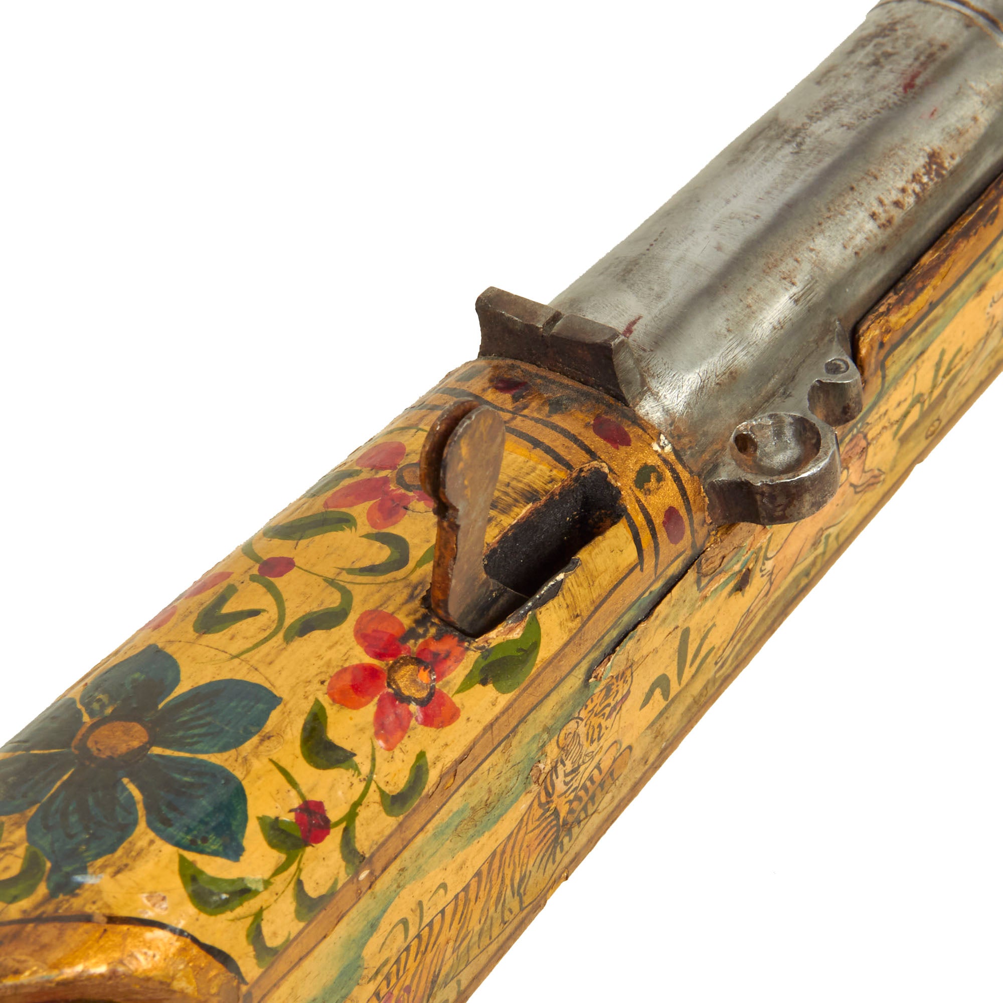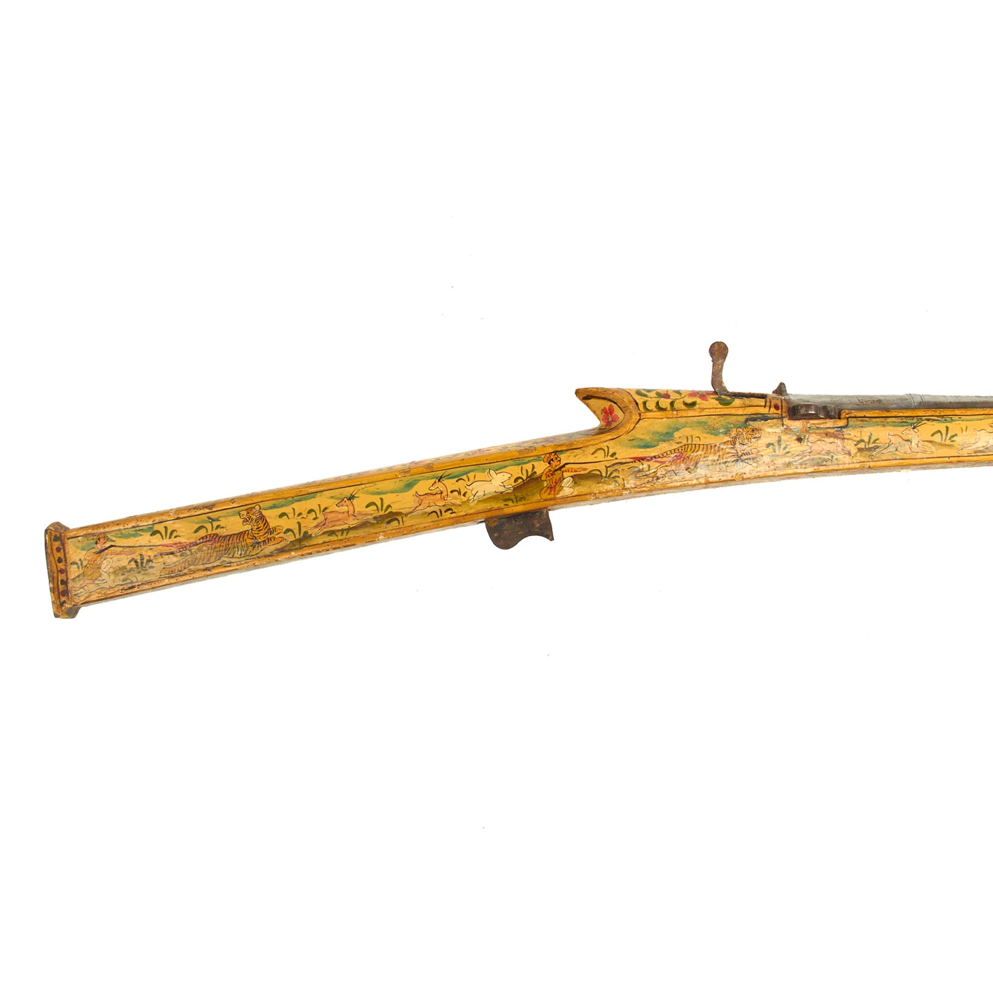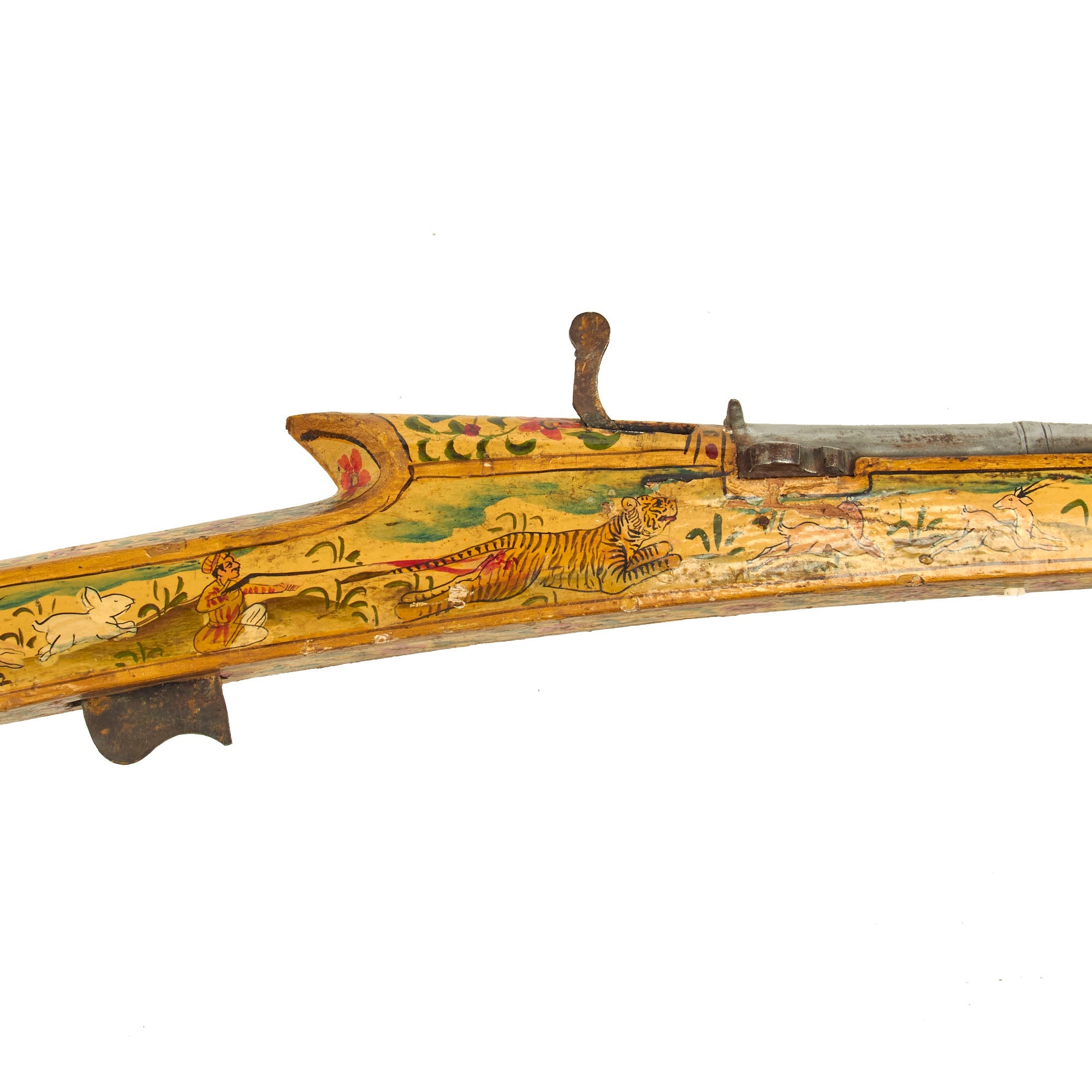 Original Item: One of a Kind. This is extraordinary, a fantastic Indian matchlock "TORADOR" musket, hand painted top to bottom with Tiger hunting scenes and other ornate designs. This almost certainly came from JODHPUR or JAIPUR, both legendary cities of the Rajasthan region of India. The name literally means “Land of Kings”, and this region in Northern India is full of magnificent palaces and other ornate locations, such as the Amber / Amer Fort (Palace) outside of Jaipur.