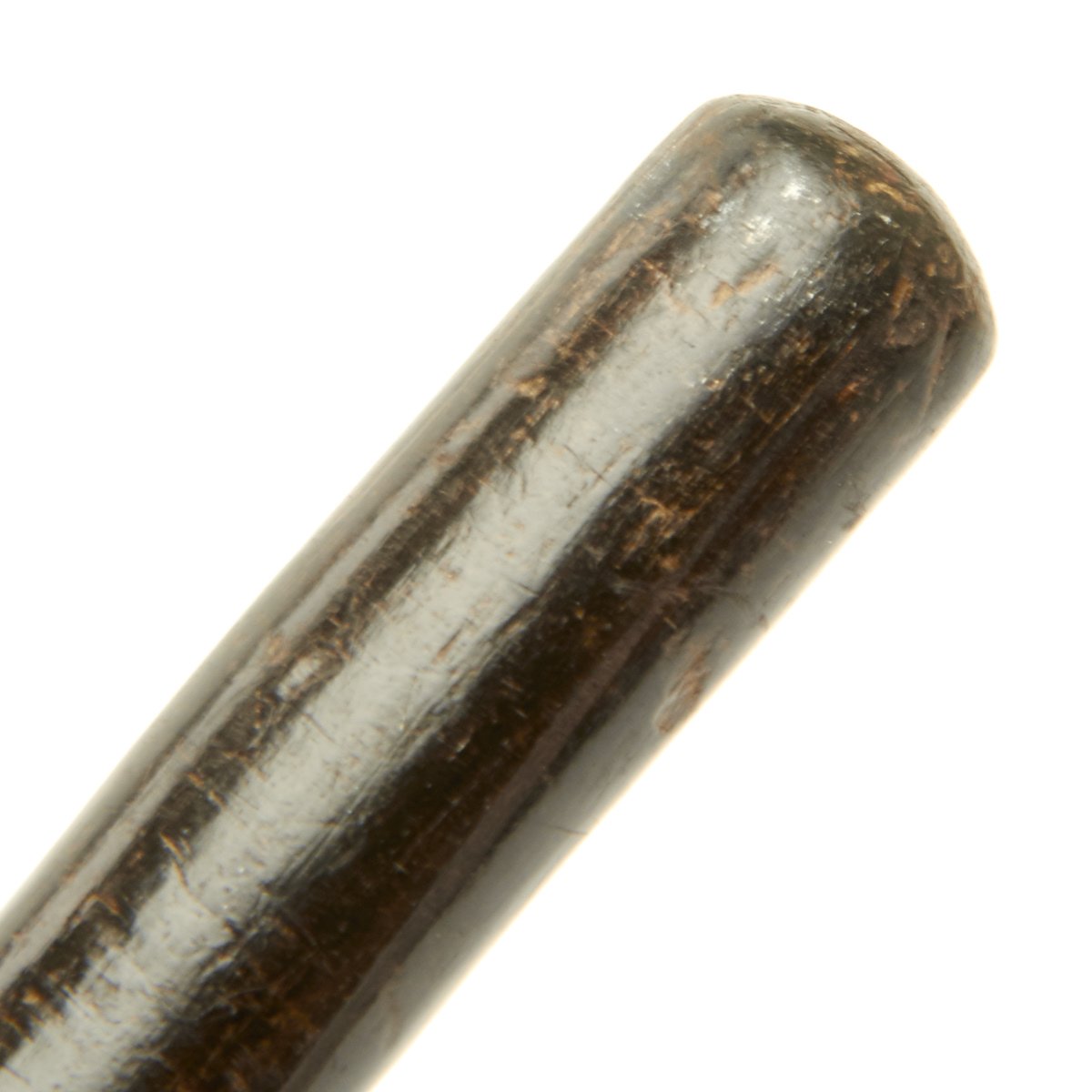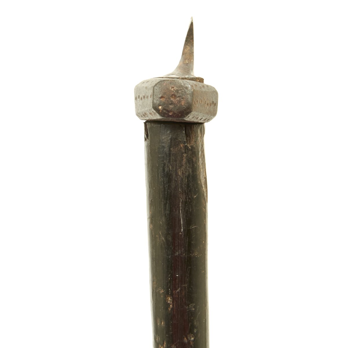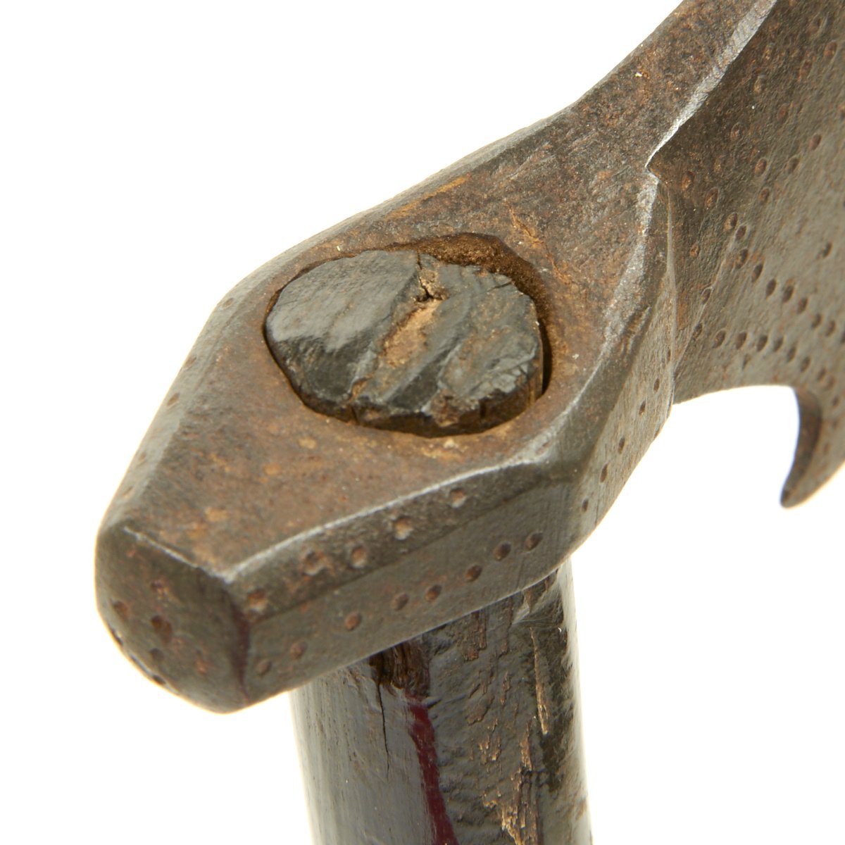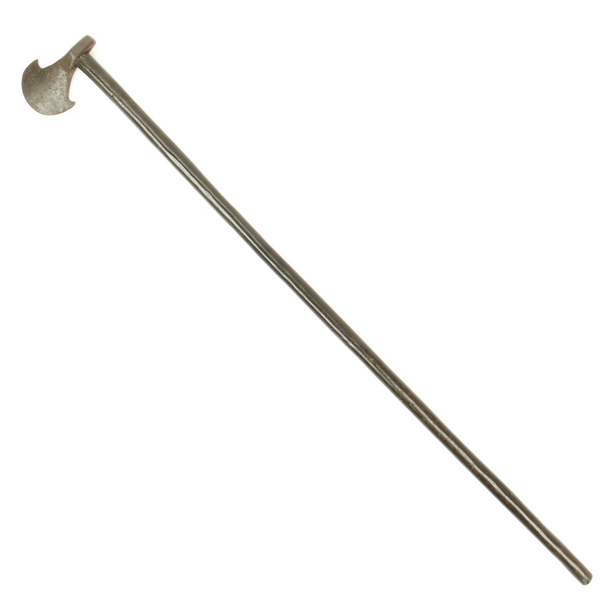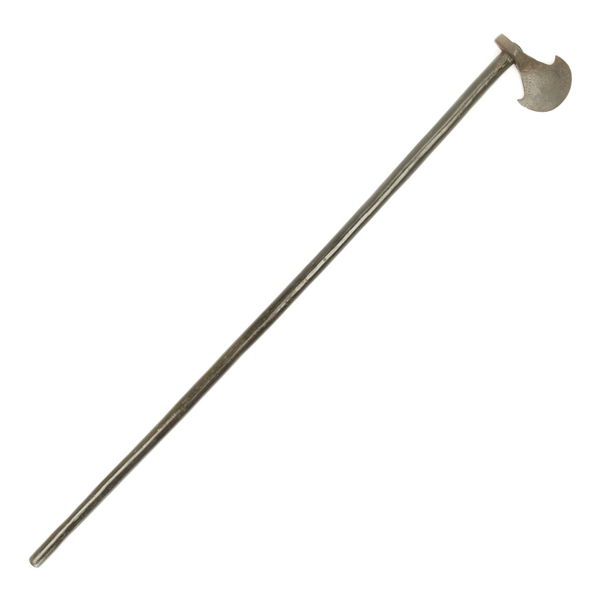 Surprisingly small, the sparcely decorated iron head on this example measures 4" X 2 1/2" with a an almost semicircular cutting edge, the rear in the shape of hammer. Supported on a wood haft almost 30" long, its merit was the reach it permitted the horseman to attain when taking a very precise and accurate blow. Not often encountered from a period of history when hand to hand mounted combat was the style in which warfare was conducted. Ready to Display.