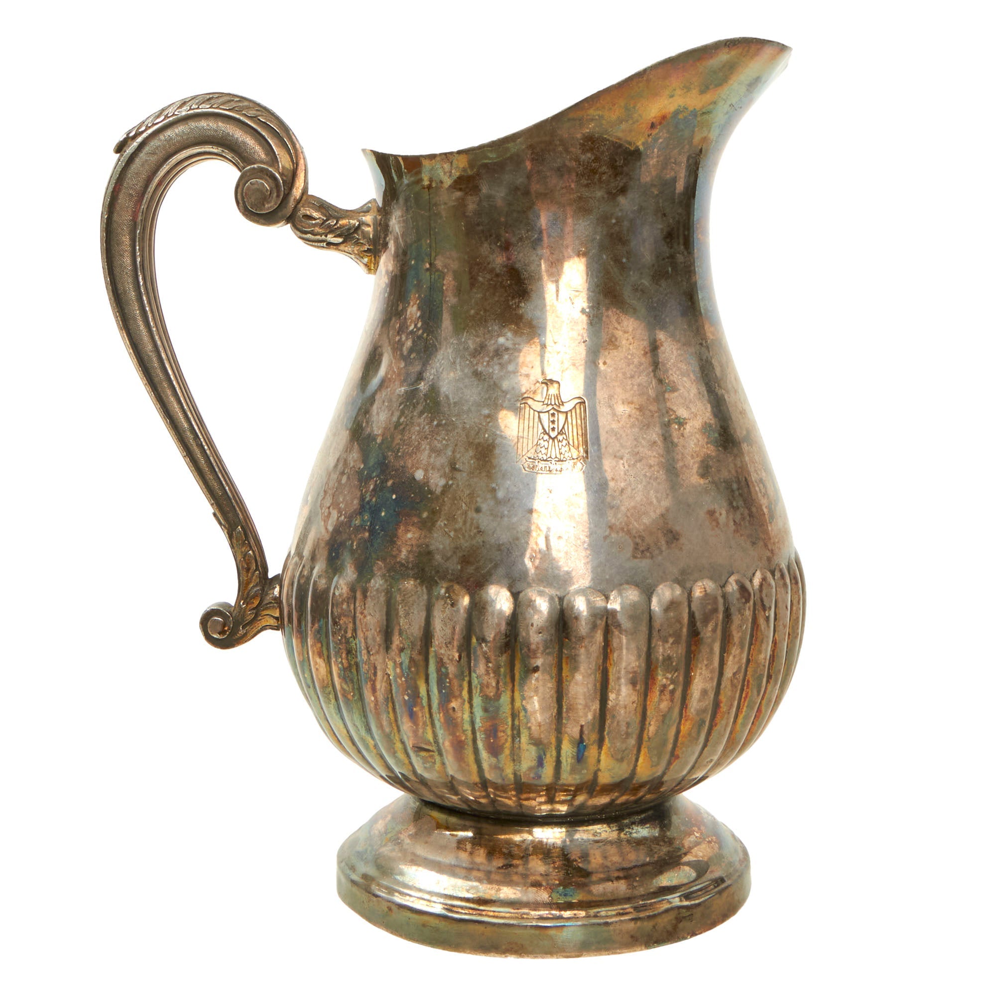 The right side of the pitcher features a beautiful roll-stamped Iraq Coat of Arms that was used from 1965 to 1991. Roll Stamping is similar to Impression Marking, but involves a flat die and a round part. The flat die is pressed into the round part as it rolls across the periphery. Rolling a die over a part creates less stress since all of the pressure is not being applied to the marking area at the same time.