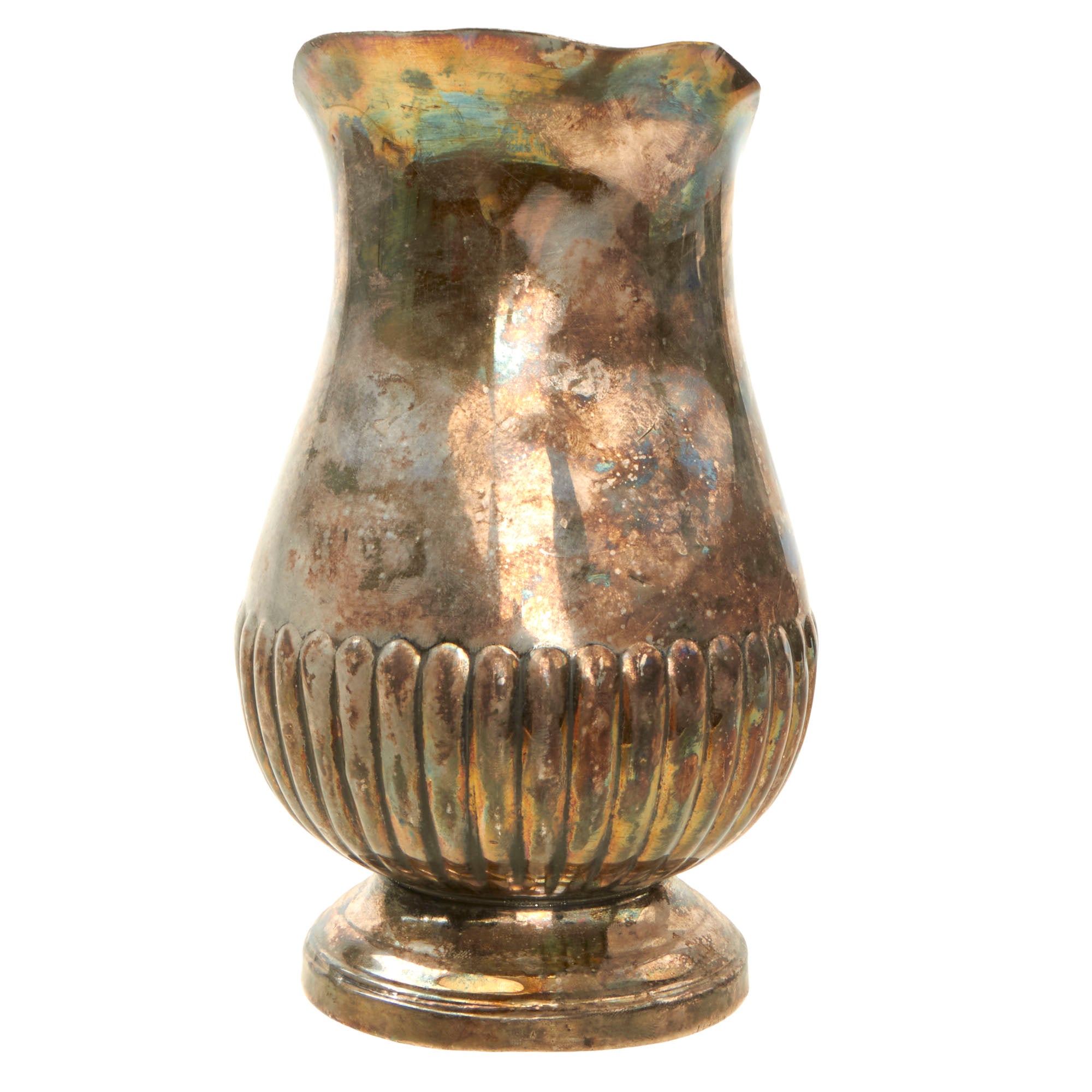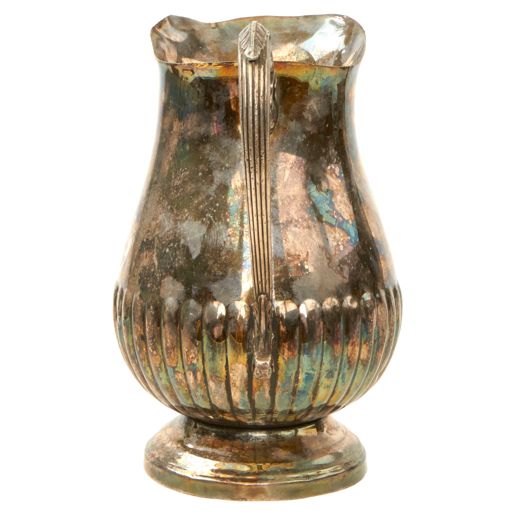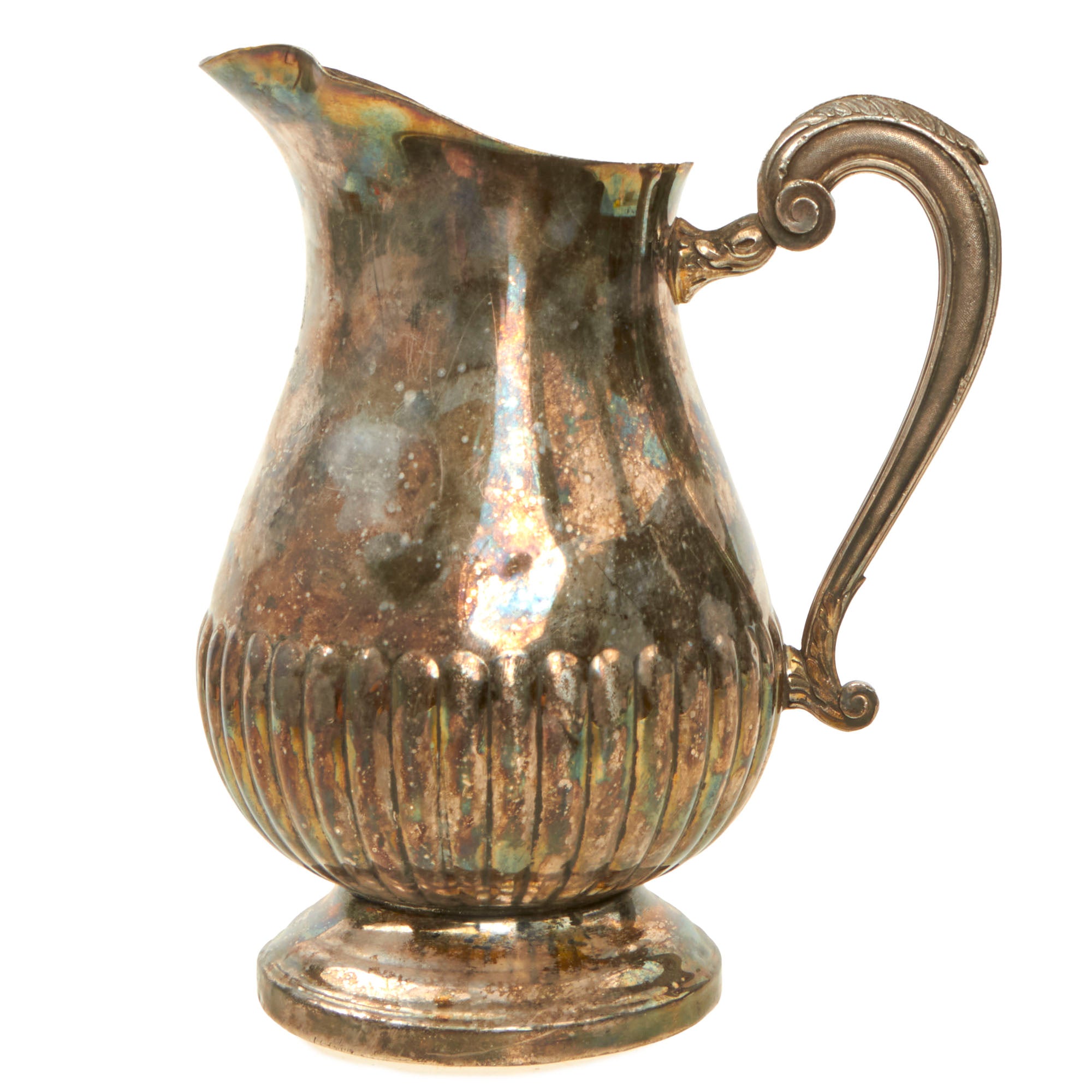 The pitcher measures approximately 9" tall and is 5 ½” at the widest point, not including the handle. It is silver plated sheet metal with an attached cast handle, and retains much of the original silver plating, though it is definitely tarnished. There are also some dents to the side, and deformation to the pouring spout, which we have left intact to preserve the history.