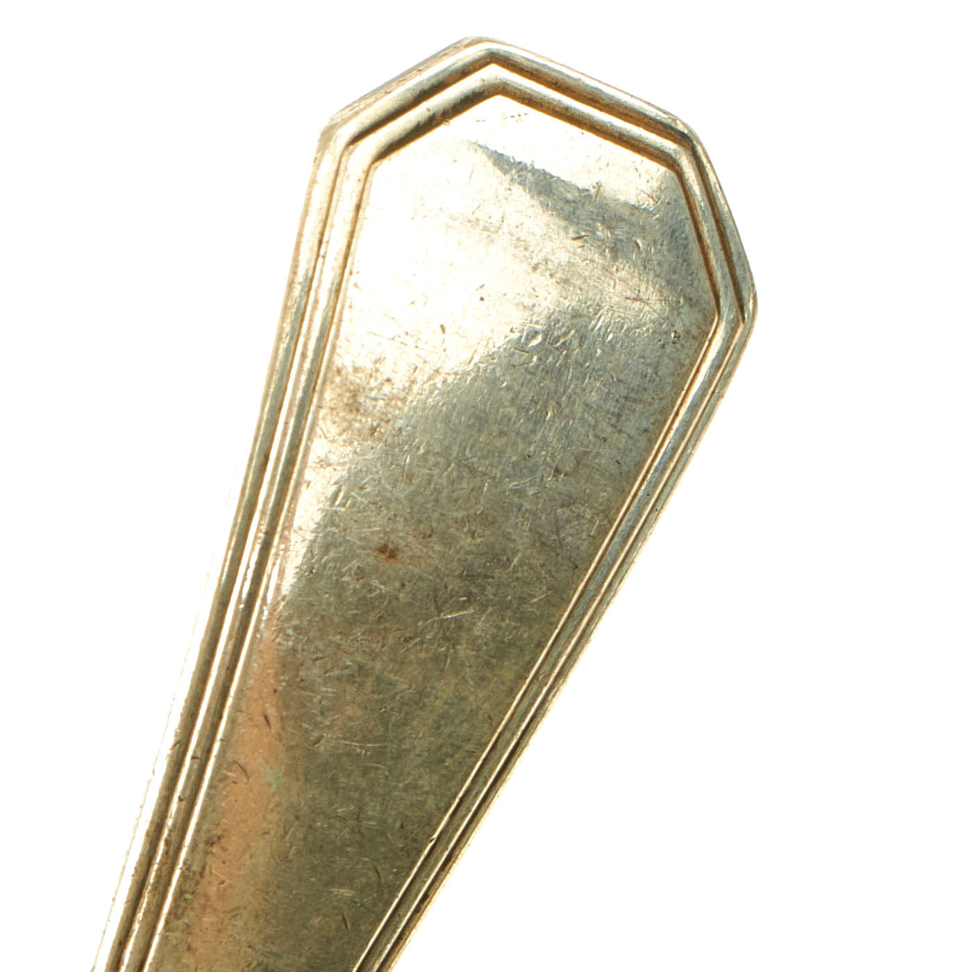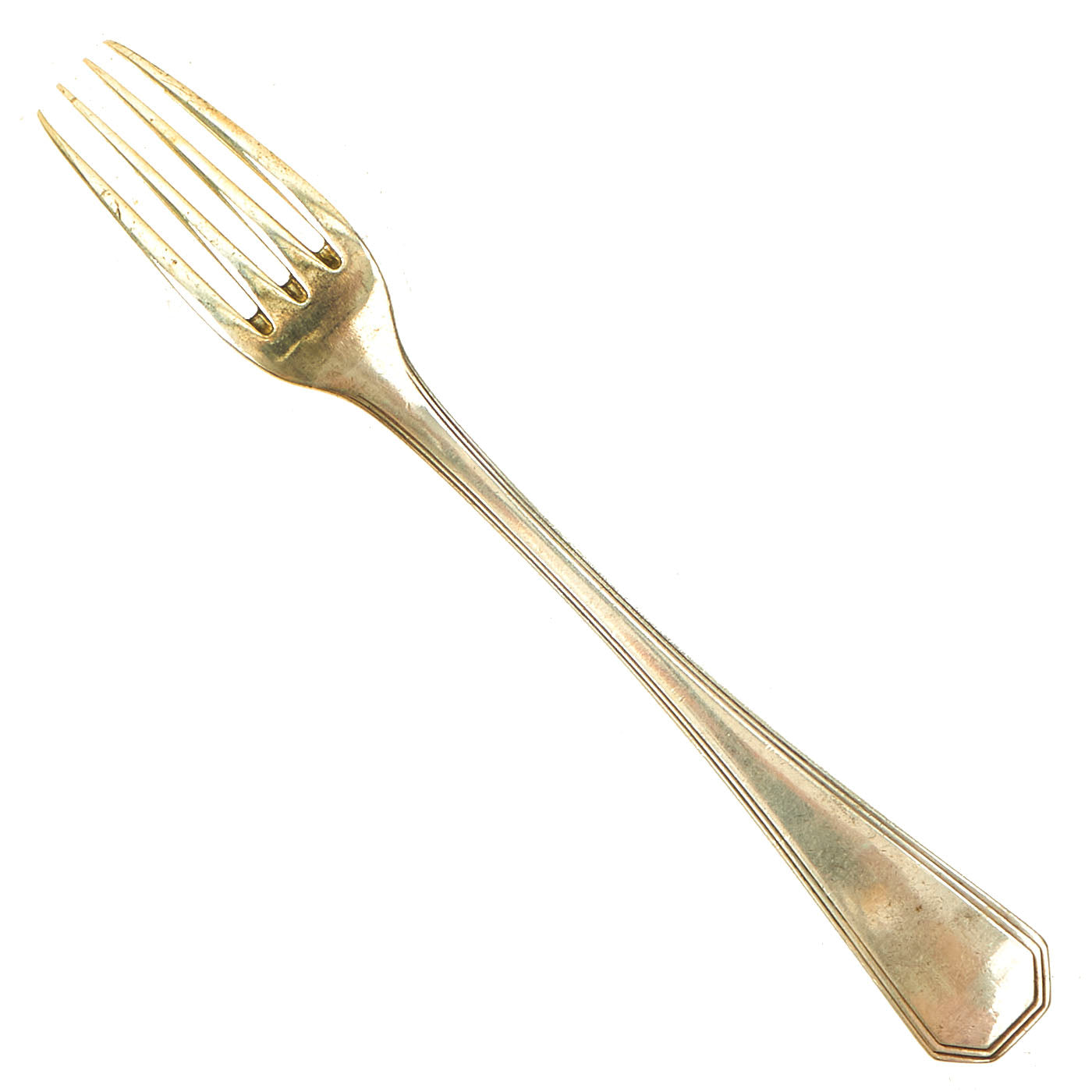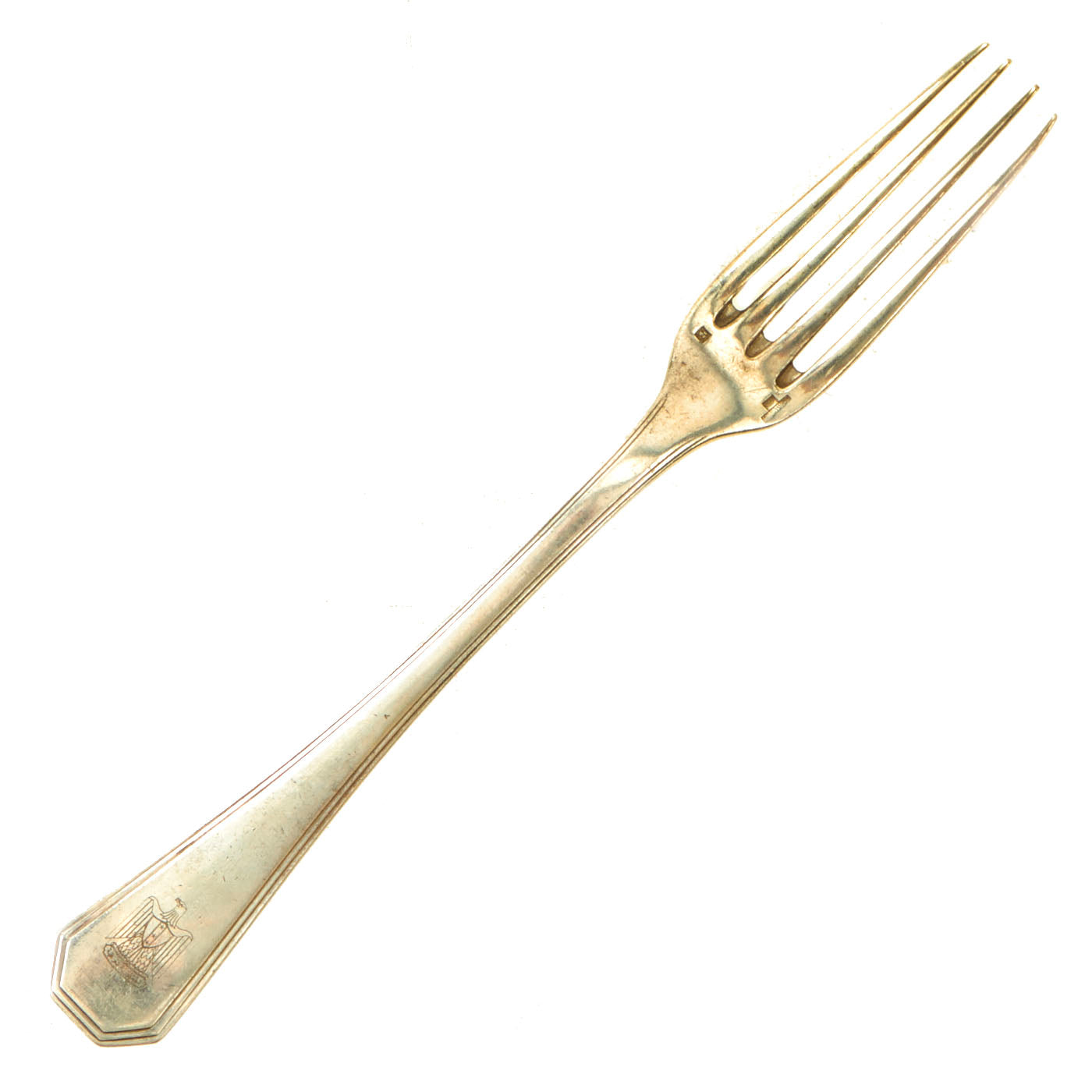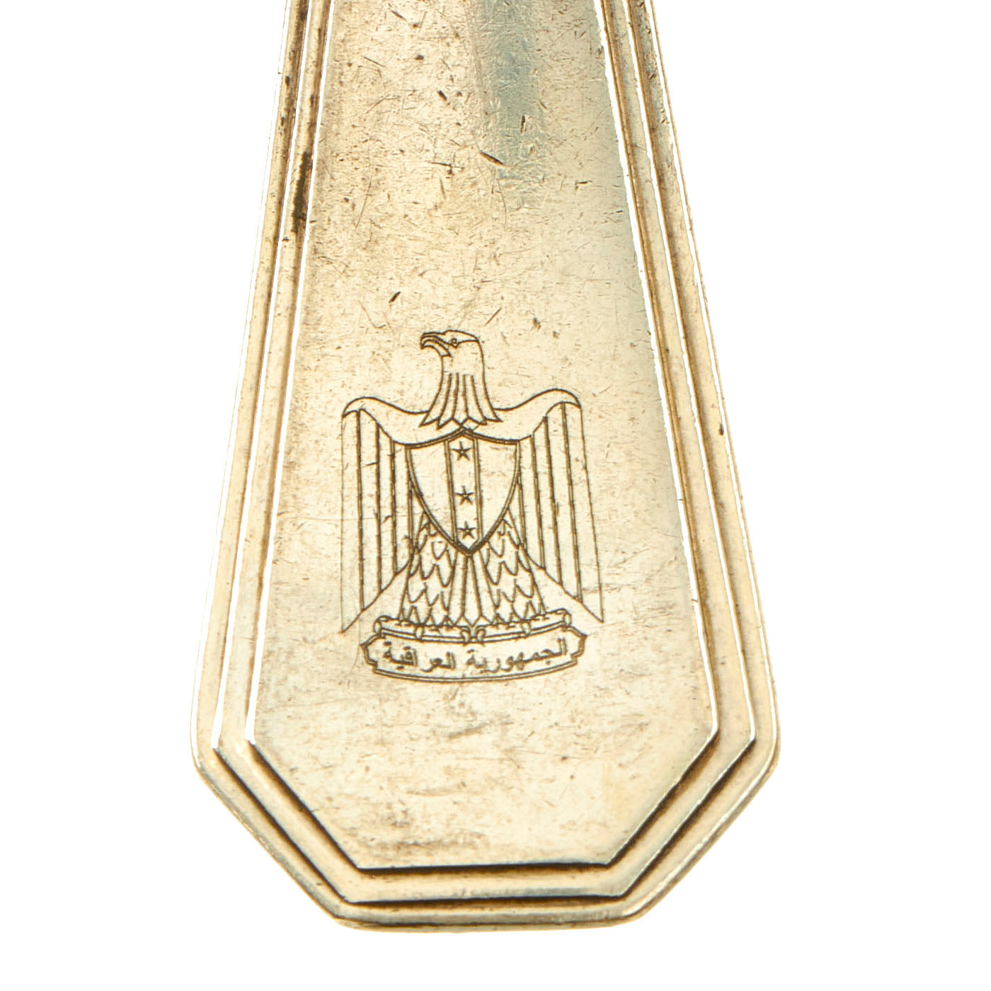 The handle of each fork features a beautiful roll-stamped Iraq Coat of Arms that was used from 1965 to 1991. Roll Stamping is similar to Impression Marking, but involves a flat die and a round part. The flat die is pressed into the round part as it rolls across the periphery. Rolling a die over a part creates less stress since all of the pressure is not being applied to the marking area at the same time.