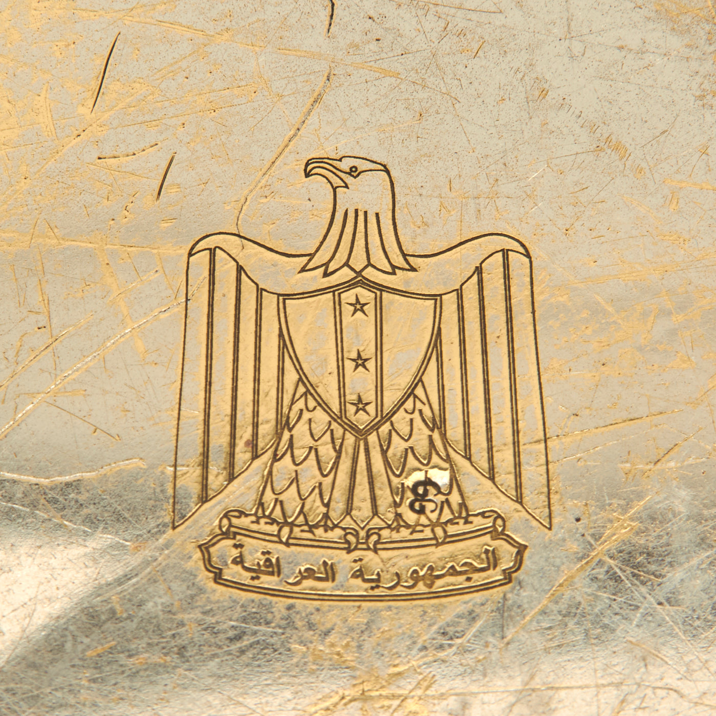 The face of the tray features a beautiful roll-stamped Iraq Coat of Arms that was used from 1965 to 1991. Roll Stamping is similar to Impression Marking, but involves a flat die and a round part. The flat die is pressed into the round part as it rolls across the periphery. Rolling a die over a part creates less stress since all of the pressure is not being applied to the marking area at the same time.