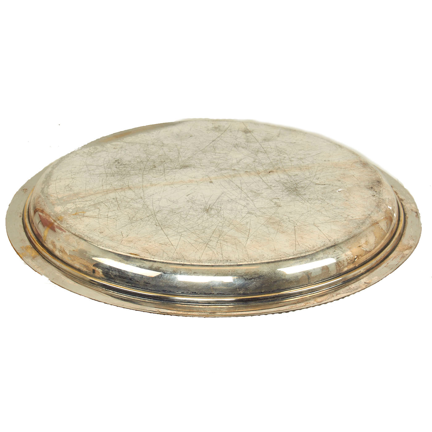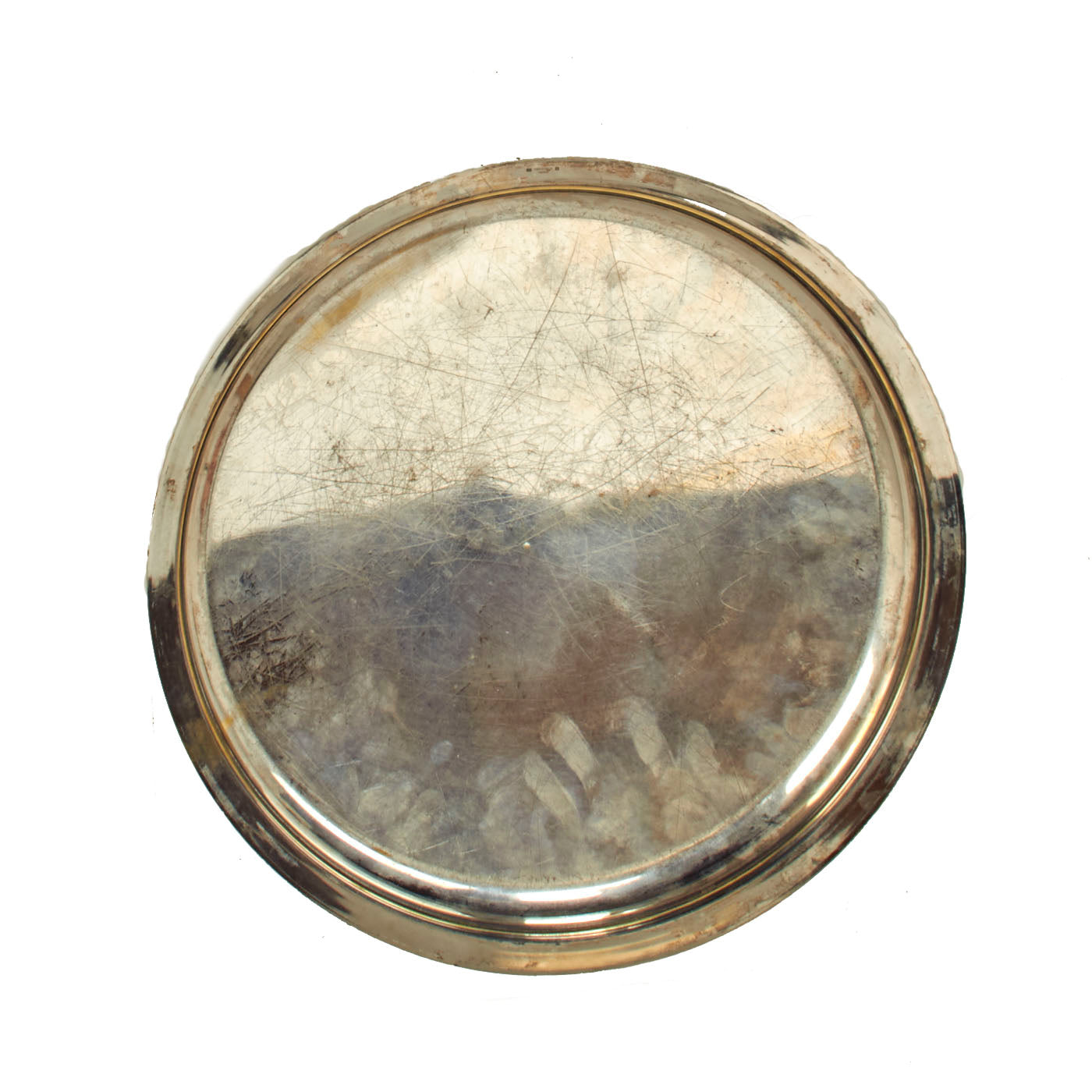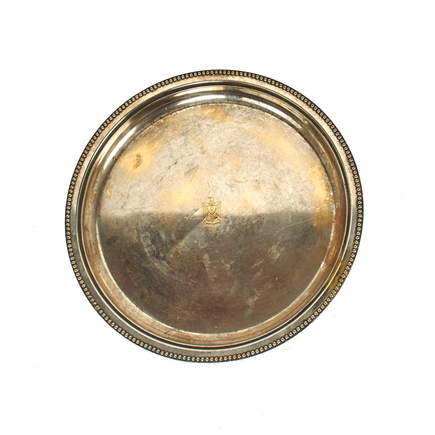 The Serving Tray is silver plated with a beaded design around the edge. The tray retains most of the original plating and all of the artwork is still visible. The only damage or discrepancy would be the plating wear and tarnishing.