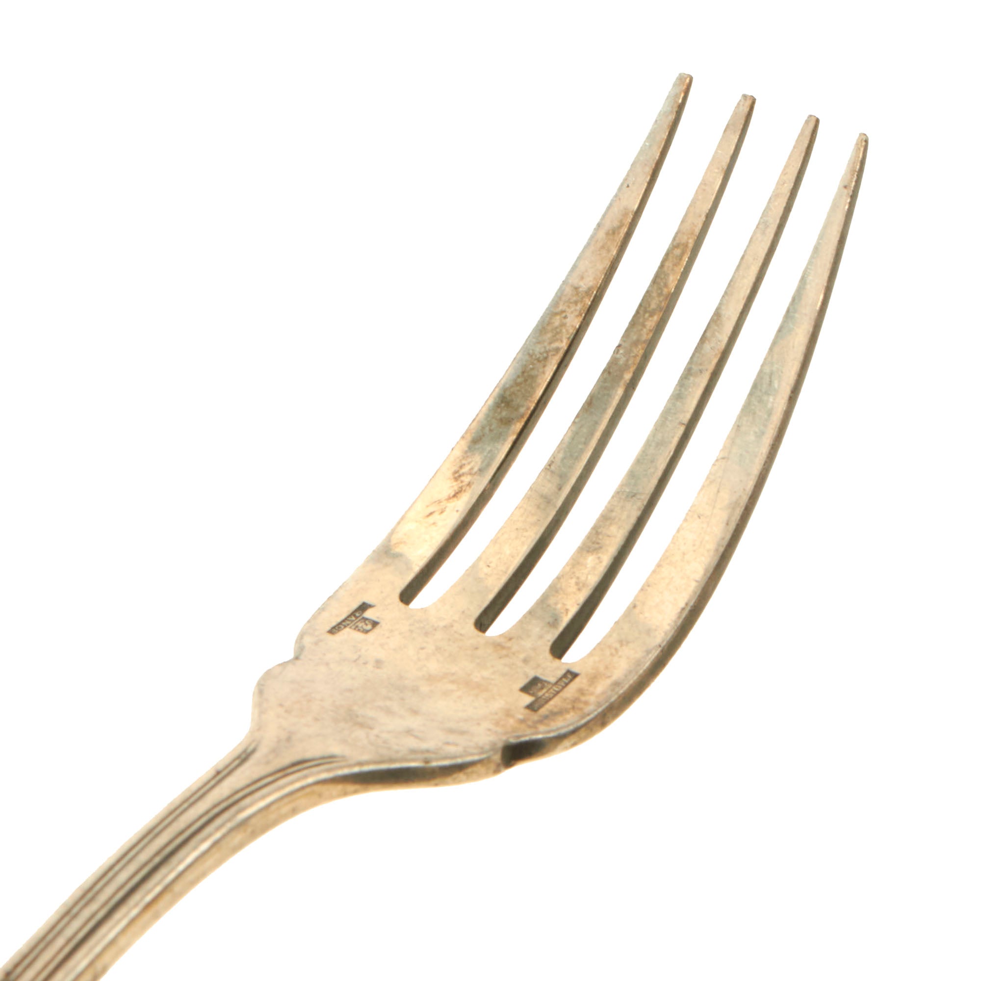 The lunch fork measures just over 7 inches long and is silver plated with an oval design to the handle. The fork retains most of the original plating and all of the double line borders are still visible. The only damage or discrepancy would be the plating wear and tarnishing.