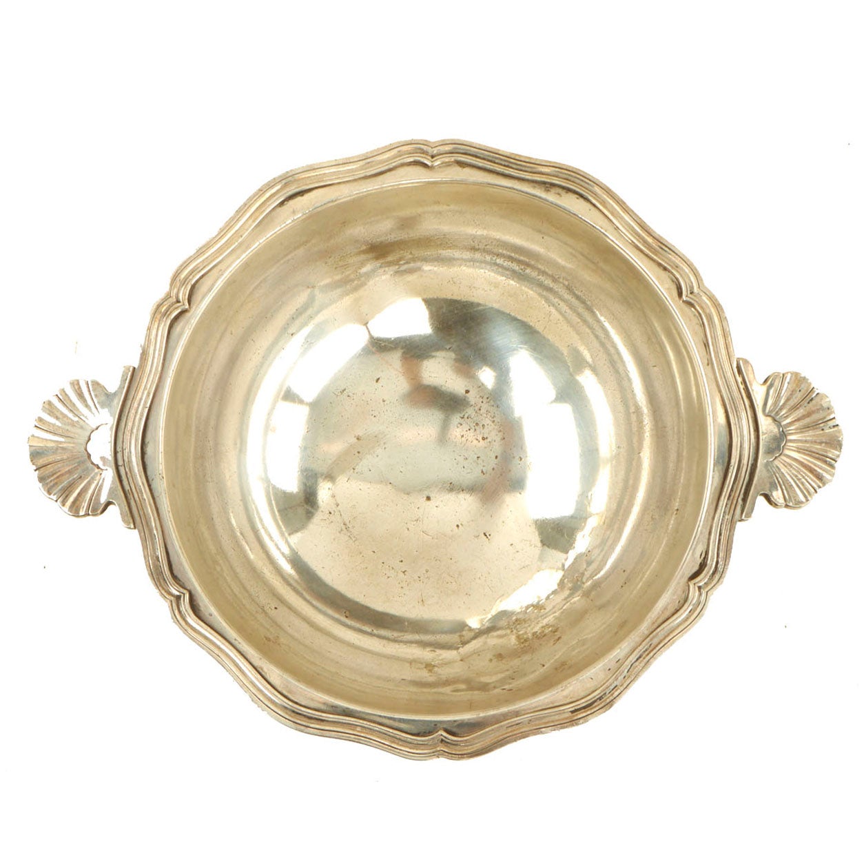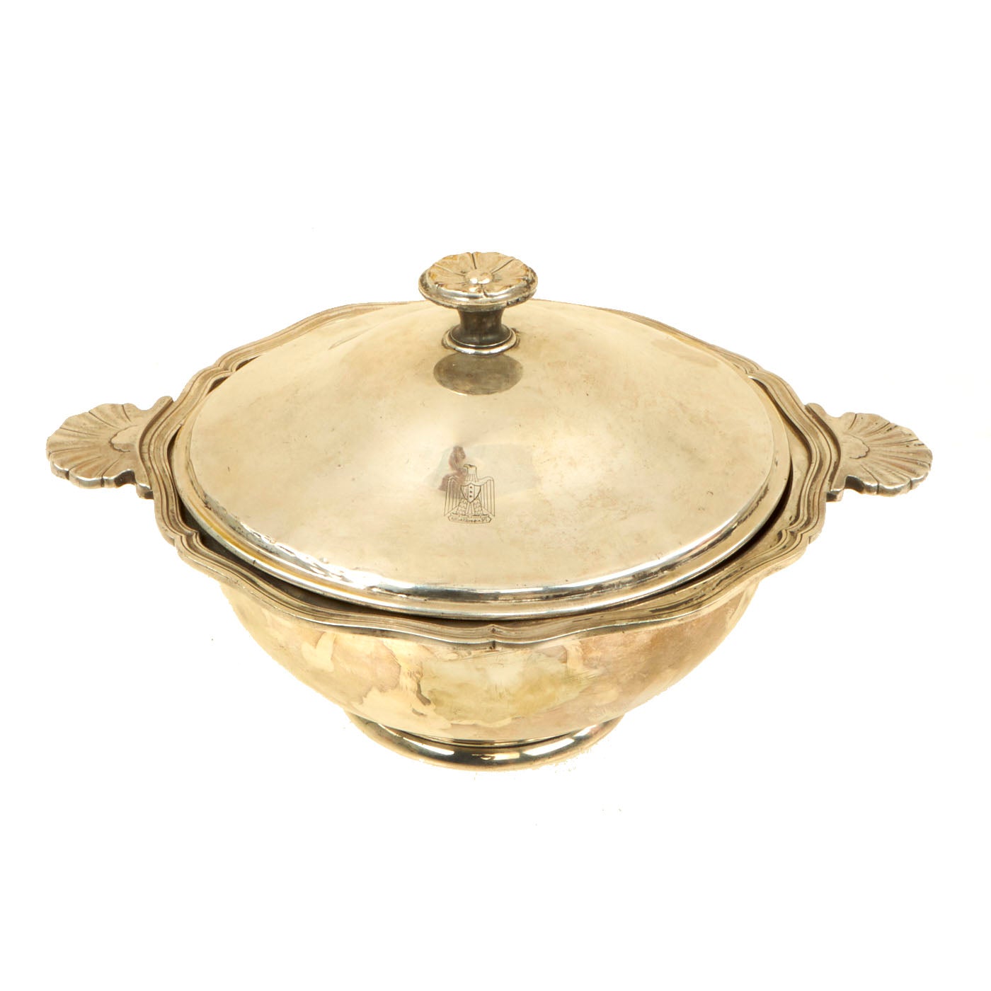 The Serving Bowl and Lid is silver plated with what appear to be clamshell design handles and a floral type knob on the lid. The bowl and lid retains most of the original plating and all of the artwork is still visible. The only damage or discrepancy would be that the top lid knob is no longer tight to the lid itself.