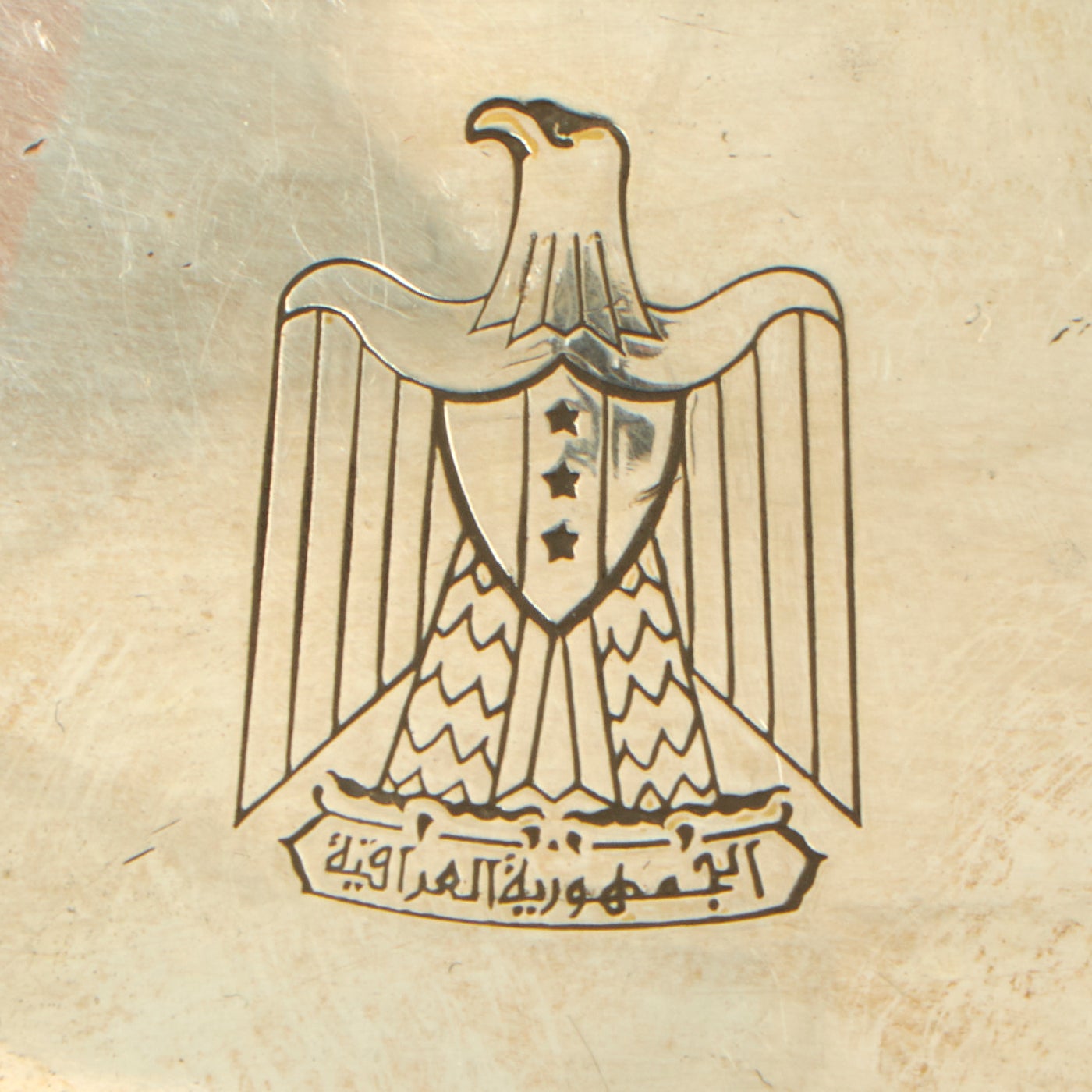 The body of the bowl and the lid features a beautiful roll-stamped Iraq Coat of Arms that was used from 1965 to 1991. Roll Stamping is similar to Impression Marking, but involves a flat die and a round part. The flat die is pressed into the round part as it rolls across the periphery. Rolling a die over a part creates less stress since all of the pressure is not being applied to the marking area at the same time.