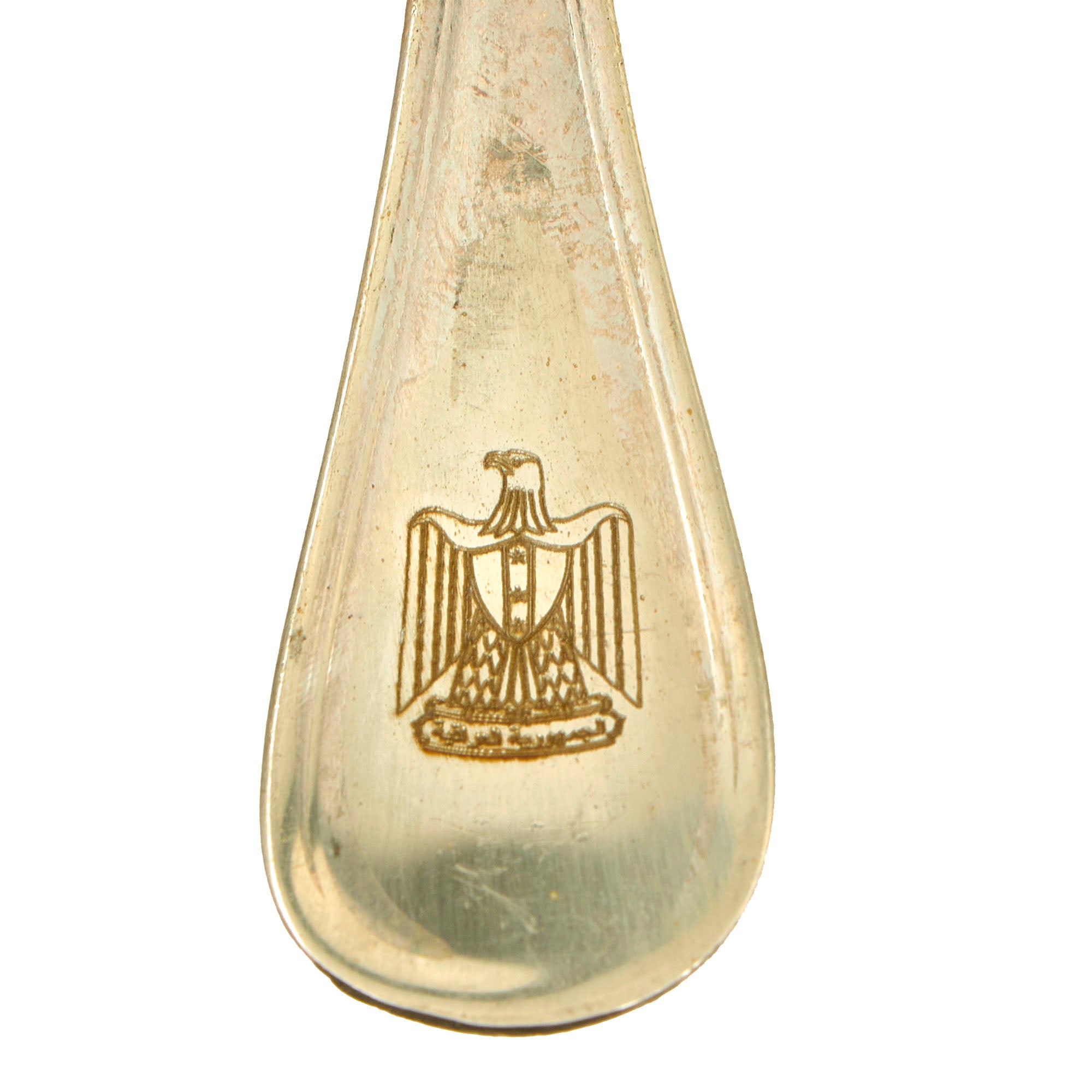 The handle the spoon features a beautiful roll-stamped Iraq Coat of Arms that was used from 1965 to 1991. Roll Stamping is similar to Impression Marking, but involves a flat die and a round part. The flat die is pressed into the round part as it rolls across the periphery. Rolling a die over a part creates less stress since all of the pressure is not being applied to the marking area at the same time.