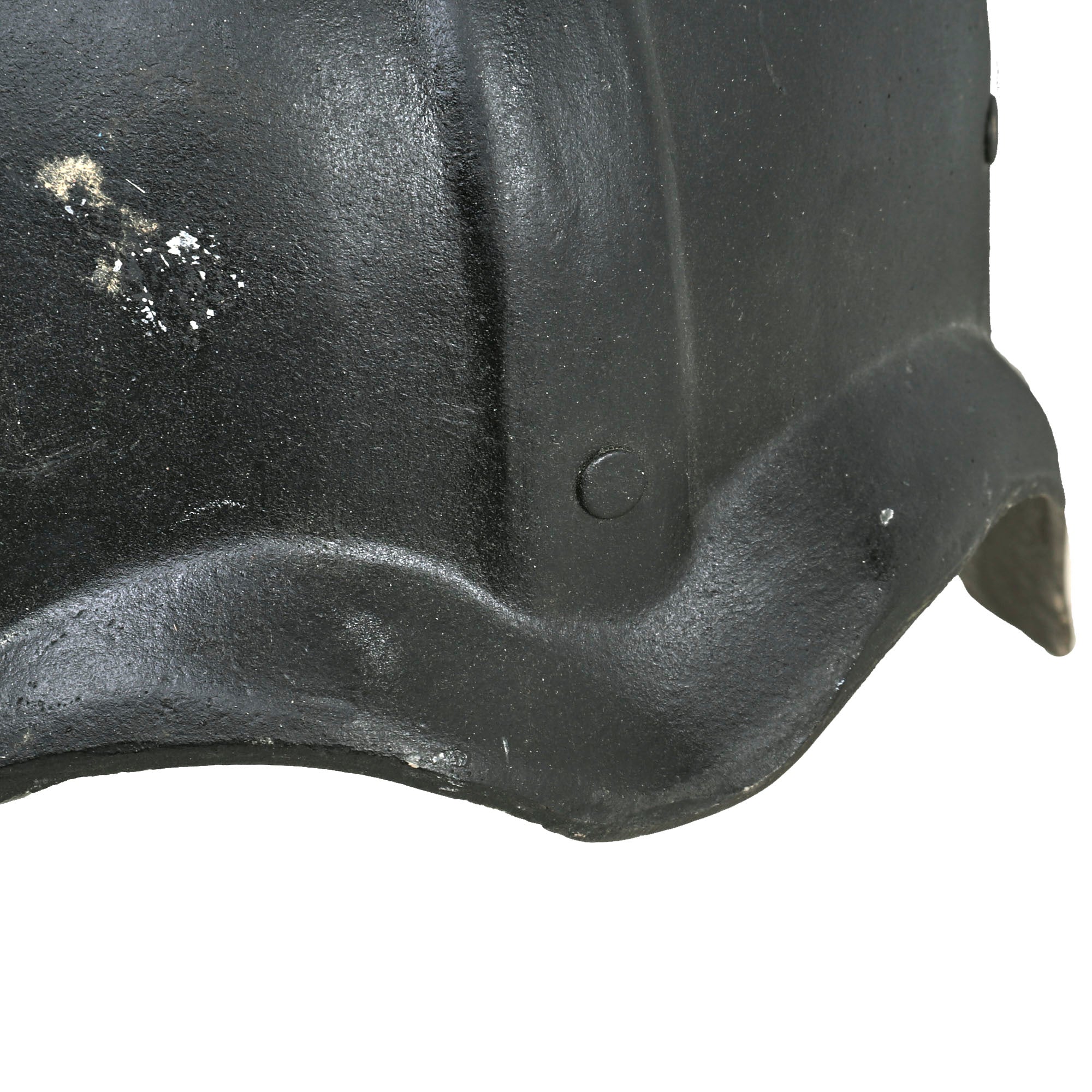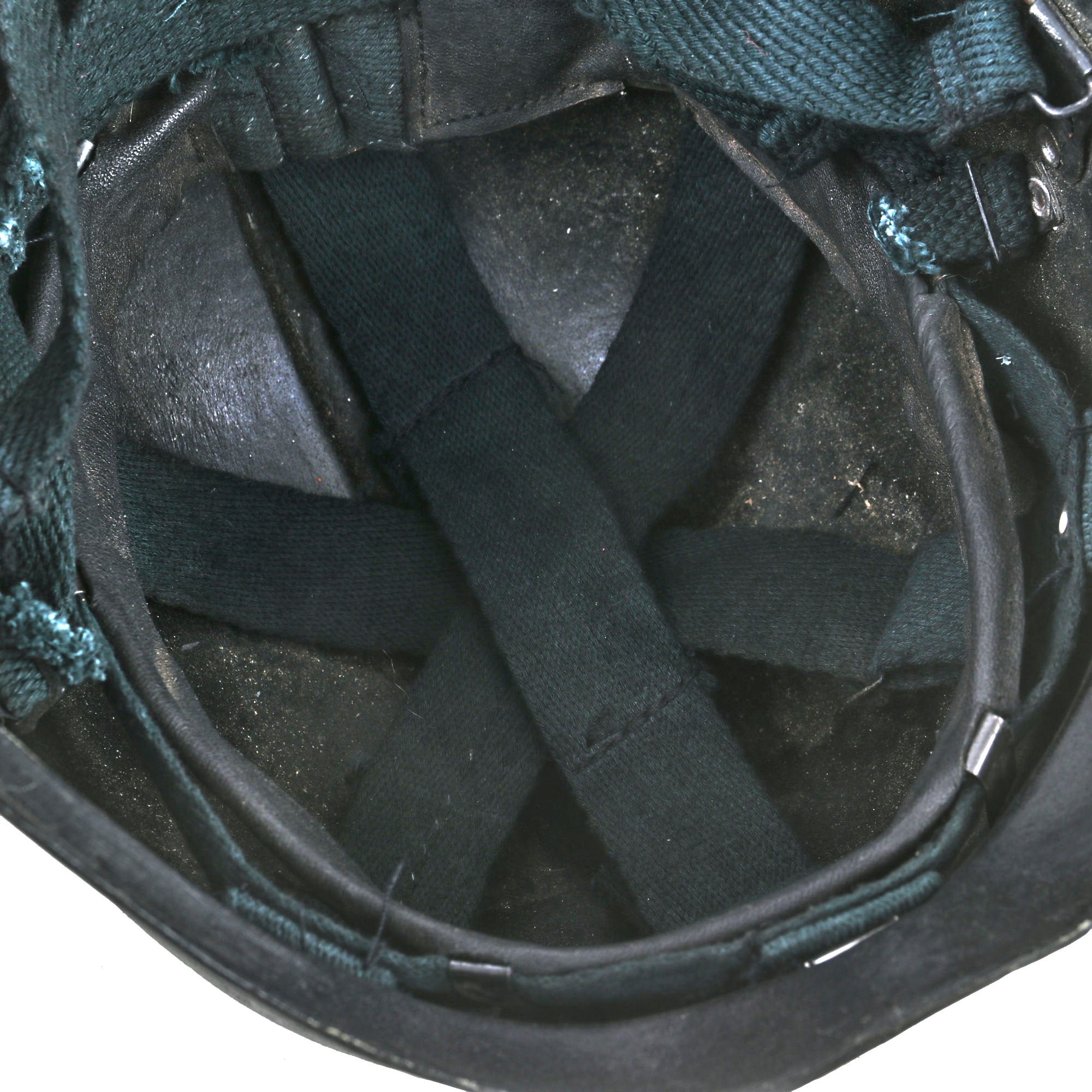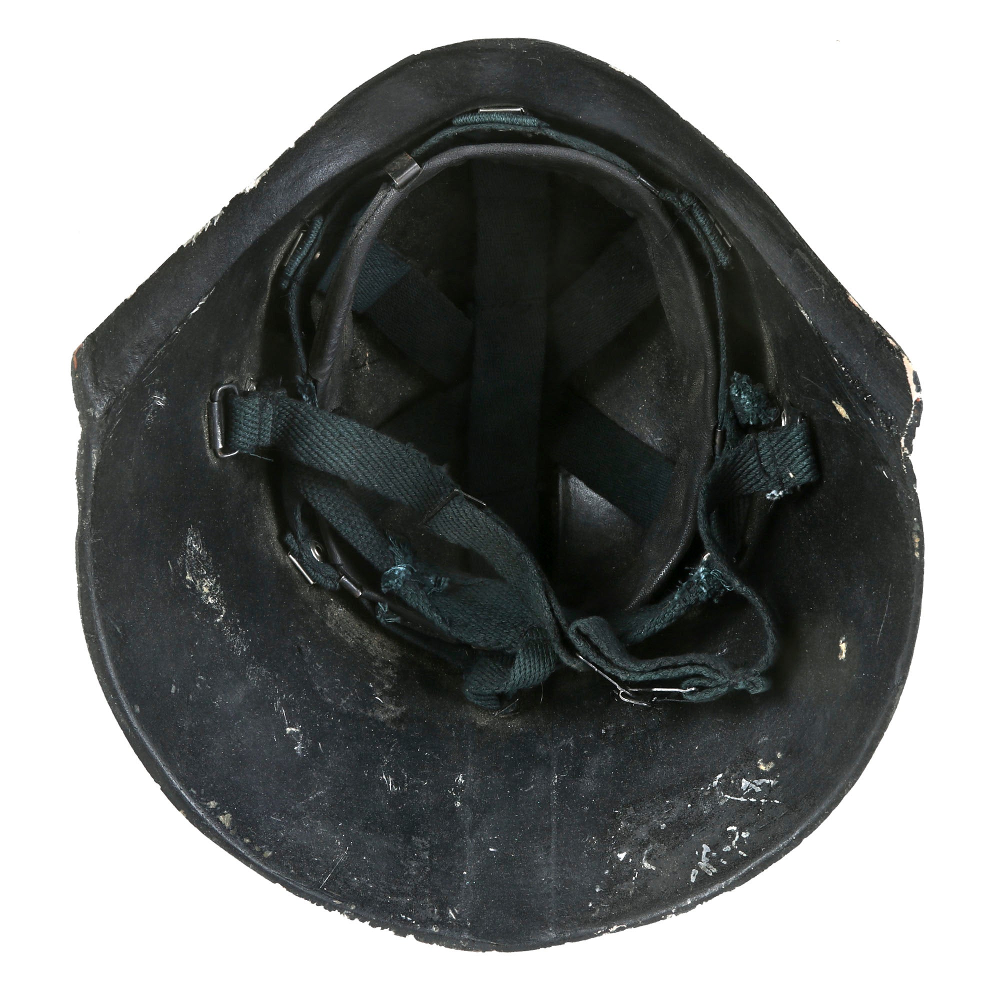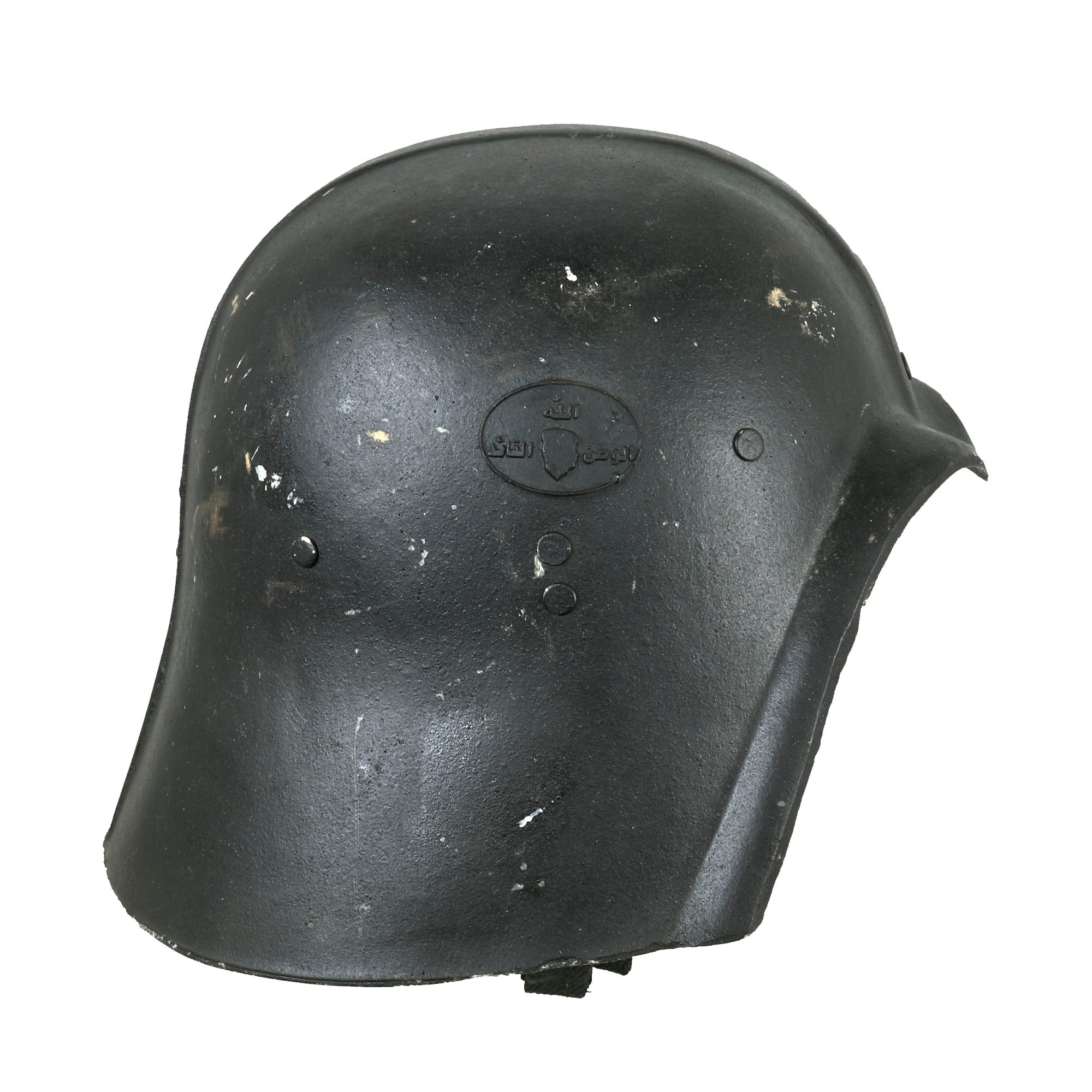 This one is in good condition, with complete rigging, sweatband, chin strap and, most importantly, the right side badge with the silhouette of Saddam Hussein and the Arabic phrase The Lord, The Homeland, The Leader. There is some wear and damage to the edges of the helmet, as these were not made of the most resilient material.