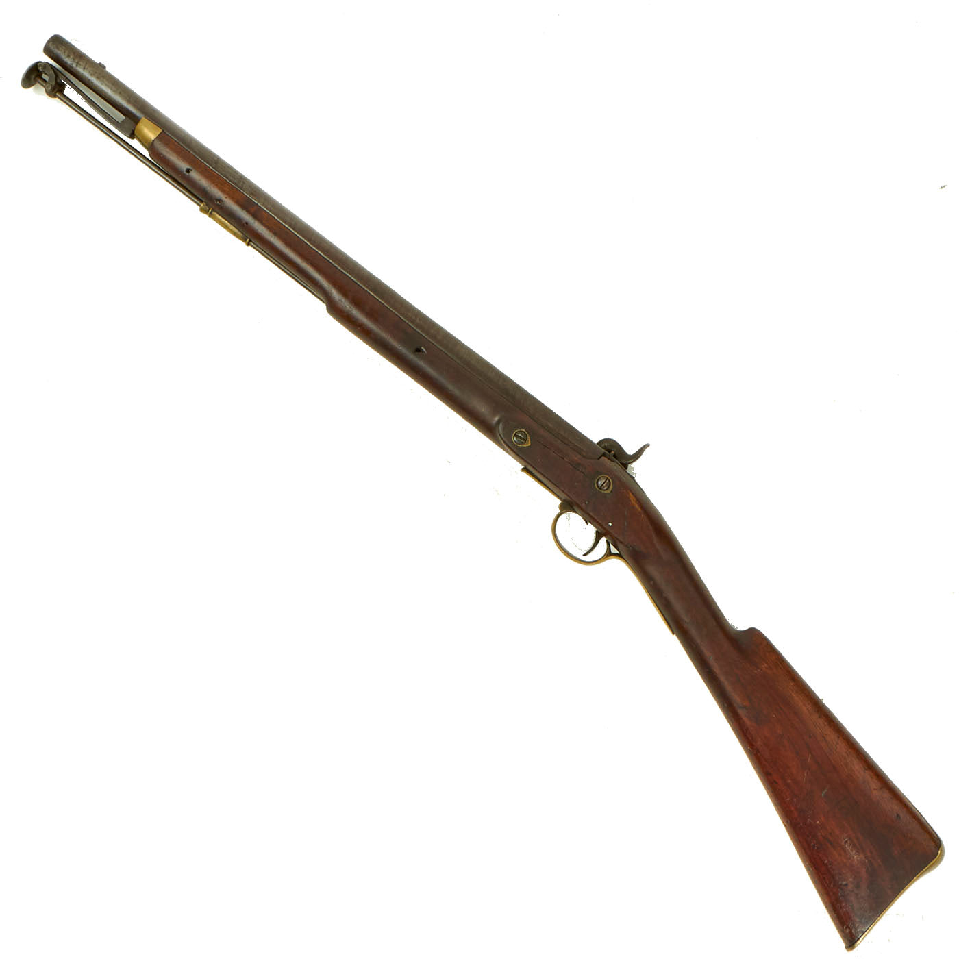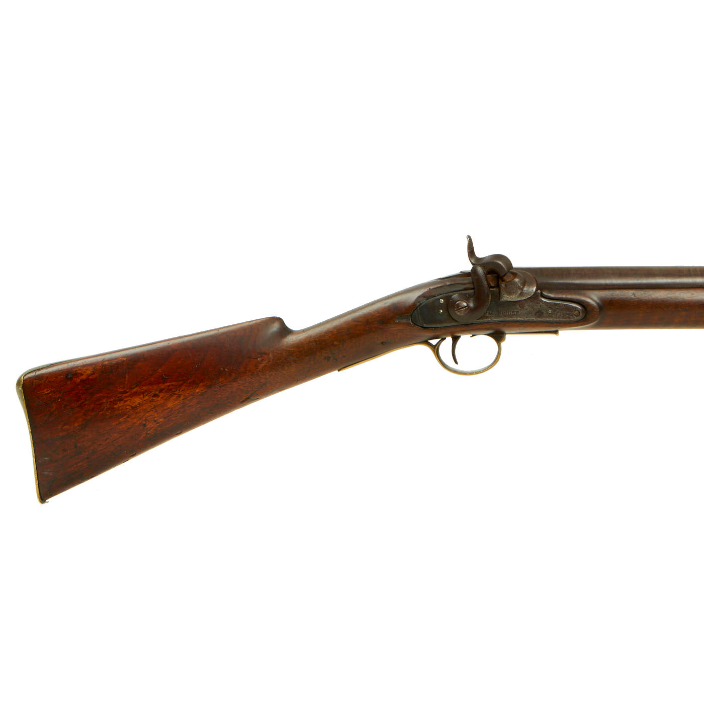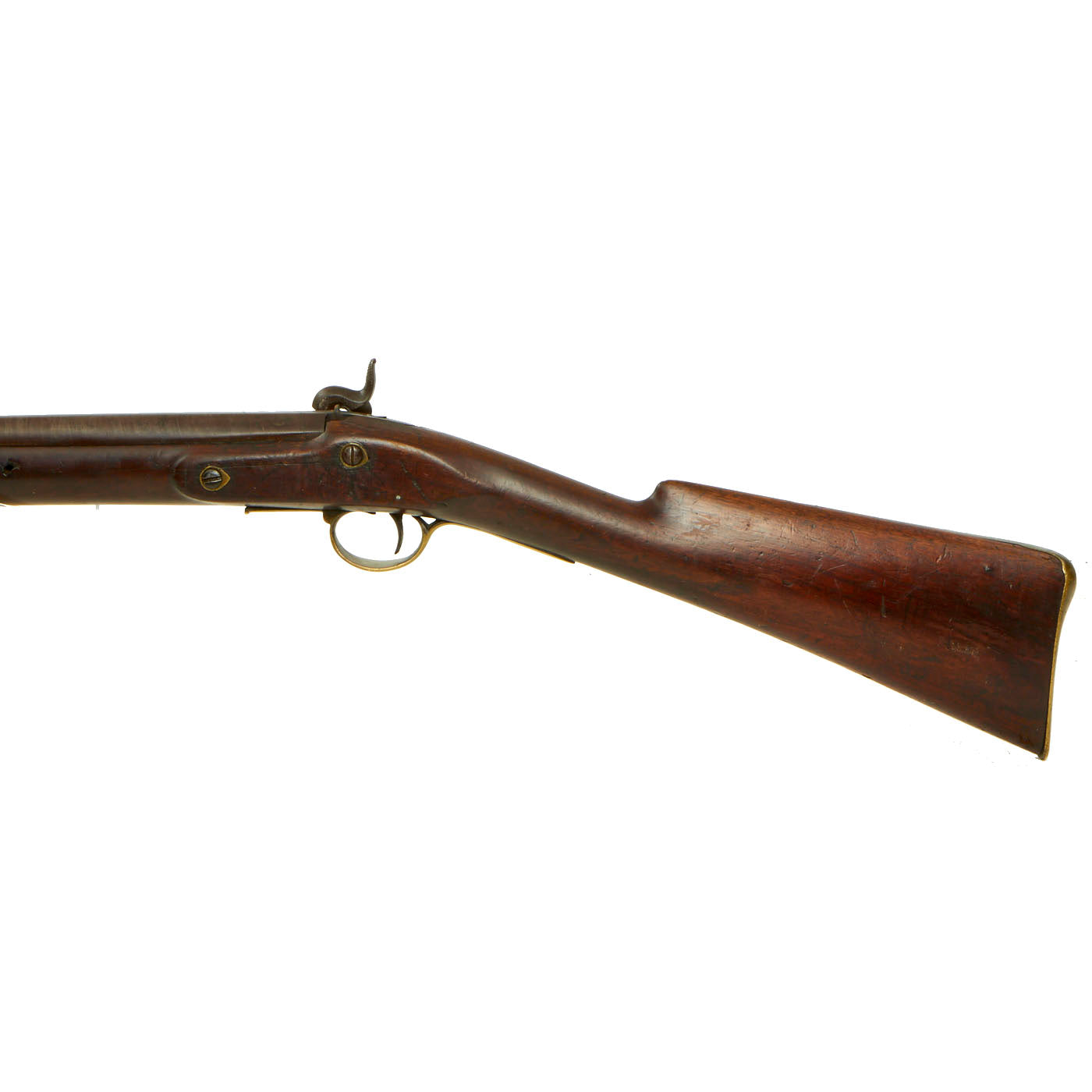 Original Item: Only One Available. This is a very interesting Irish Percussion cavalry carbine, marked on the lock plate by maker W. & J. RIGBY, with a faint DUBLIN stamping on the barrel. There are no military markings, so it is most likely a commercial or colonial service produced weapon. It features a 22 inch long twist forged barrel, which was made with a .65" rifled bore, since smooth bored possibly for Colonial use. All brass classic mounts, the design is very similar East India Company IRREGULAR CAVALRY CARBINES of the 1840's. It has a bar extension under the barrel for the "captured" ramrod, as it looks to have been designed to possibly take a bayonet of some type. Definitely an interesting piece worth of further research!