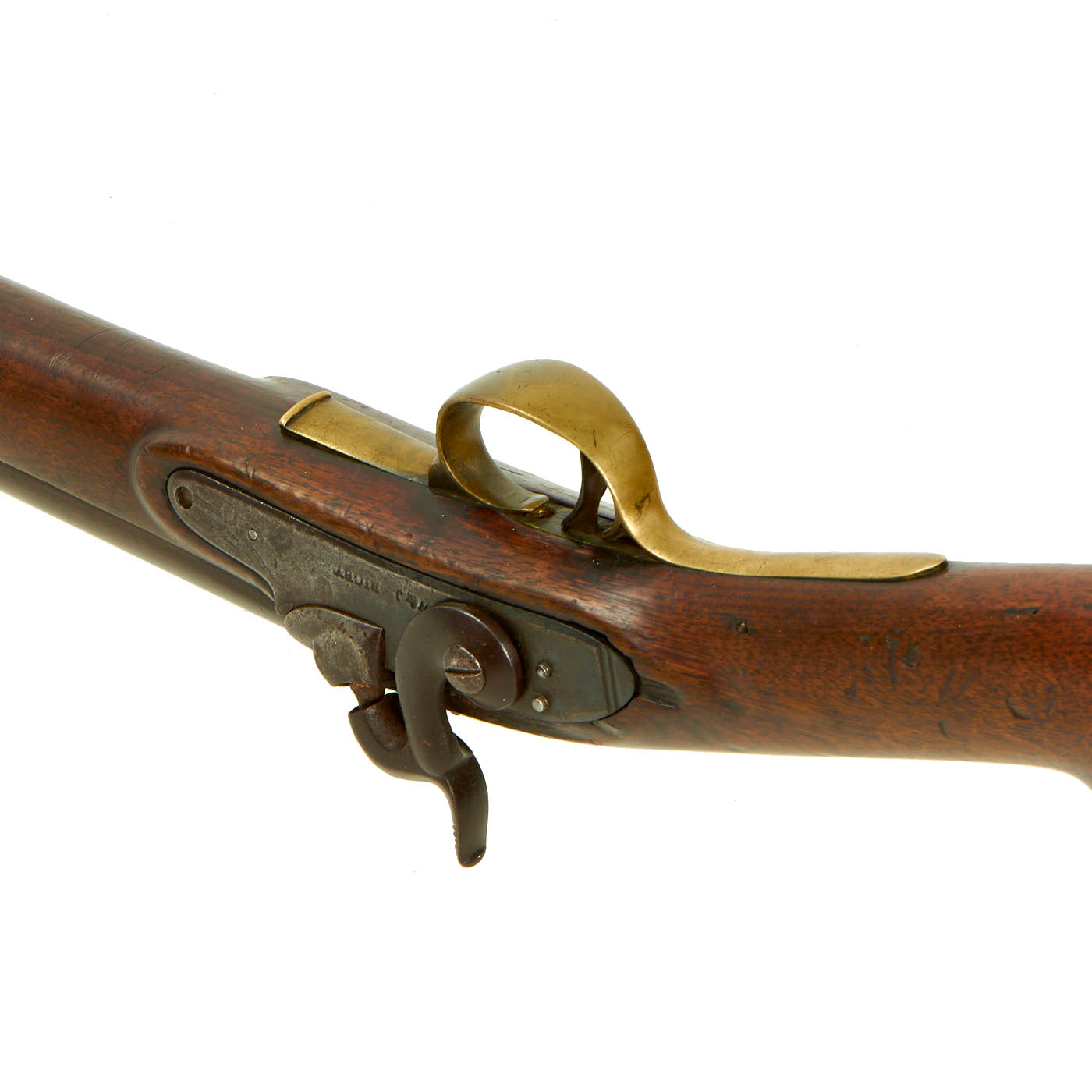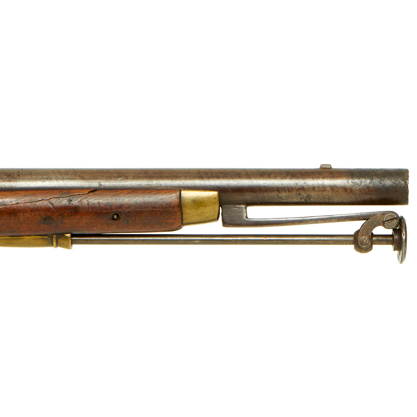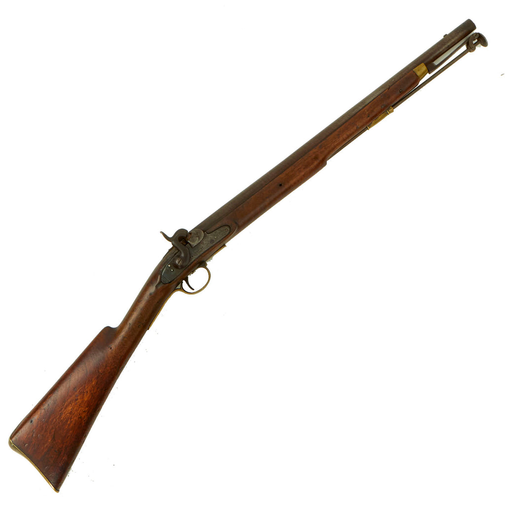 Original Item: Only One Available. This is a very interesting Irish Percussion cavalry carbine, marked on the lock plate by maker W. & J. RIGBY, with a faint DUBLIN stamping on the barrel. There are no military markings, so it is most likely a commercial or colonial service produced weapon. It features a 22 inch long twist forged barrel, which was made with a .65" rifled bore, since smooth bored possibly for Colonial use. All brass classic mounts, the design is very similar East India Company IRREGULAR CAVALRY CARBINES of the 1840's. It has a bar extension under the barrel for the "captured" ramrod, as it looks to have been designed to possibly take a bayonet of some type. Definitely an interesting piece worth of further research!