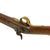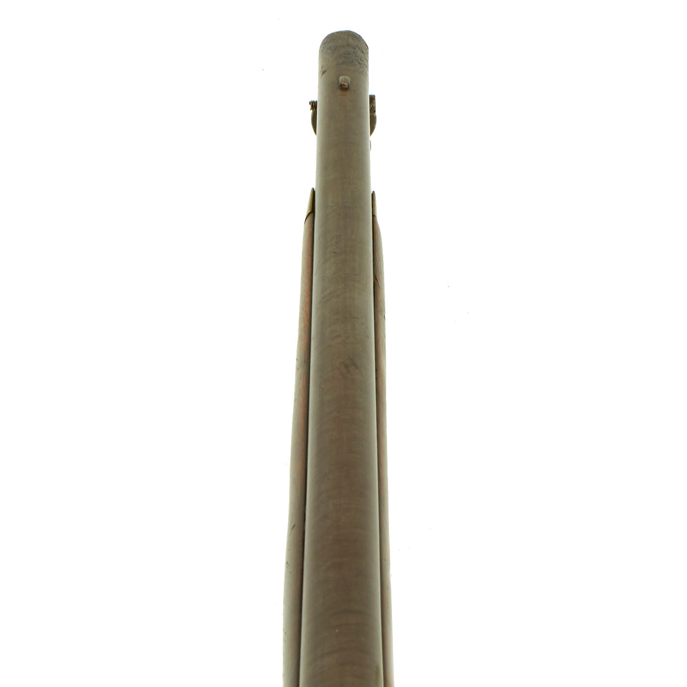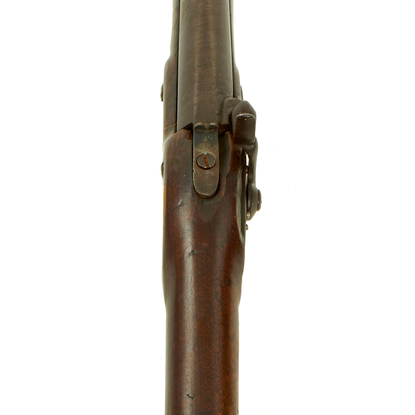 The gun was never fitted with saddle bar and ring, and has the correct "teardrop" shaped escutcheons used to fill the holes designed to fit a saddle bar. The stock is in good original condition, with some nice "flame" to the grain on the forestock area. It does show some wear from use, and there is a repaired area along the woodline on the right side of the fore stock. There is also a crack on the left side near the lock screws. Some wood is missing around the cap bolster due to powder burn erosion. We checked the lock, and it functions correctly, holding at half cock and firing at full, though it is a bit stiff. We checked the bore, and it is clear, but shows significant oxidation and fouling.
