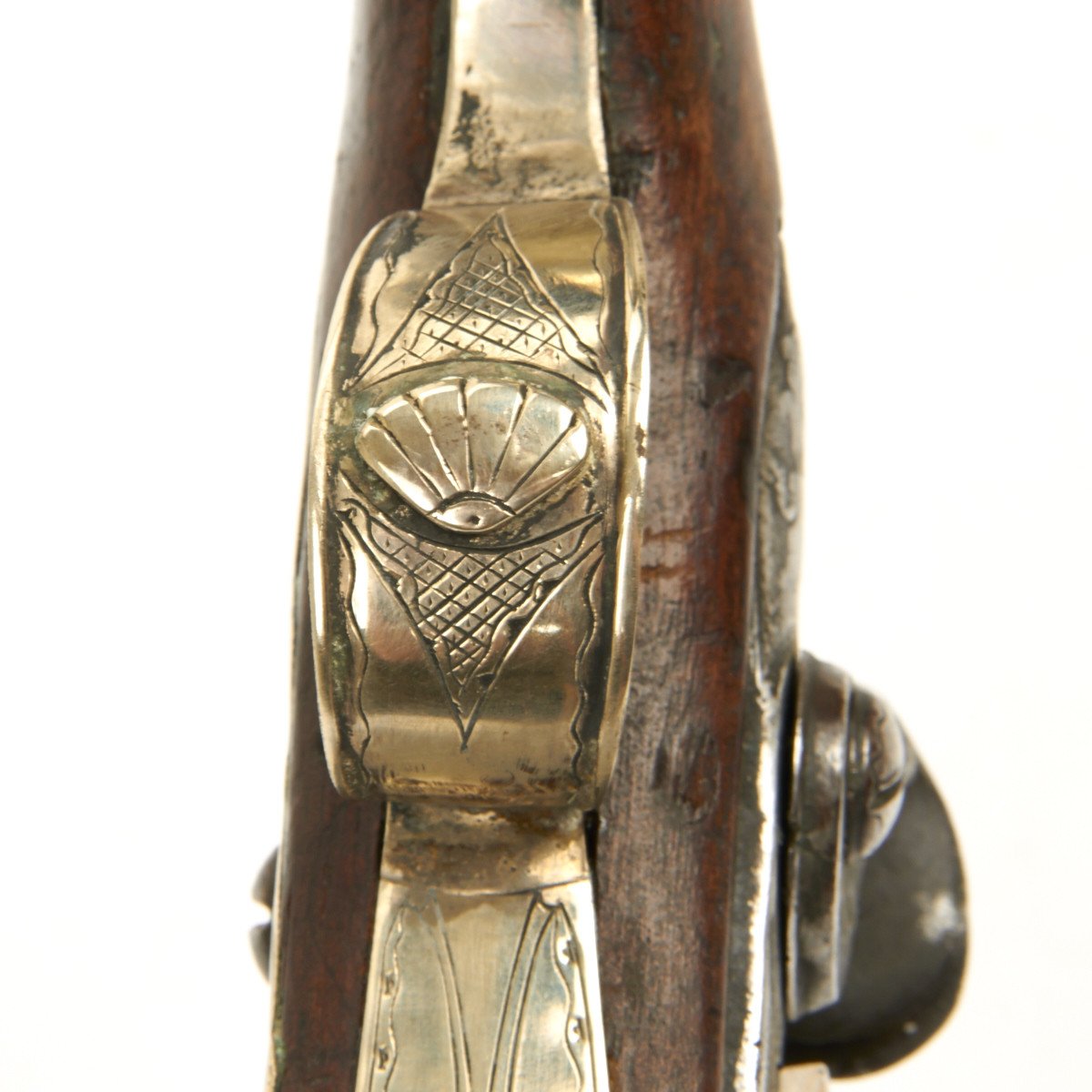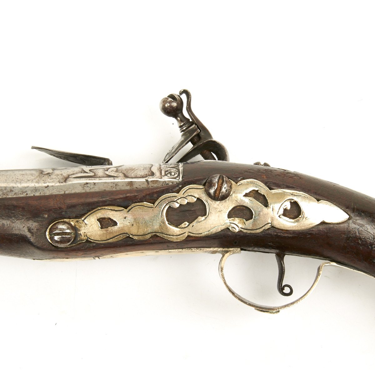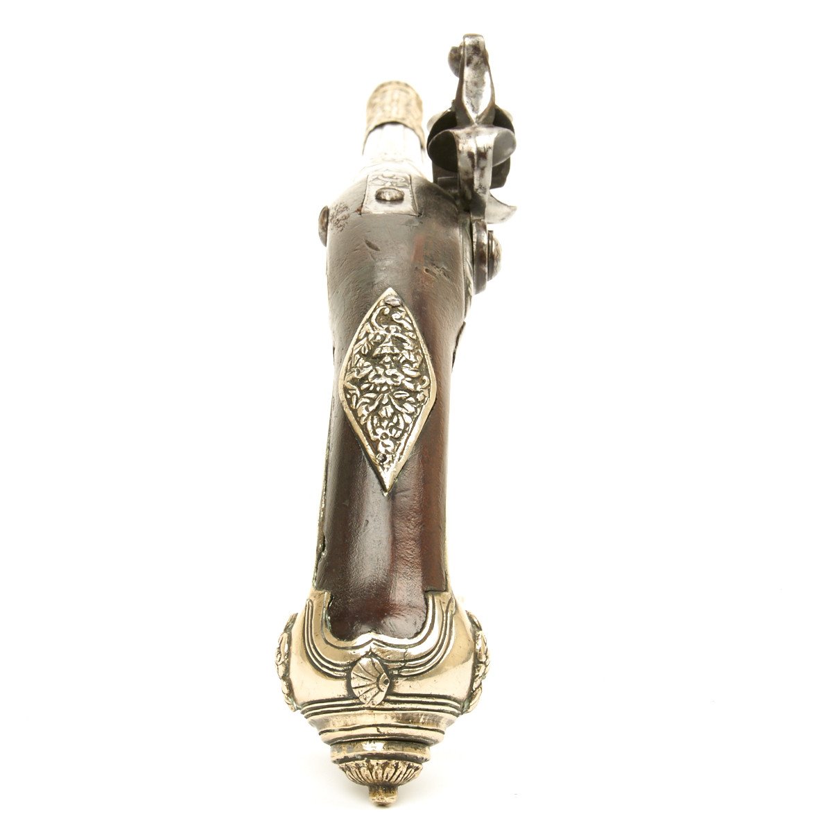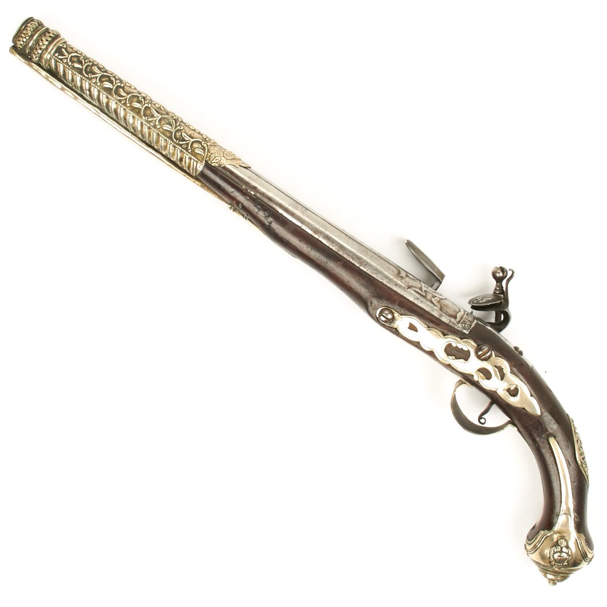 Fully Silver mounted with heavy decorated eared butt cap, open work side plate, engraved Trigger Guard and very ornate Silver barrel sheath, a typical Middle Eastern Islamic characteristic. Embossed steel barrel and lock, often taken from earlier European weapons, make this particular flintlock pistol a real eye stopper.
