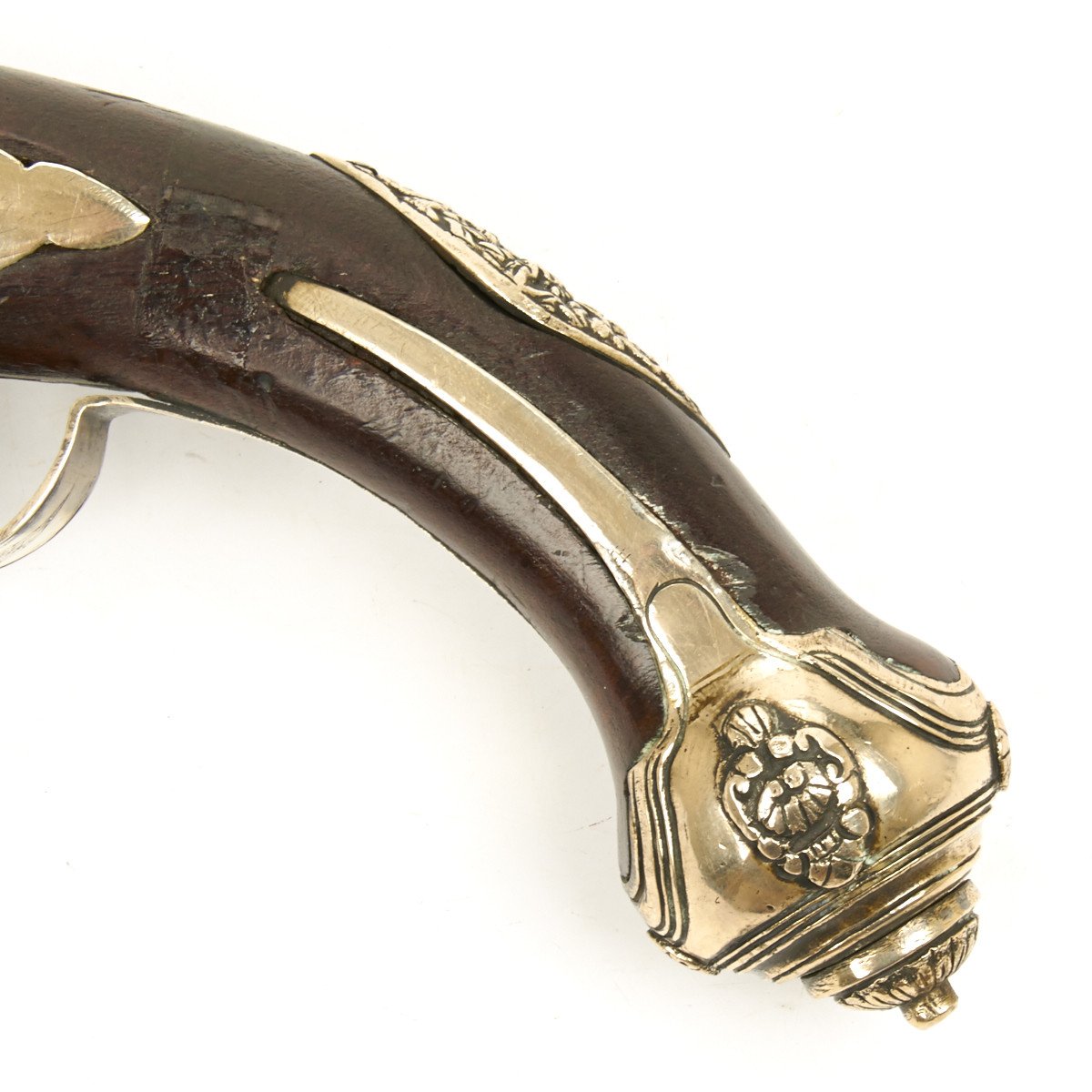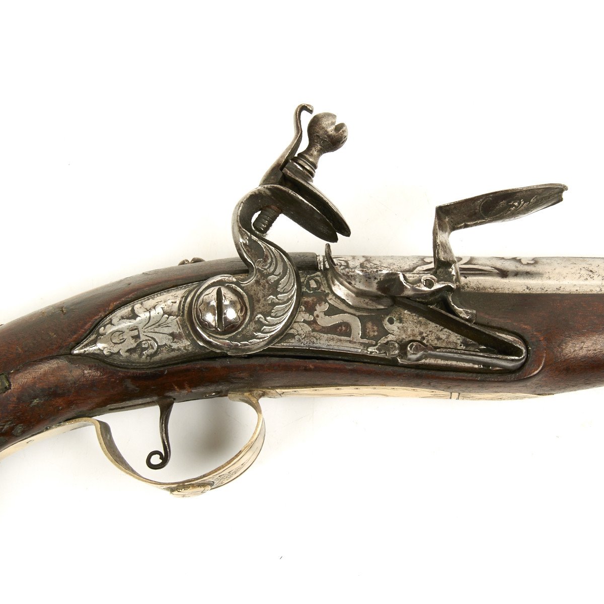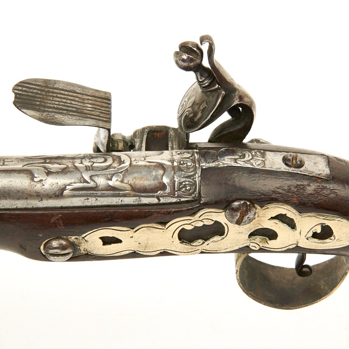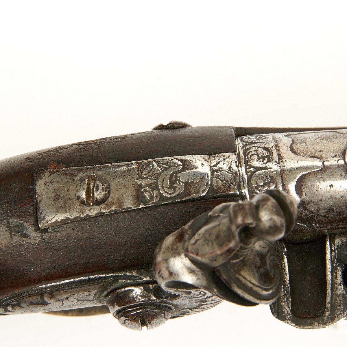 Fully Silver mounted with heavy decorated eared butt cap, open work side plate, engraved Trigger Guard and very ornate Silver barrel sheath, a typical Middle Eastern Islamic characteristic. Embossed steel barrel and lock, often taken from earlier European weapons, make this particular flintlock pistol a real eye stopper.