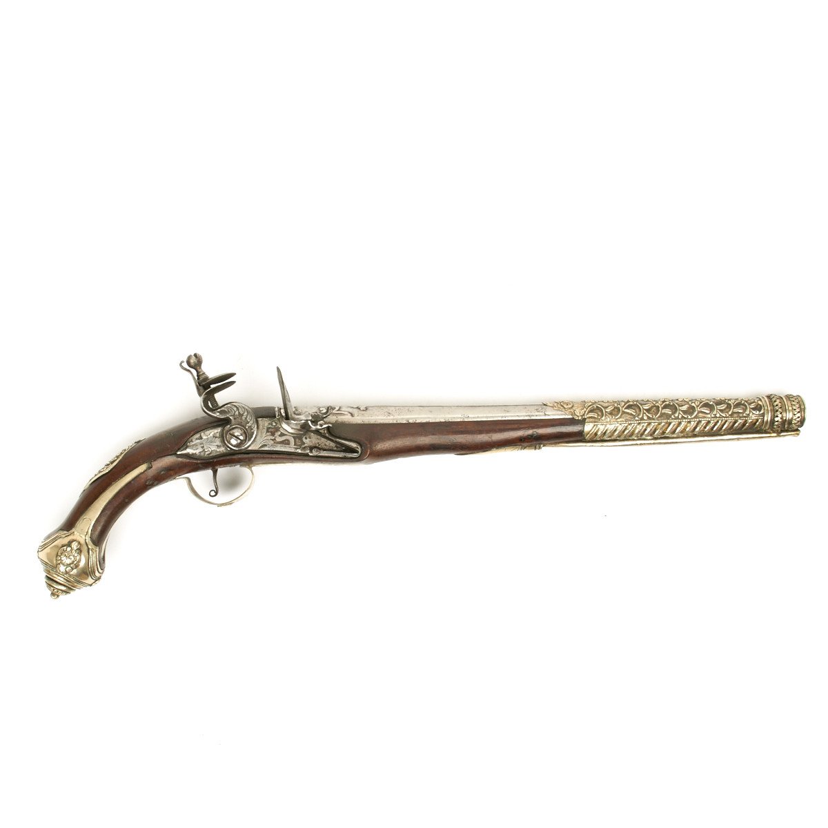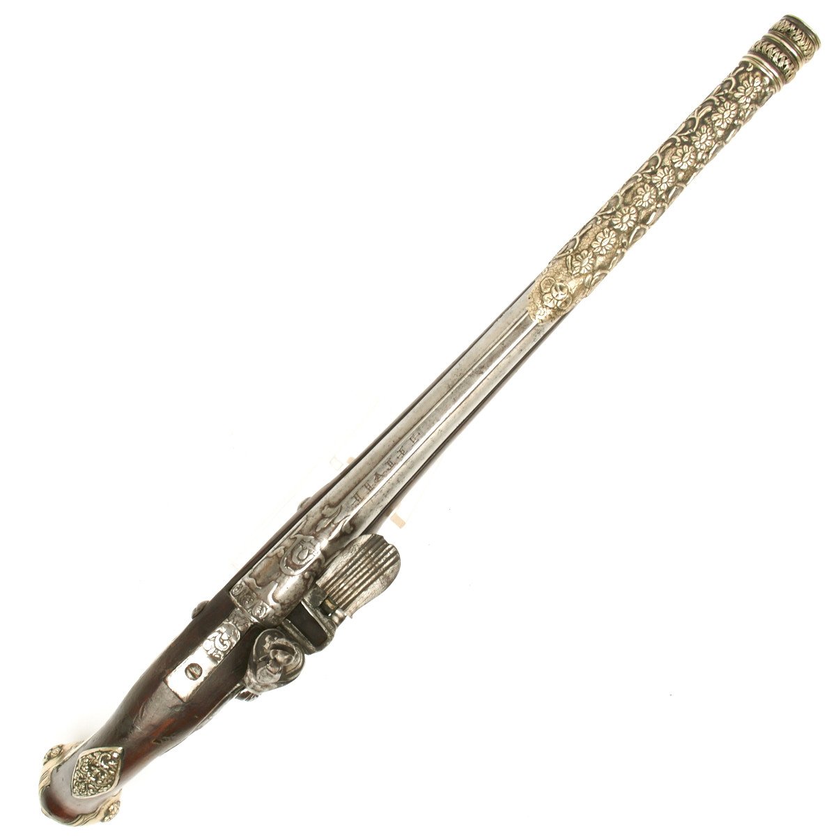 Original Item: Only One Available. This is a fabulous silver mounted flintlock pistol, 21 inches in overall length and dating from the early 19th Century about 1820.