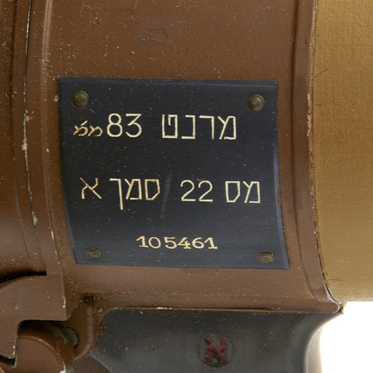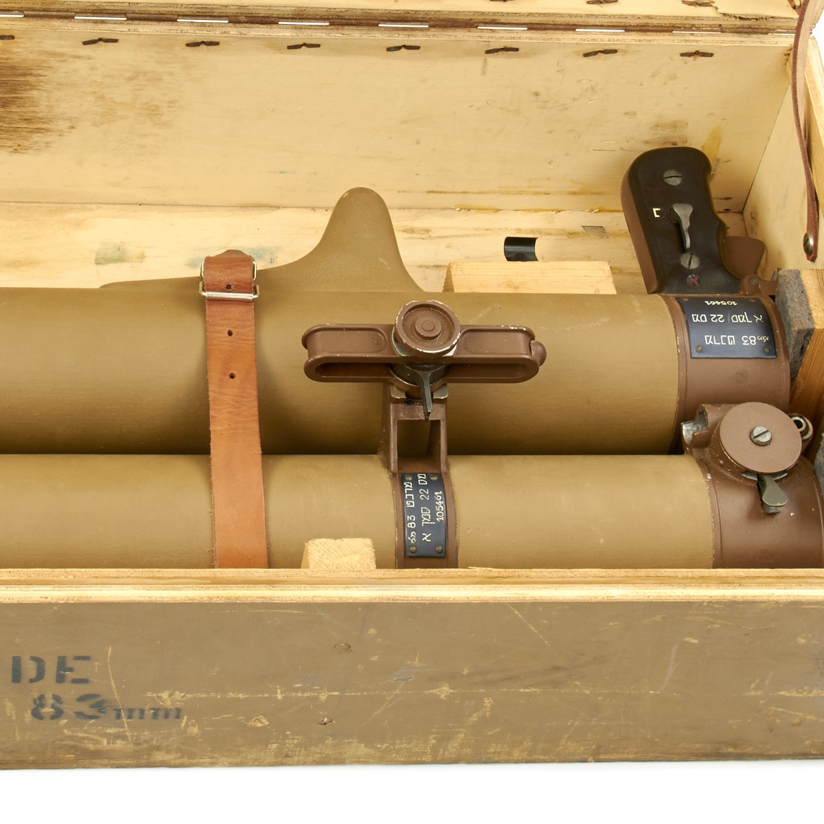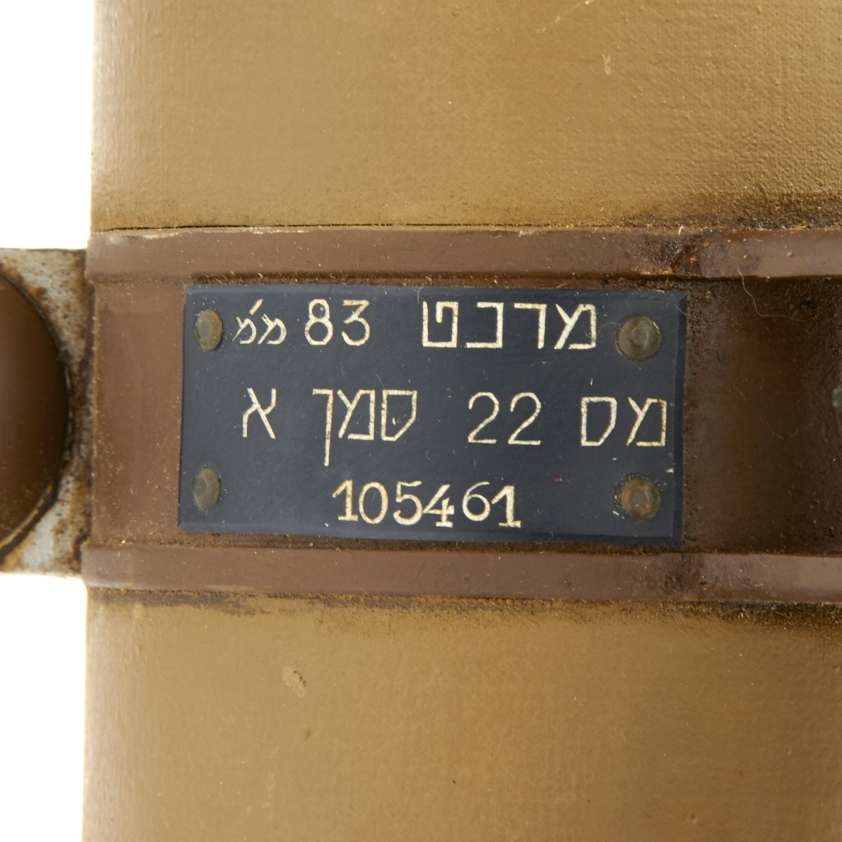 It comes complete with original wood transit chest measuring approximately 45" x 16 1/4" x 8", which still has the original inventory sheet stapled to the inside of the lid. All pieces are offered in excellent near mint condition. It retains the original Israeli data plates, giving the serial number as 105461, and there are lot of markings in Hebrew in various areas, as is correct.