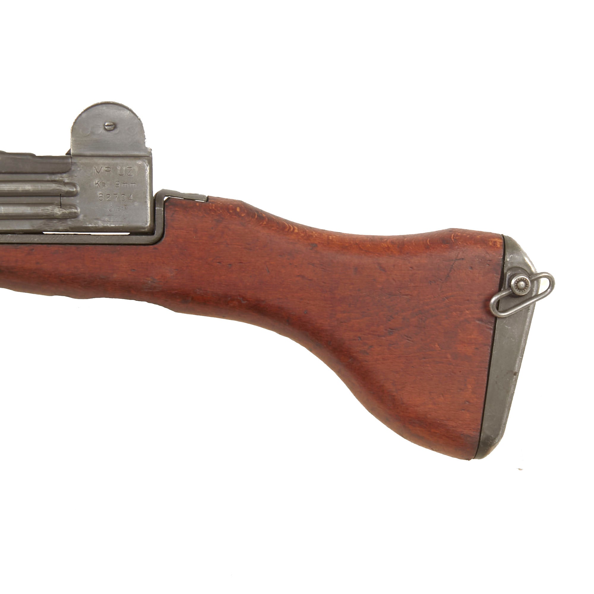 The display gun comes complete with wood shoulder stock, which can be removed, though it takes a bit of wiggling. It comes with an original magazine (not pictured), which will be deactivated where required. The side of the barrel has the serial number 72454, showing that this gun has many different parts from different Uzis.