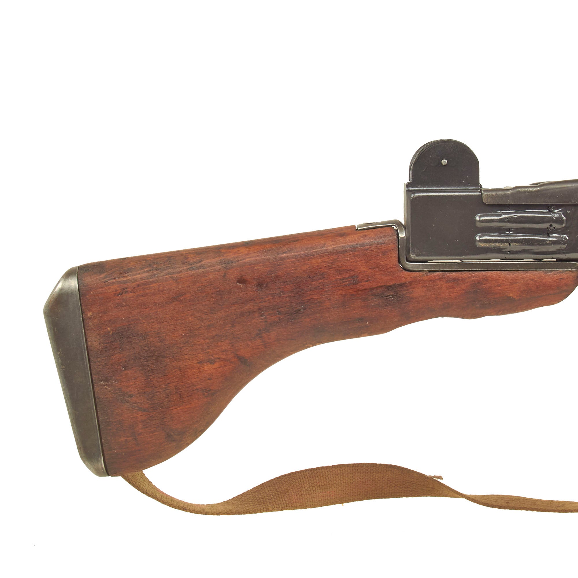 The display gun comes complete with wood shoulder stock. The shoulder stock still slides off relatively easily when the release button is pressed inward. An original early issue canvas (later slings were nylon) sling is attached to the front and rear sling swivels. It also comes with an original magazine, which will be deactivated where required.