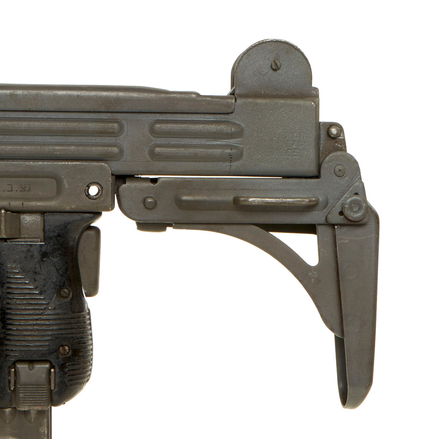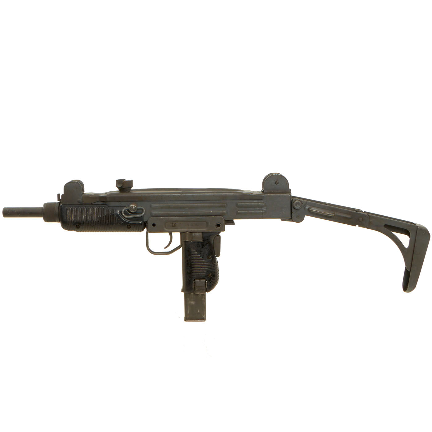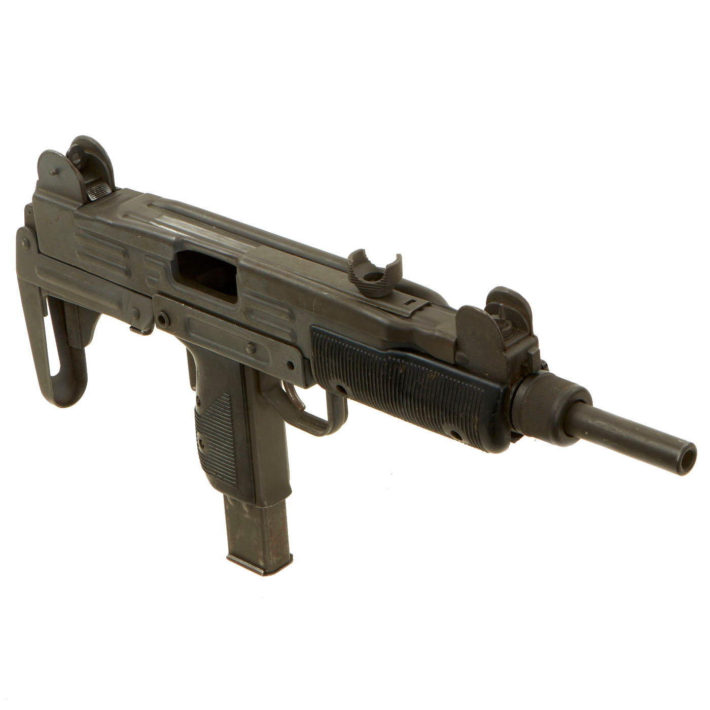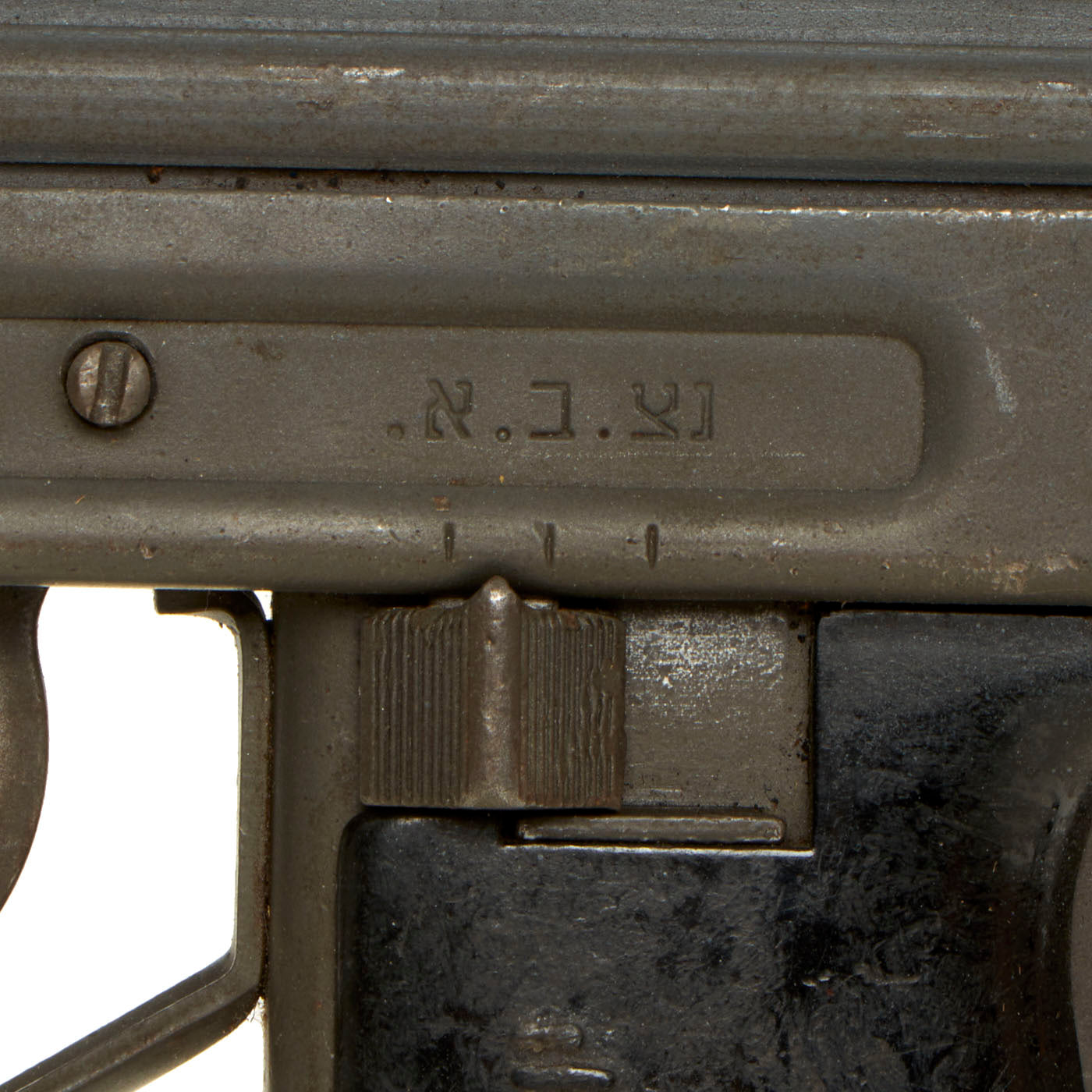 IMA is proud to offer this original Israeli issued UZI display gun constructed of original parts built into non-firing Dummy gun on our all steel BATF approved new made non-firing dummy receiver. The ends of the receiver are original but the center 8 inches are totally newly manufactured. Unfortunately due to wear and oxidation on the original receiver parts used, the original markings are only a ghost, and not legible. However the trigger group has markings in Hebrew, so it is definitely Israeli issue.