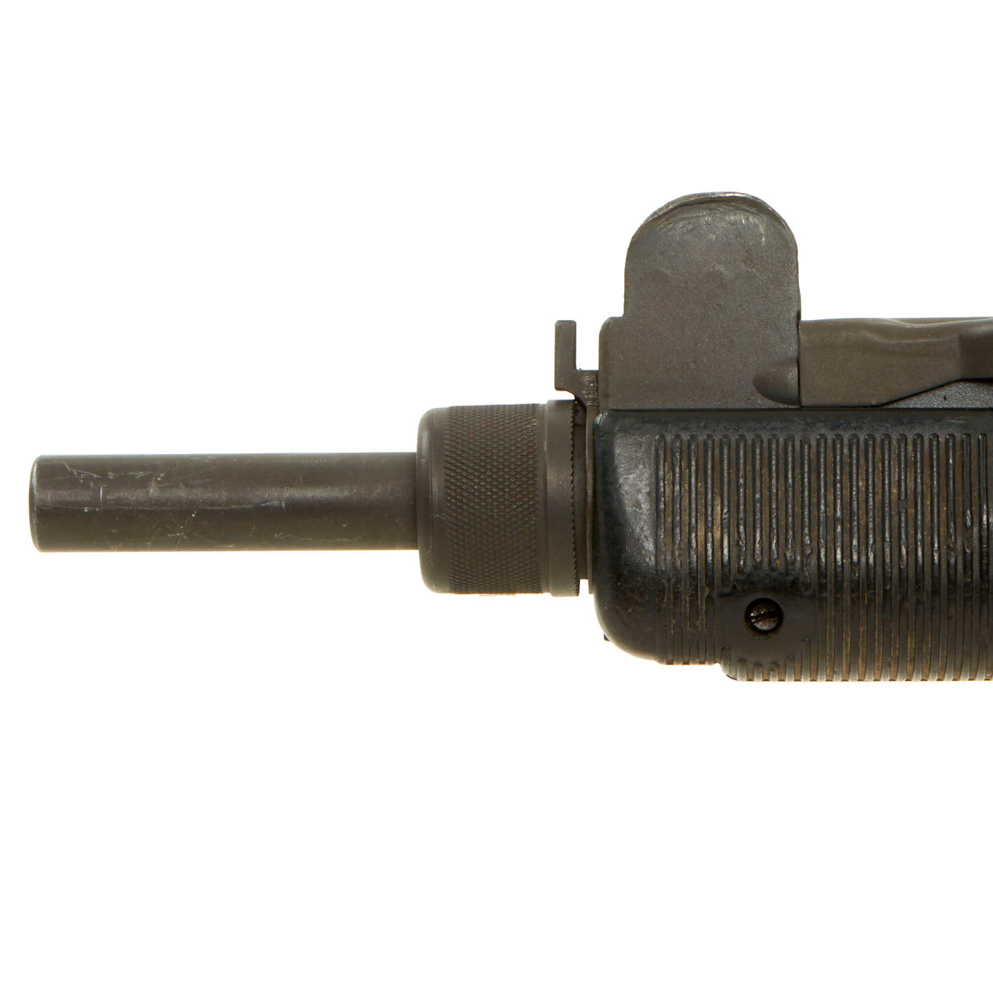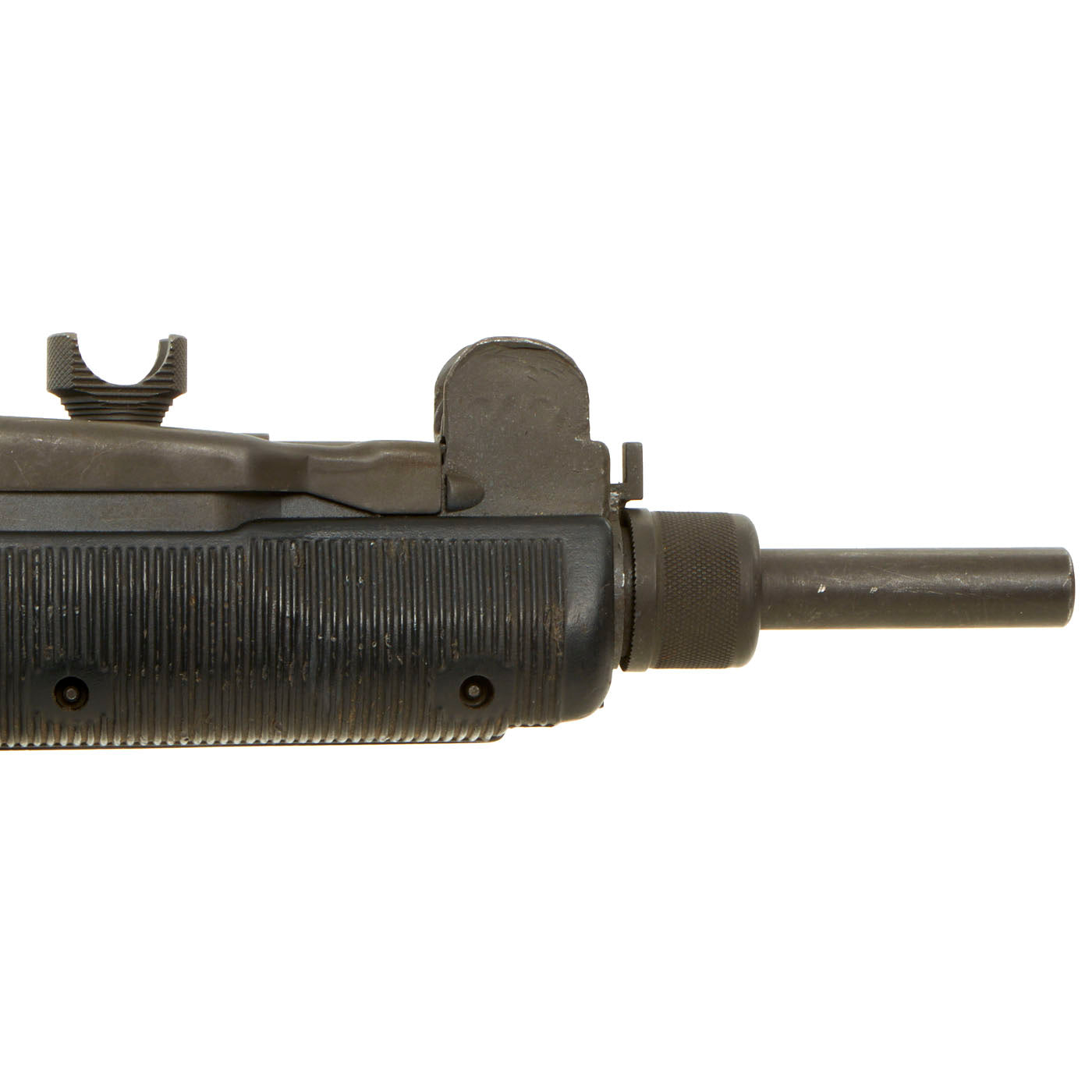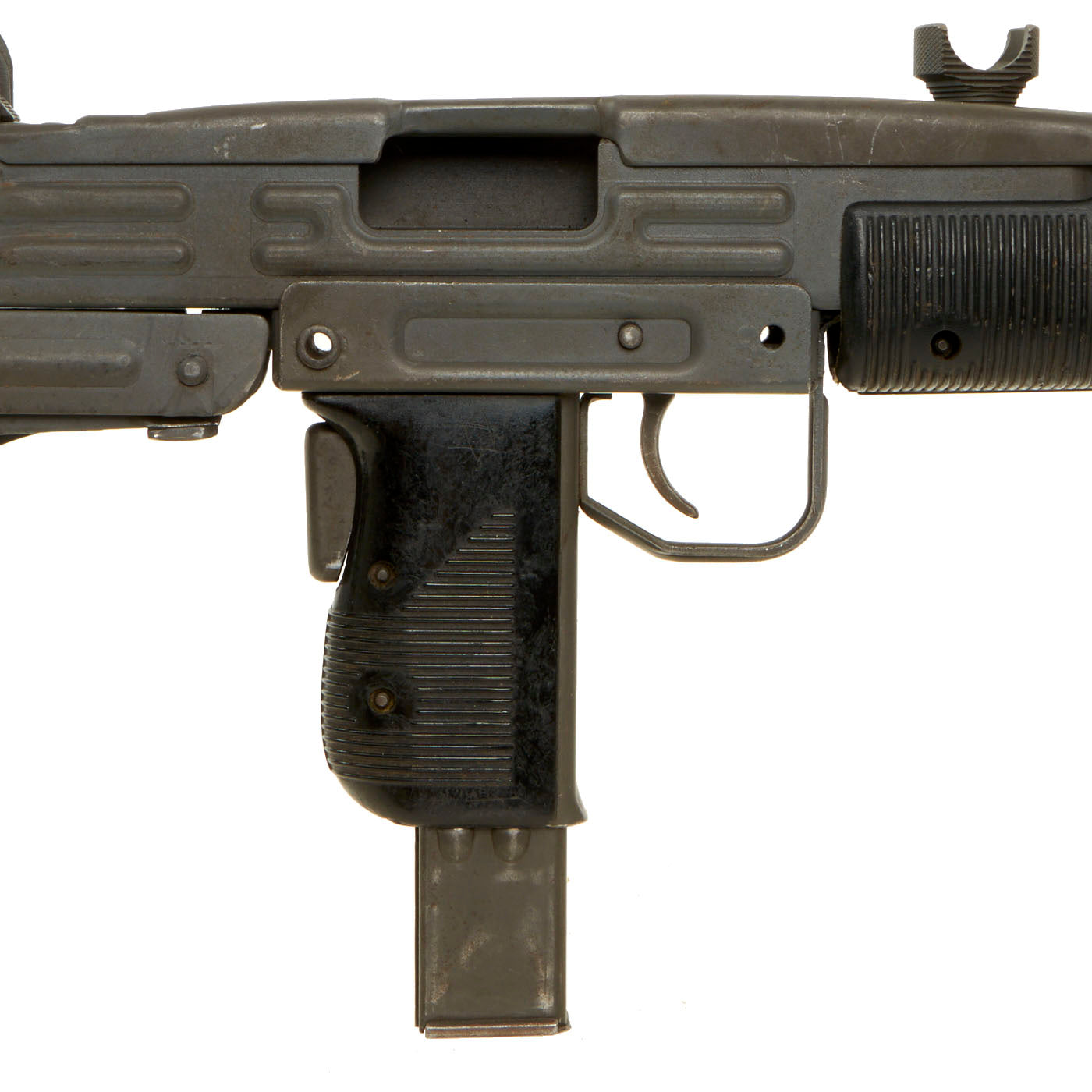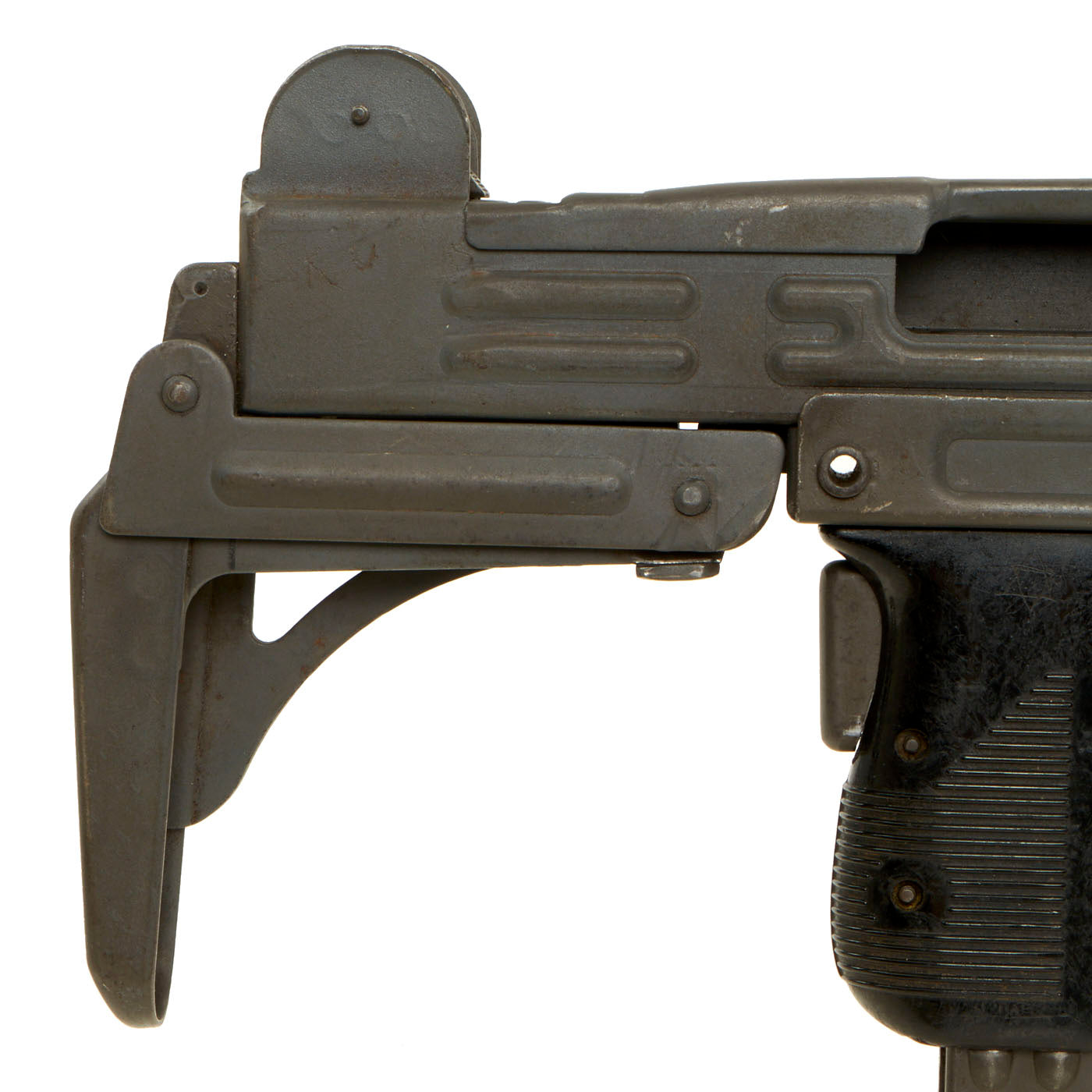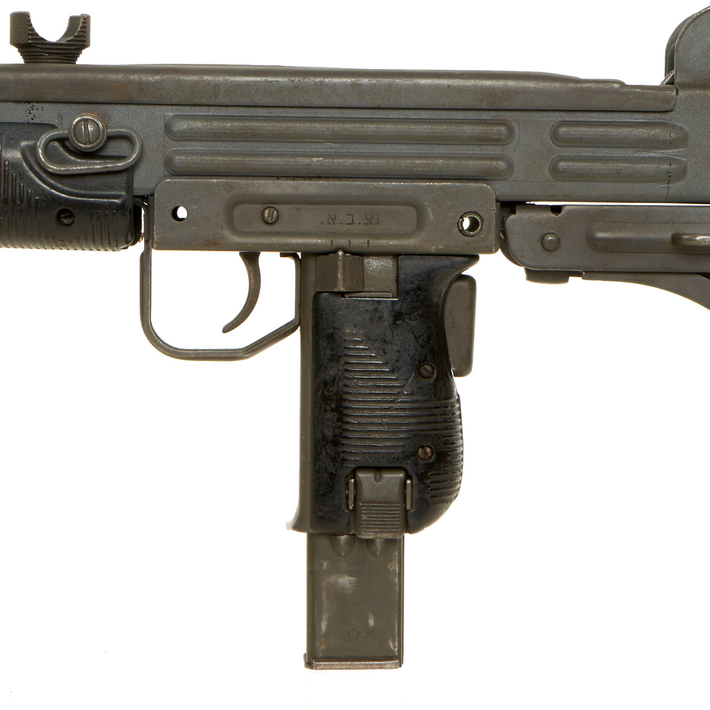 IMA is proud to offer this original Israeli issued UZI display gun constructed of original parts built into non-firing Dummy gun on our all steel BATF approved new made non-firing dummy receiver. The ends of the receiver are original but the center 8 inches are totally newly manufactured. Unfortunately due to wear and oxidation on the original receiver parts used, the original markings are only a ghost, and not legible. However the trigger group has markings in Hebrew, so it is definitely Israeli issue.