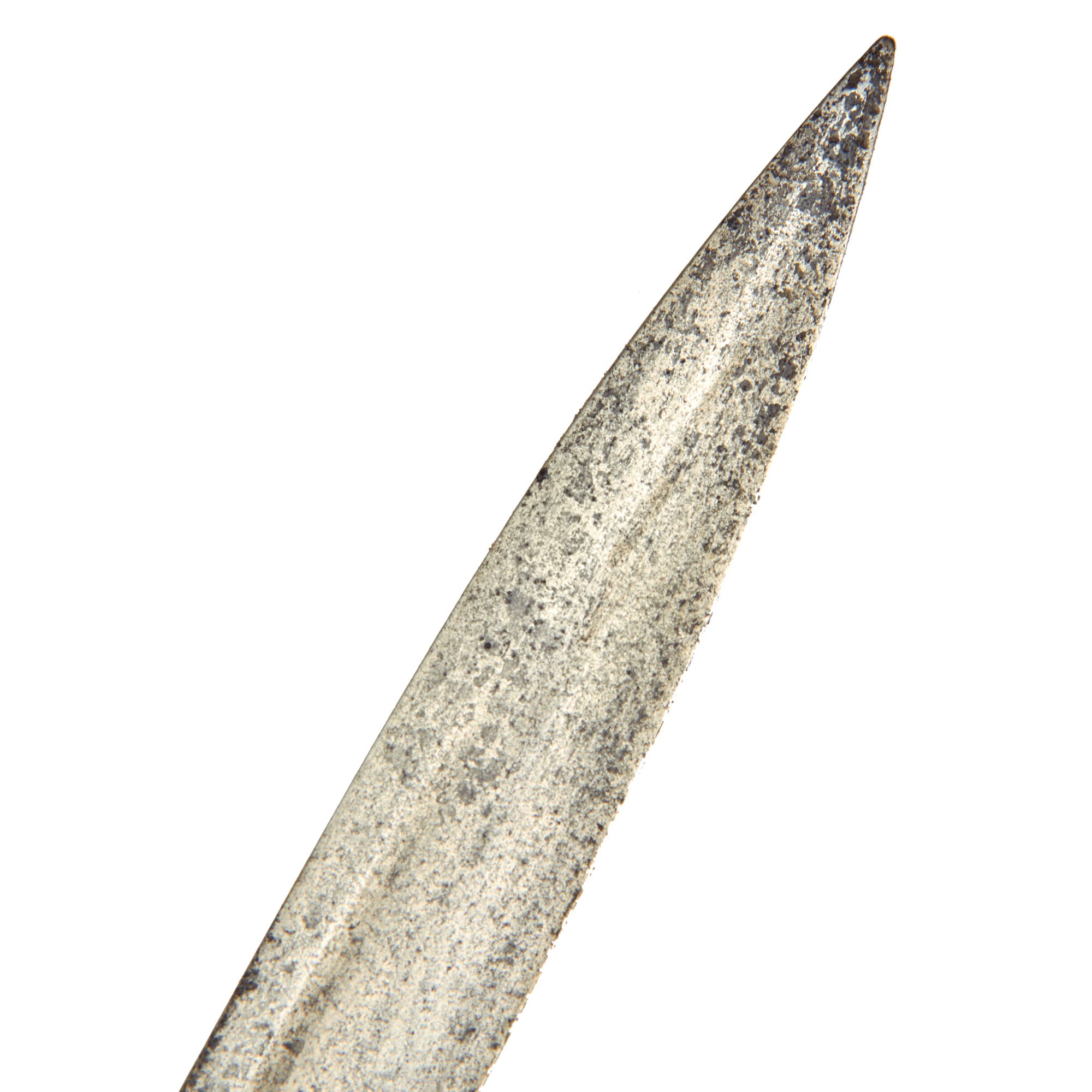 The hilt and scabbard, exposed to the air and elements, have fared a bit worse, with the scabbard showing an overall gray patina, with some pit rusting on the bottom of the drag, most likely from contact with a damp floor. The hilt has a similar gray patina, with some light rust on the pommel cap. The wire wrapped leather grip is in very good condition, showing only light wear, though it was damaged a bit on the back.