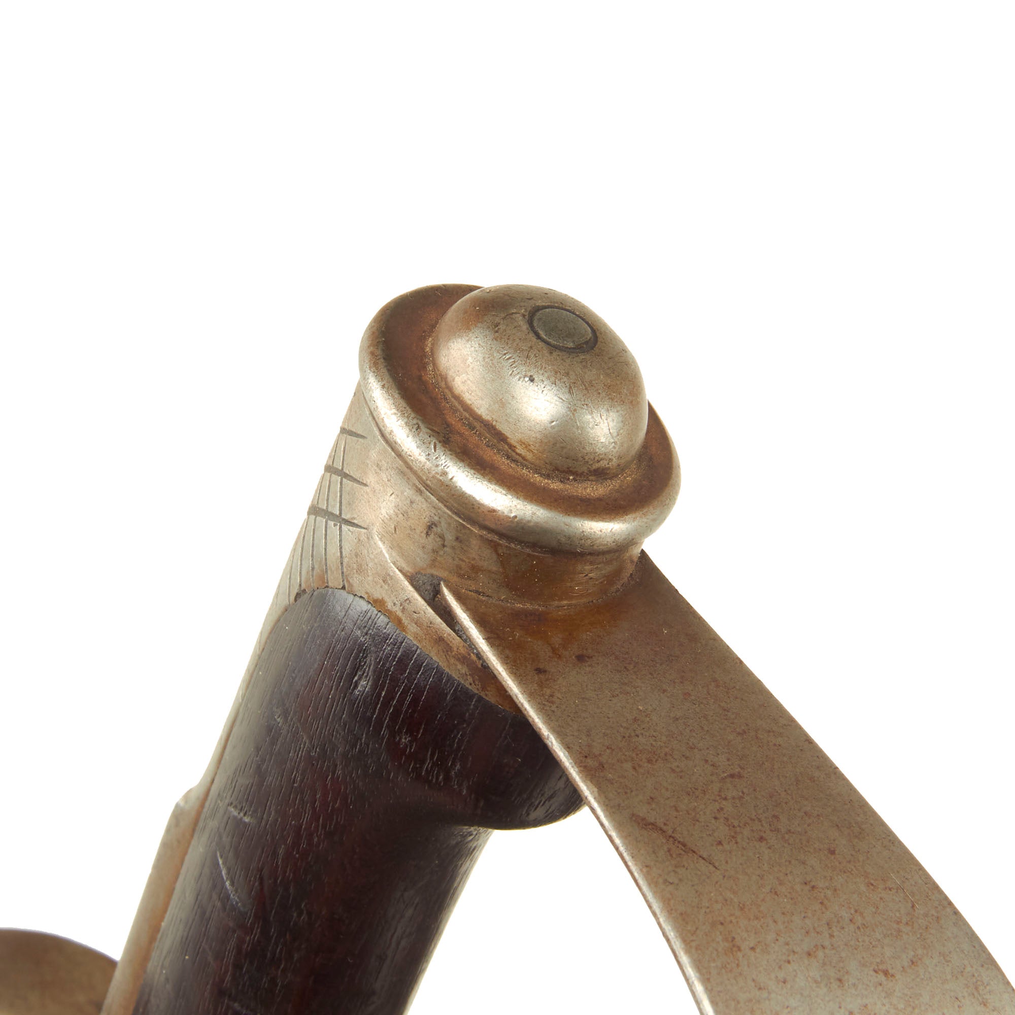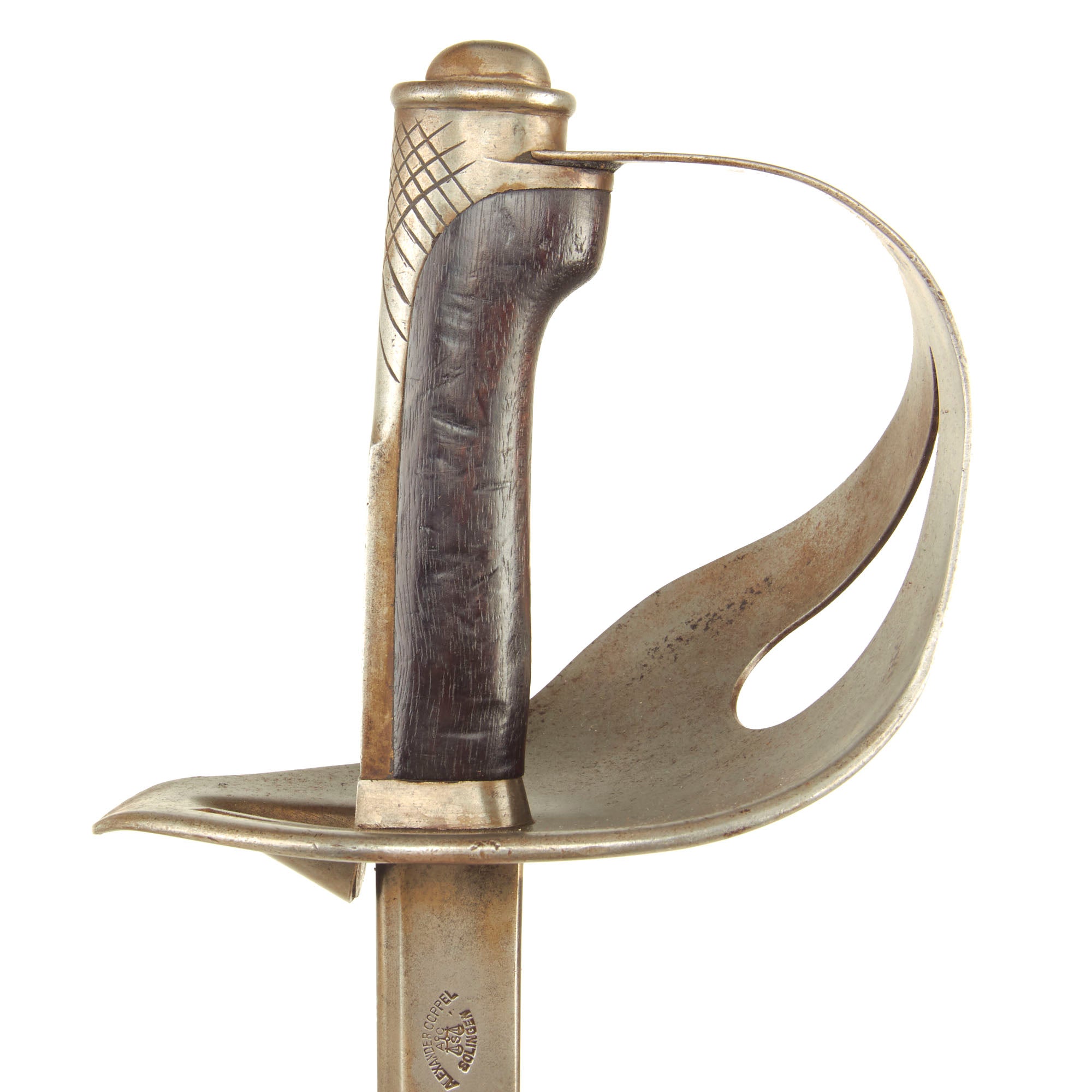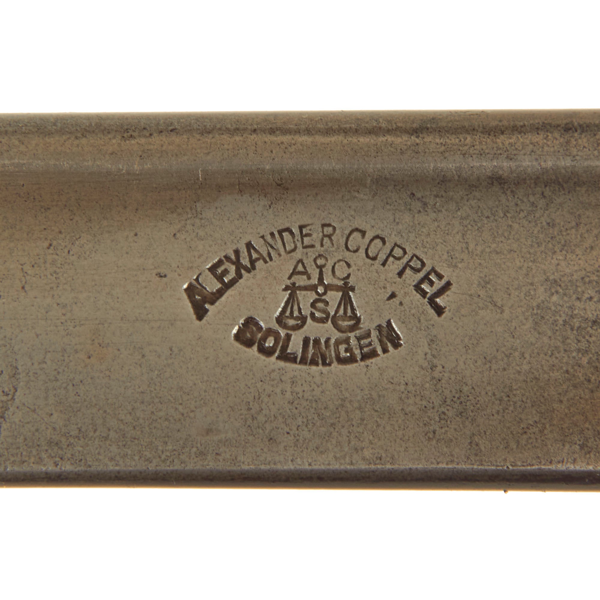 The blade ricasso is maker marked ALEXANDER COPPEL / SOLINGEN, around the trademark "Scales" logo, indicating manufacture by Alexander Coppel & Co. located in the legendary "City of Blades", Solingen. This company made large amounts of export bayonets during the 19th century, and also manufactured bayonets for many years and up through WWII under the name Alcoso. Sadly, as the Coppel family was Jewish, they saw their company stolen from them and "Aryanized" during WWII by the NSDAP. For more information please see J. Anthony Carter’s work GERMAN KNIFE AND SWORD MAKERS.
