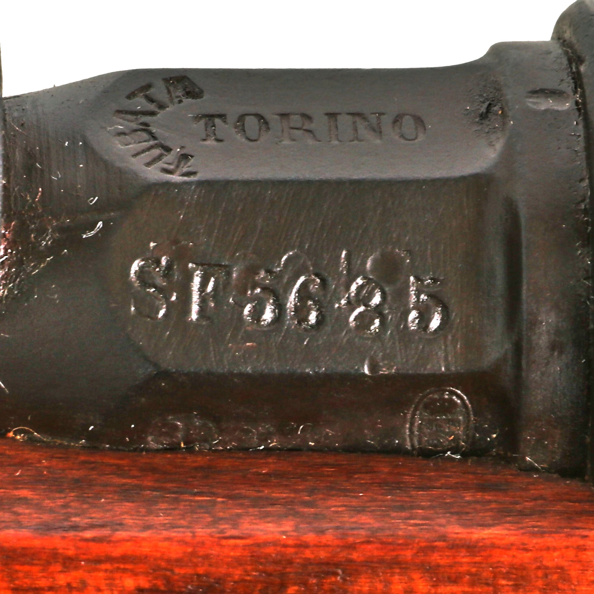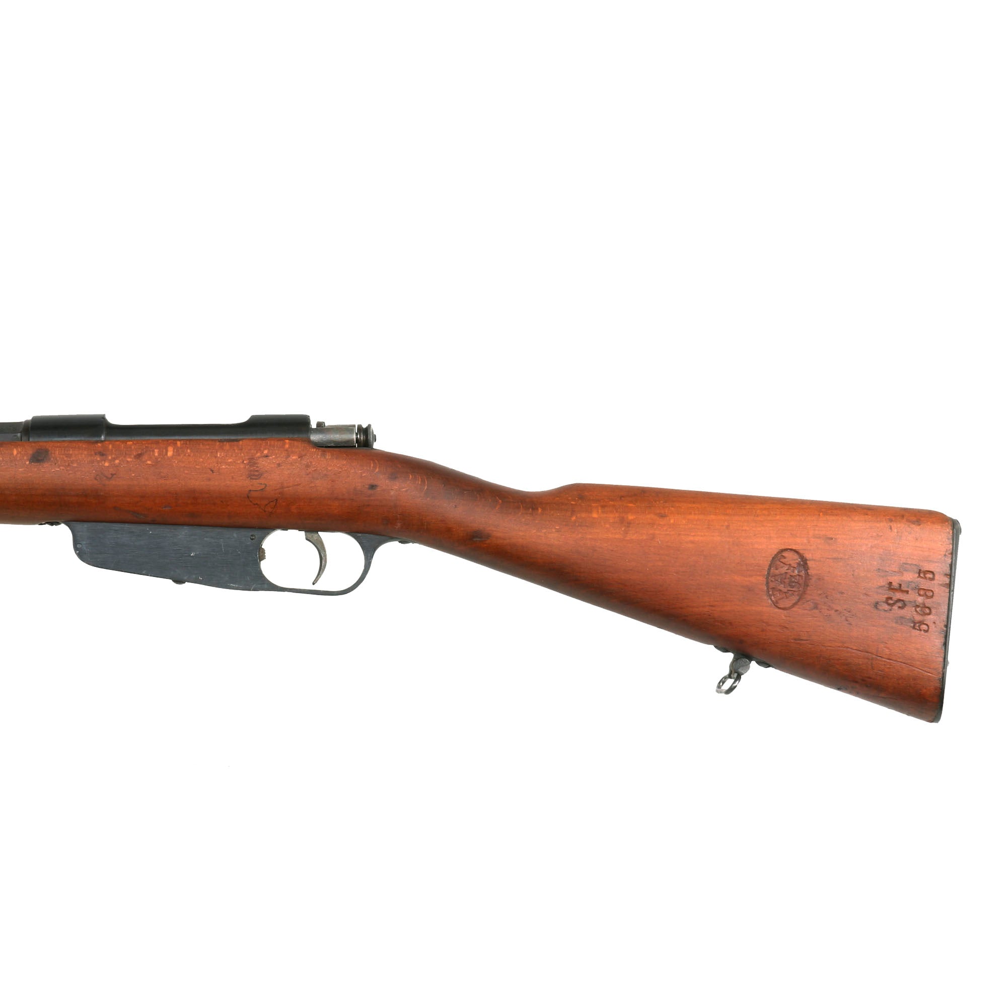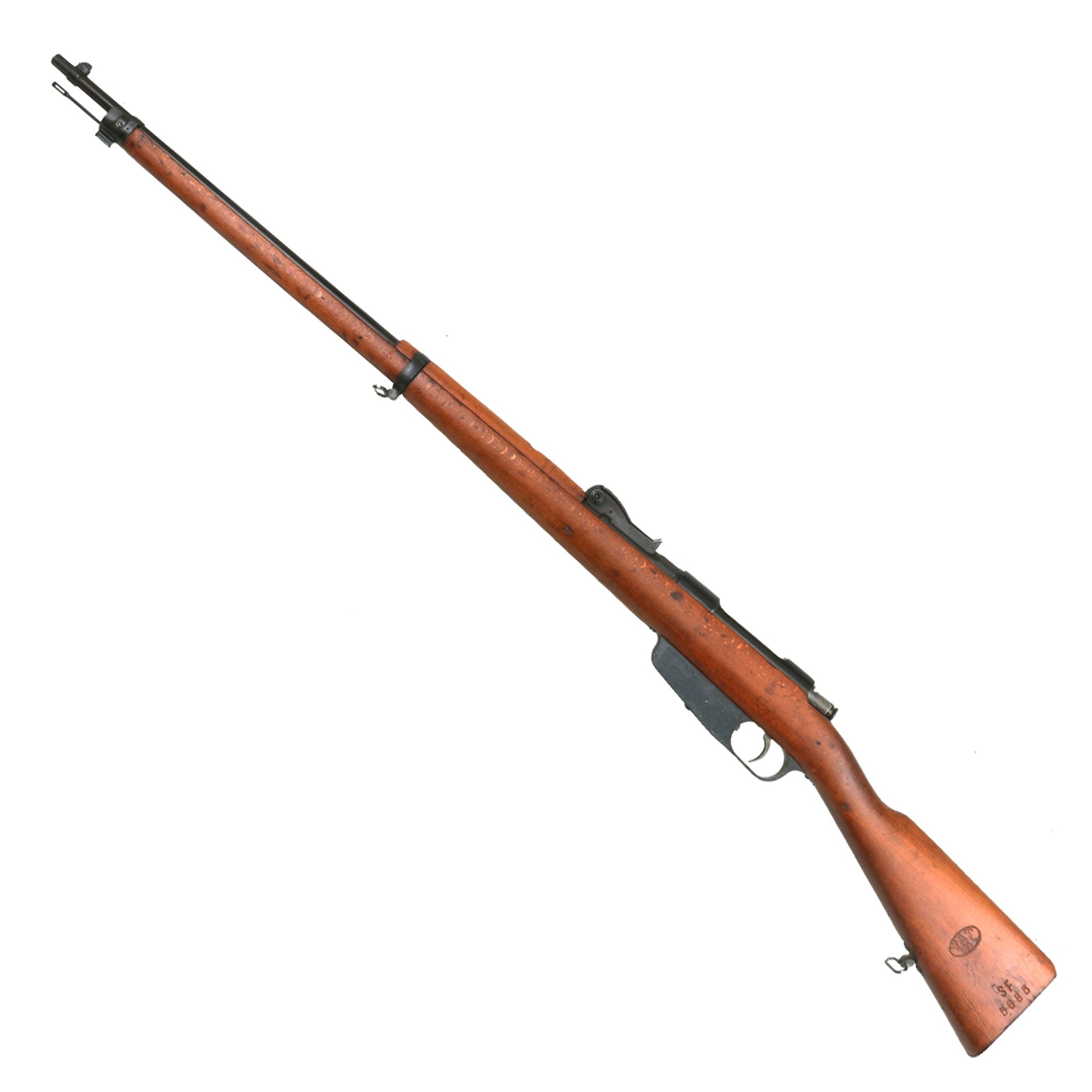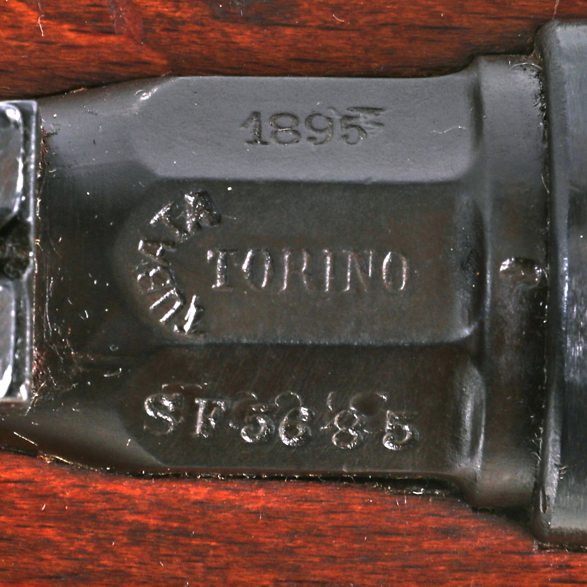 This is a fine example of the earliest version of the Carcano Rifle, the Fucile di Fanteria Modello 1891 (infantry rifle Model 1891), which used a standard detachable blade bayonet. Later versions would experiment with bayonets that had folding blades, with limited success. The barrel nocks form is marked on the left side with serial number SF 5683 7533, and on the top it is marked TORINO, indicating that the rifle was produced at Turin Arsenal in the mountains of Northwest Italy. The other side of the knoxform is marked with the date of manufacture, 1895.