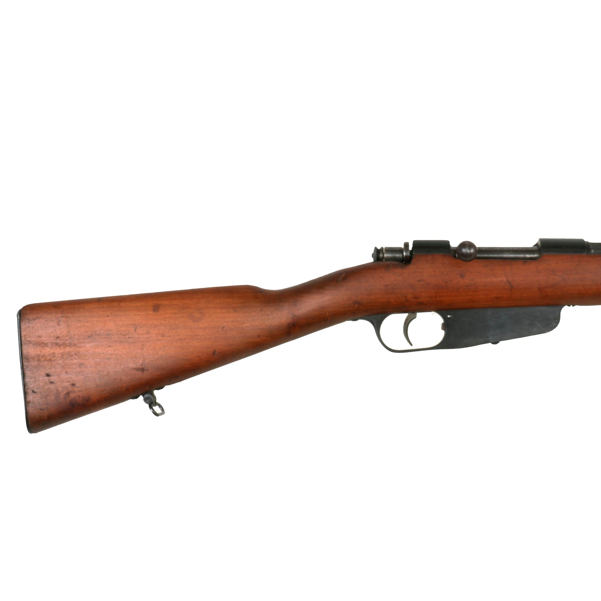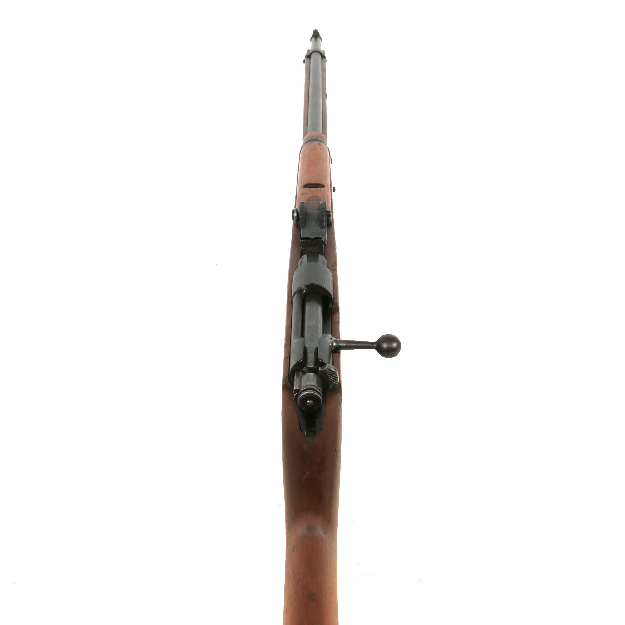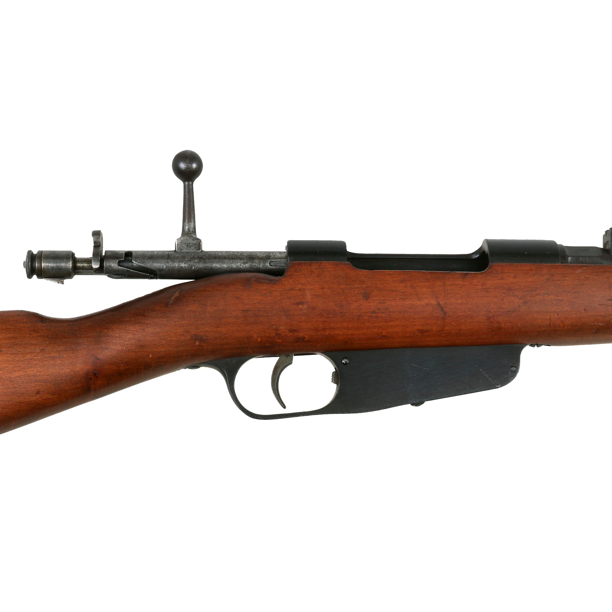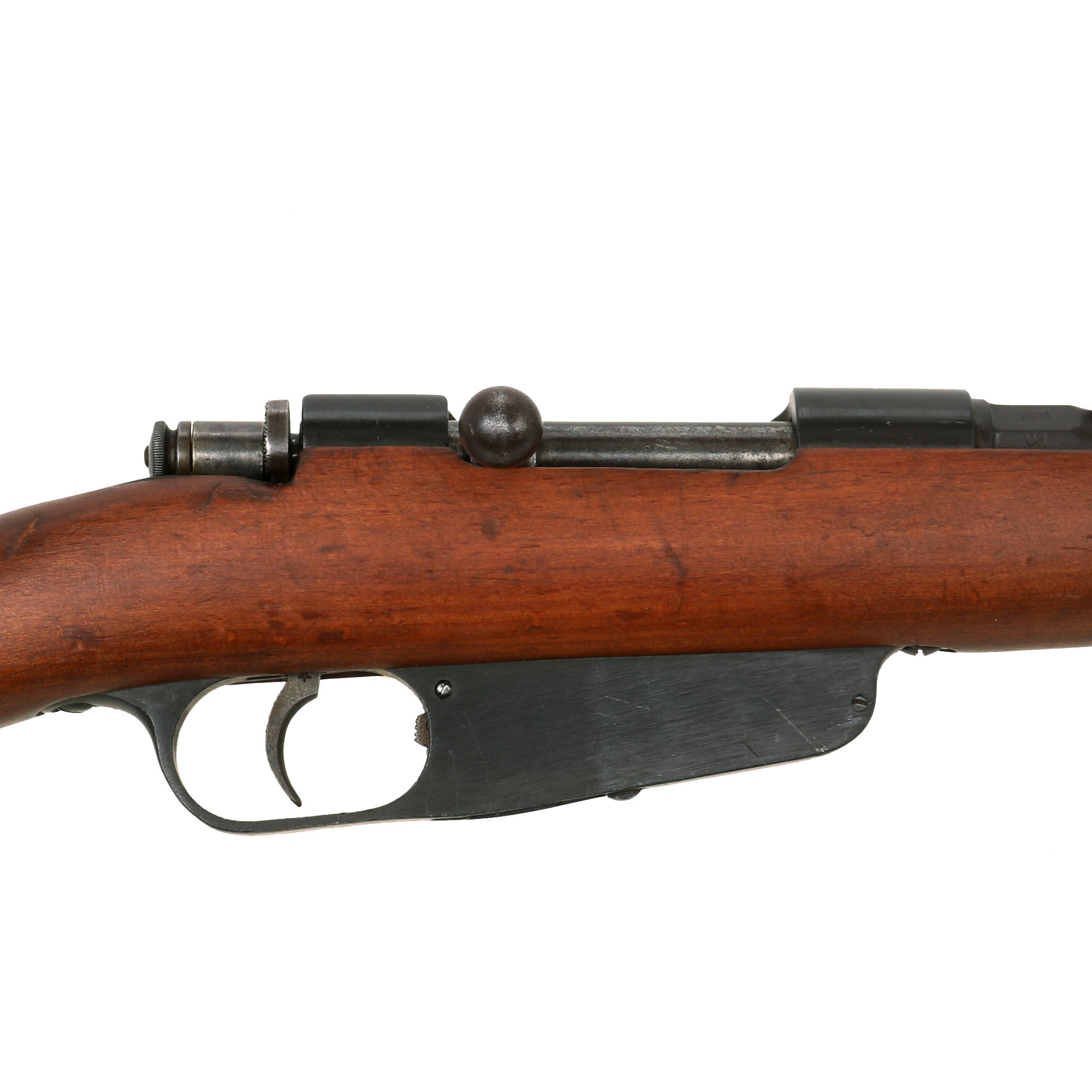 This is a fine example of the earliest version of the Carcano Rifle, the Fucile di Fanteria Modello 1891 (infantry rifle Model 1891), which used a standard detachable blade bayonet. Later versions would experiment with bayonets that had folding blades, with limited success. The barrel nocks form is marked on the left side with serial number SF 5683 7533, and on the top it is marked TORINO, indicating that the rifle was produced at Turin Arsenal in the mountains of Northwest Italy. The other side of the knoxform is marked with the date of manufacture, 1895.