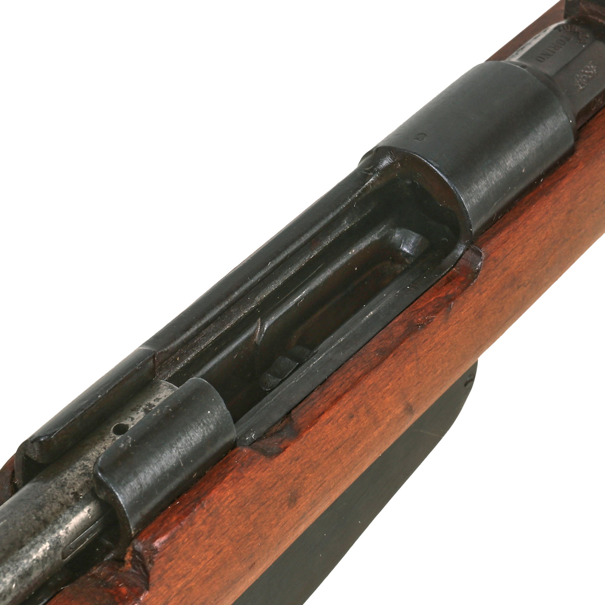 In an arc over the maker is TUBATA, Italian for "tubed", indicating that the barrel was reconditioned and sleeved at arsenal due to wear from the very hot and corrosive Ballistite Loaded ammunition used early on. The process was quite durable, and re-tubed barrels returned to front line service without issue. As it is now, the rifle has a very good bore with with a mostly bright finish and strong lands and grooves. There is just a bit of fouling and wear overall.