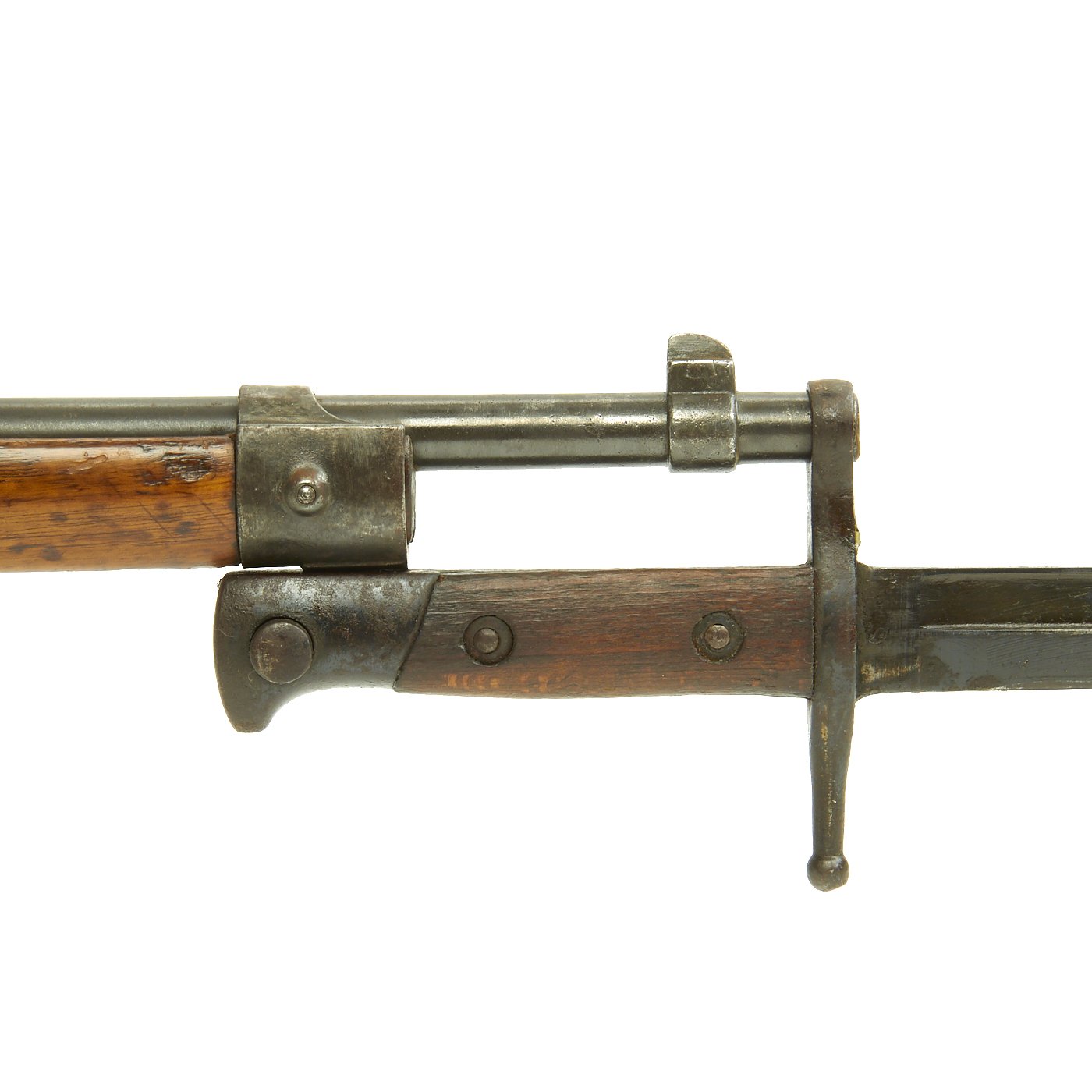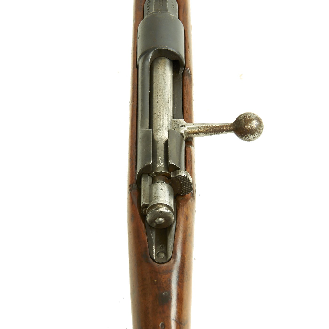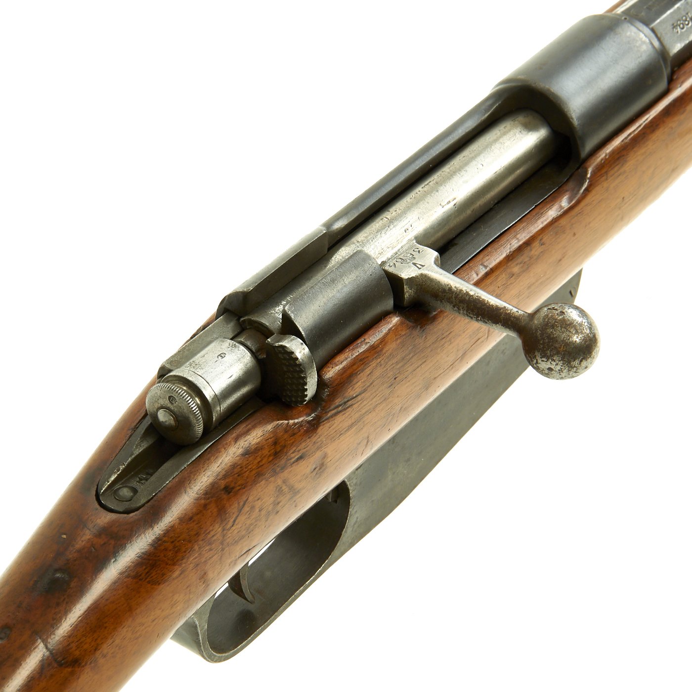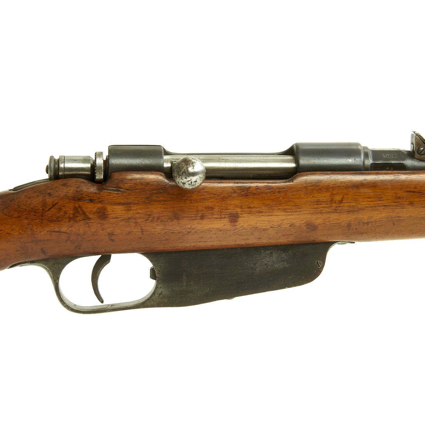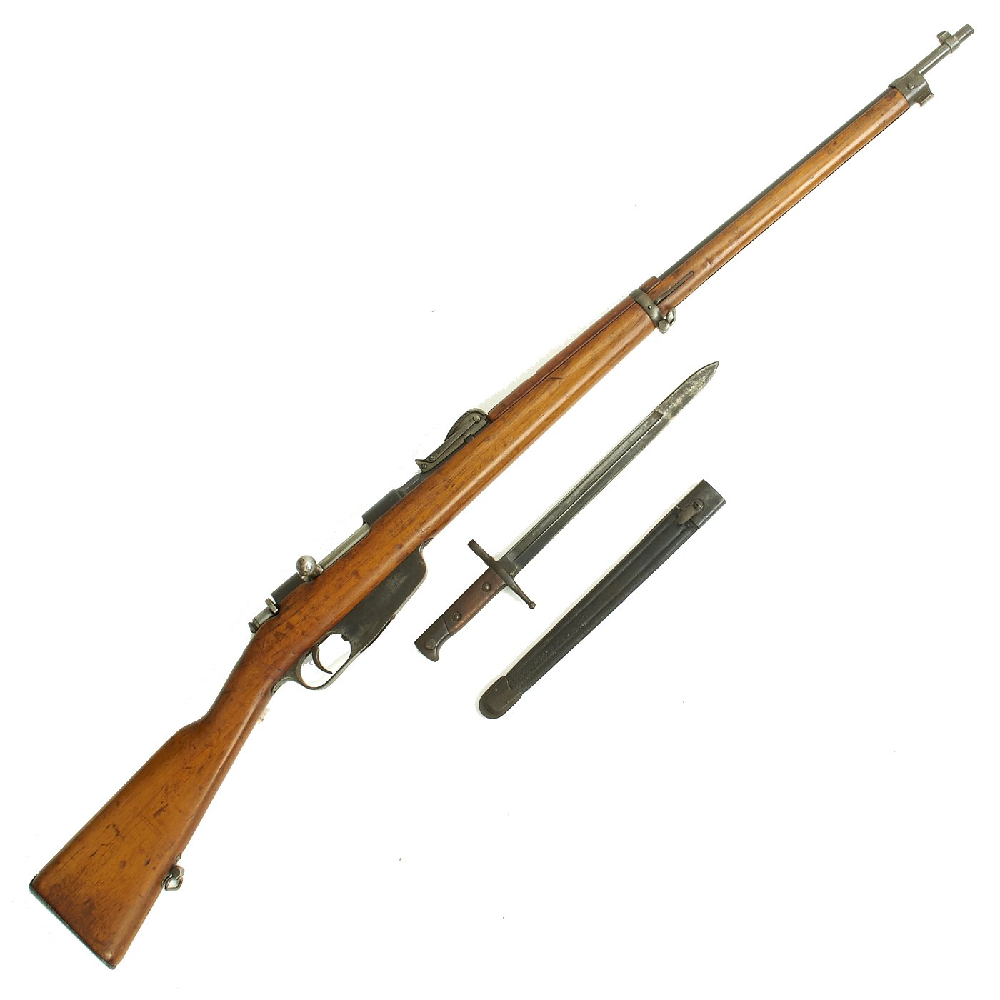 This is a fine example of the earliest version of the Carcano Rifle, the Fucile di Fanteria Modello 1891 (infantry rifle Model 1891), which uses a standard detachable blade bayonet like the example included with this rifle. Later versions would experiment with bayonets that had folding blades, with limited success. The barrel knoxform is marked on the side with serial number PQ 3564, and on the top it is marked TERNI, indicating that the rifle was produced at the Terni Arsenal in Central Italy. The other side of the knoxform is marked with the date of manufacture, 1894.