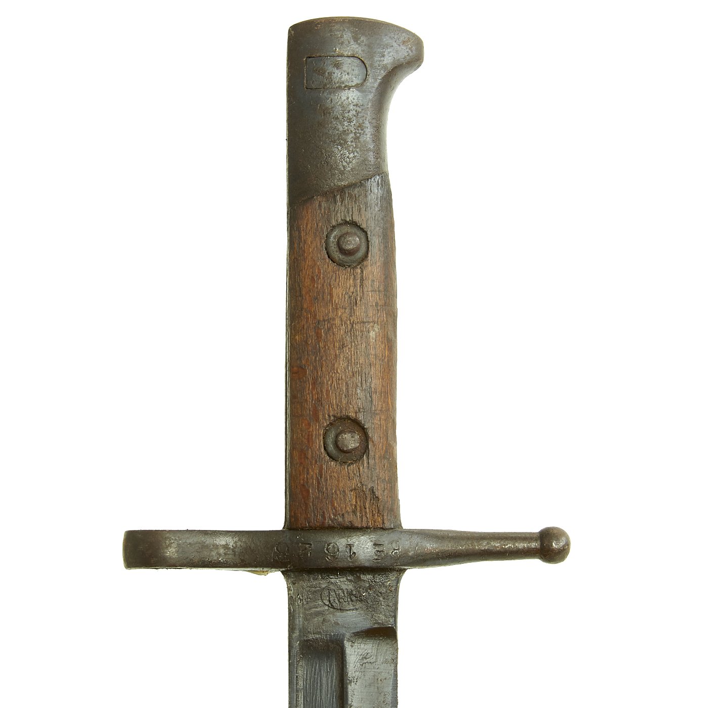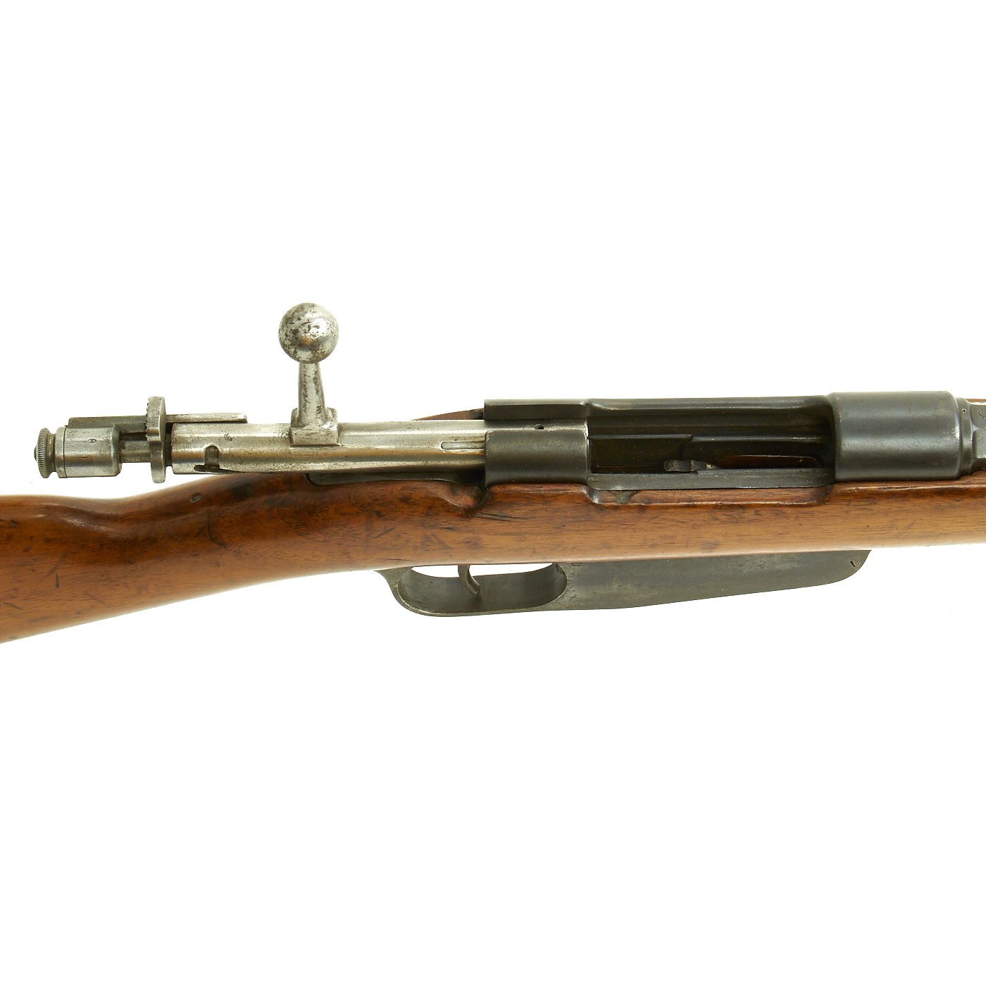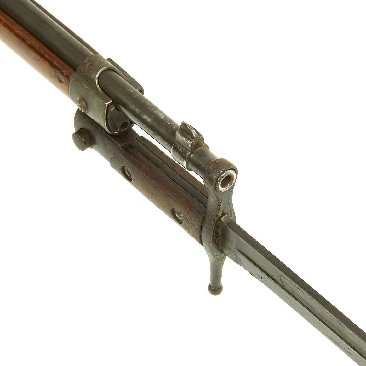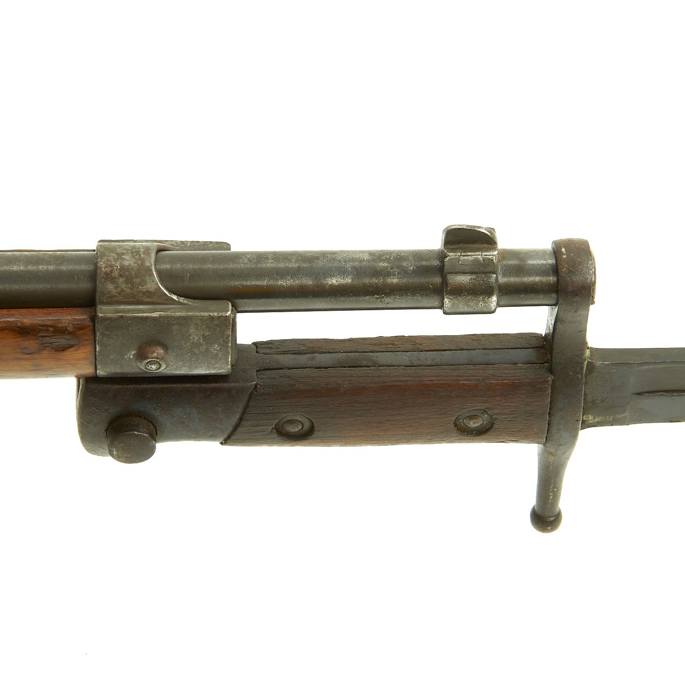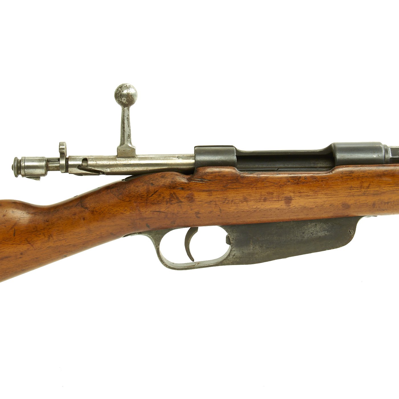 This is a fine example of the earliest version of the Carcano Rifle, the Fucile di Fanteria Modello 1891 (infantry rifle Model 1891), which uses a standard detachable blade bayonet like the example included with this rifle. Later versions would experiment with bayonets that had folding blades, with limited success. The barrel knoxform is marked on the side with serial number PQ 3564, and on the top it is marked TERNI, indicating that the rifle was produced at the Terni Arsenal in Central Italy. The other side of the knoxform is marked with the date of manufacture, 1894.