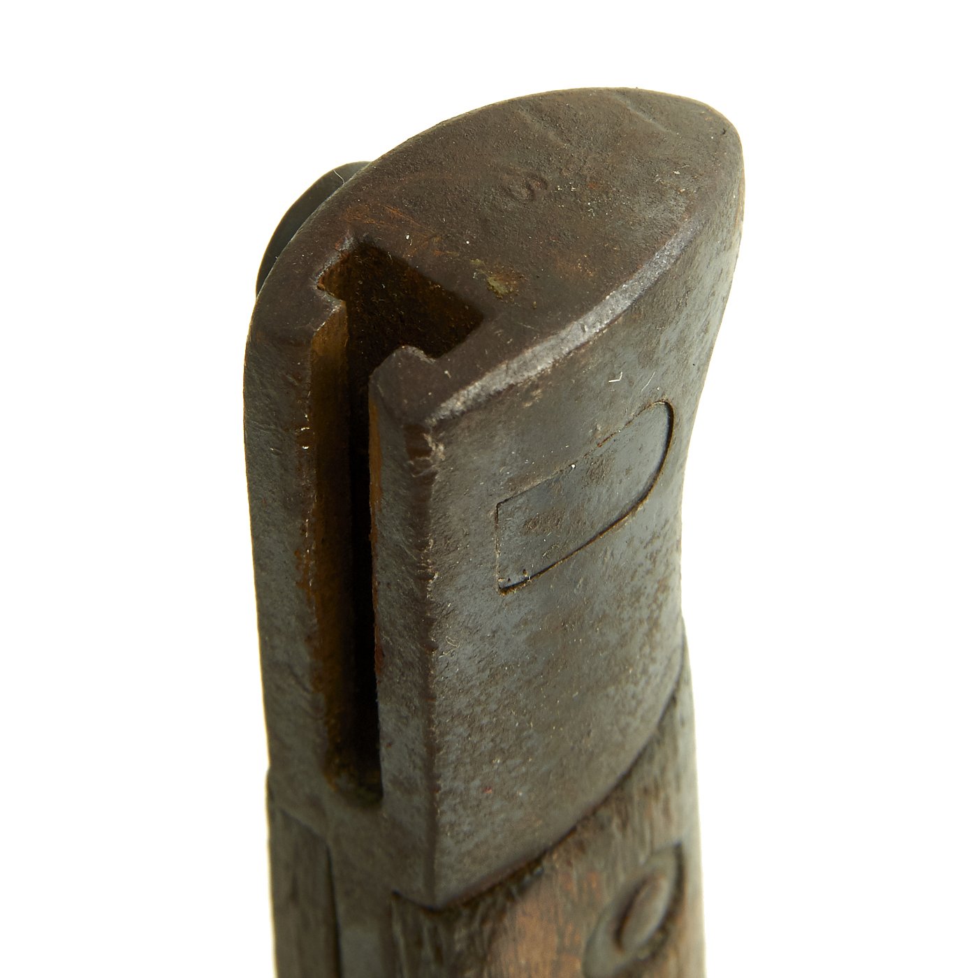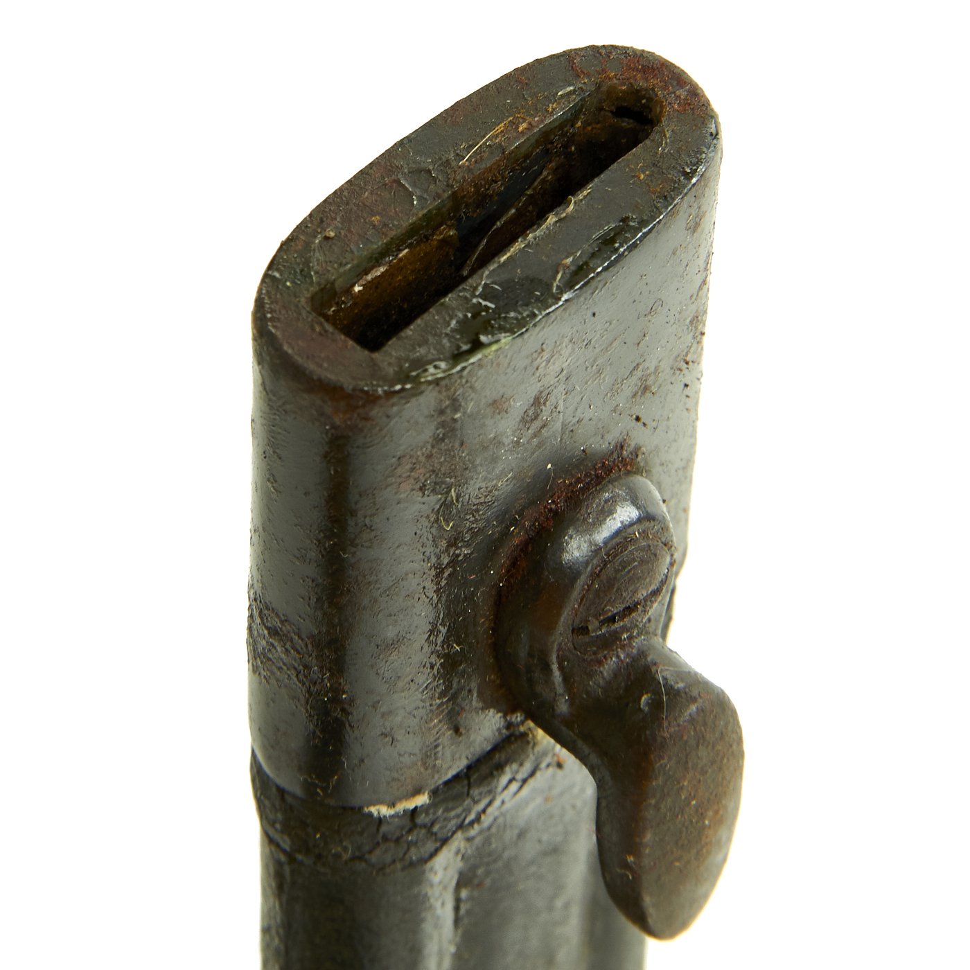 The included bayonet is in good condition, showing a lot of wear from service, but no evidence of being reconditioned at arsenal. It is also marked TERNI, though the serial number does not match, so it is not the bayonet that was originally fitted to the rifle, though it definitely does fit. It shows wear to the grip scales, and has been sharpened. The included steel fitted scabbard shows some leather deterioration, but still fits the bayonet nicely.