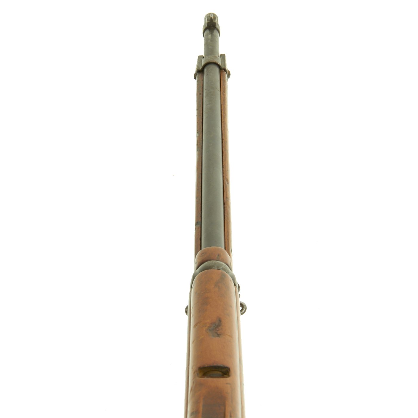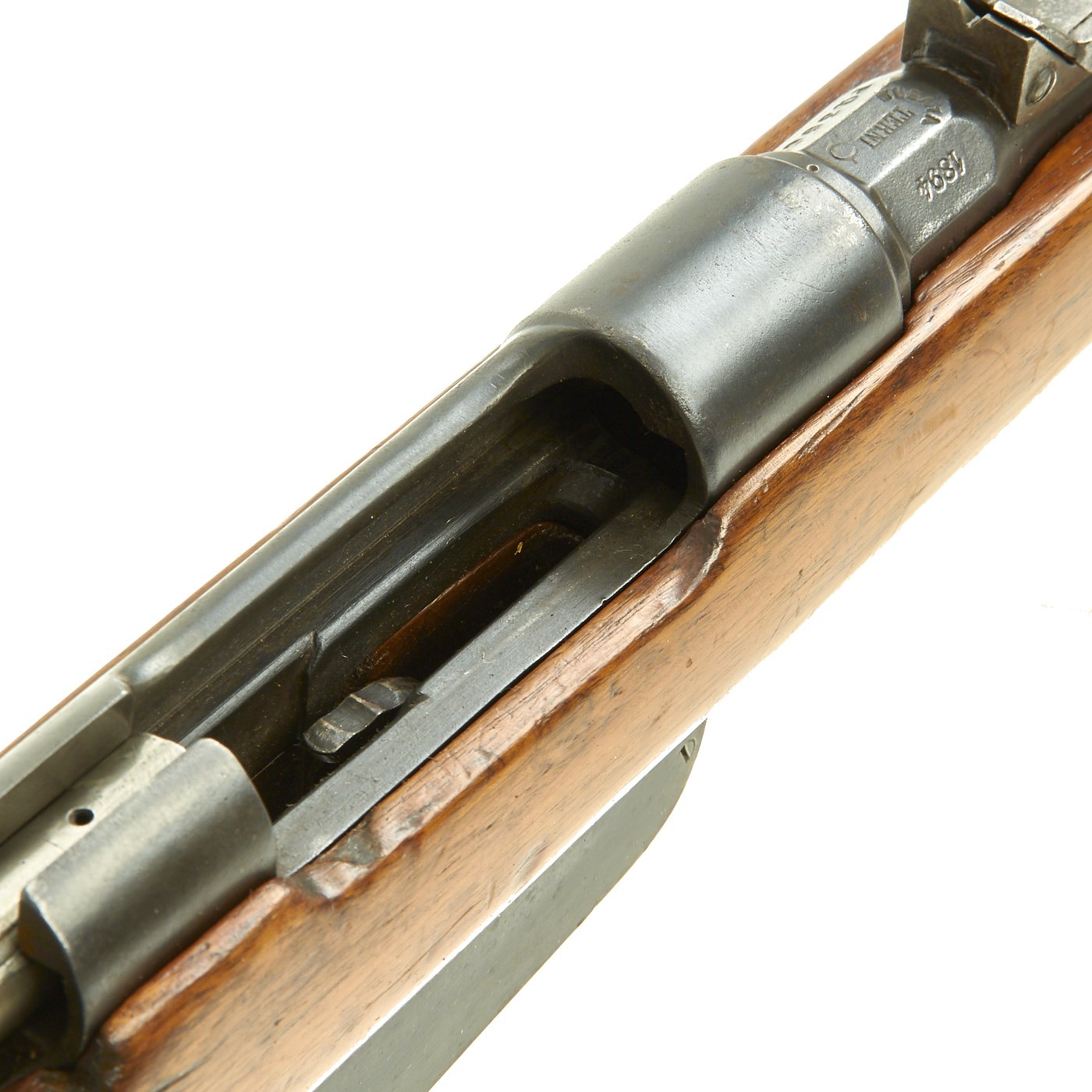 The stocks are in good condition, with a great color and some minor wear. The Serial numbers on the stock does not match the receiver, so this is definitely a rifle that was in service and reconditioned at least once, probably when the barrel was sleeved. Left side buttstock has two faint arsenal cartouches. The metalwork has lots of the original blued finish, with just a bit of rust peppering and wear from service.