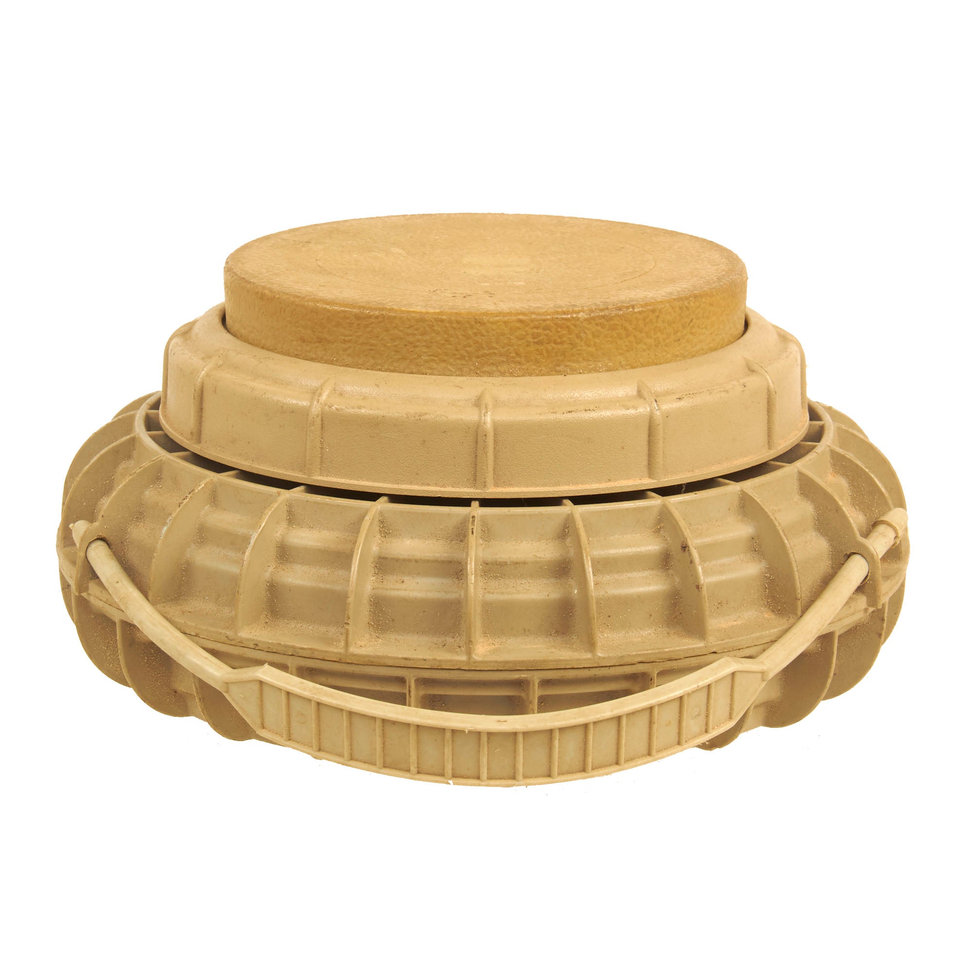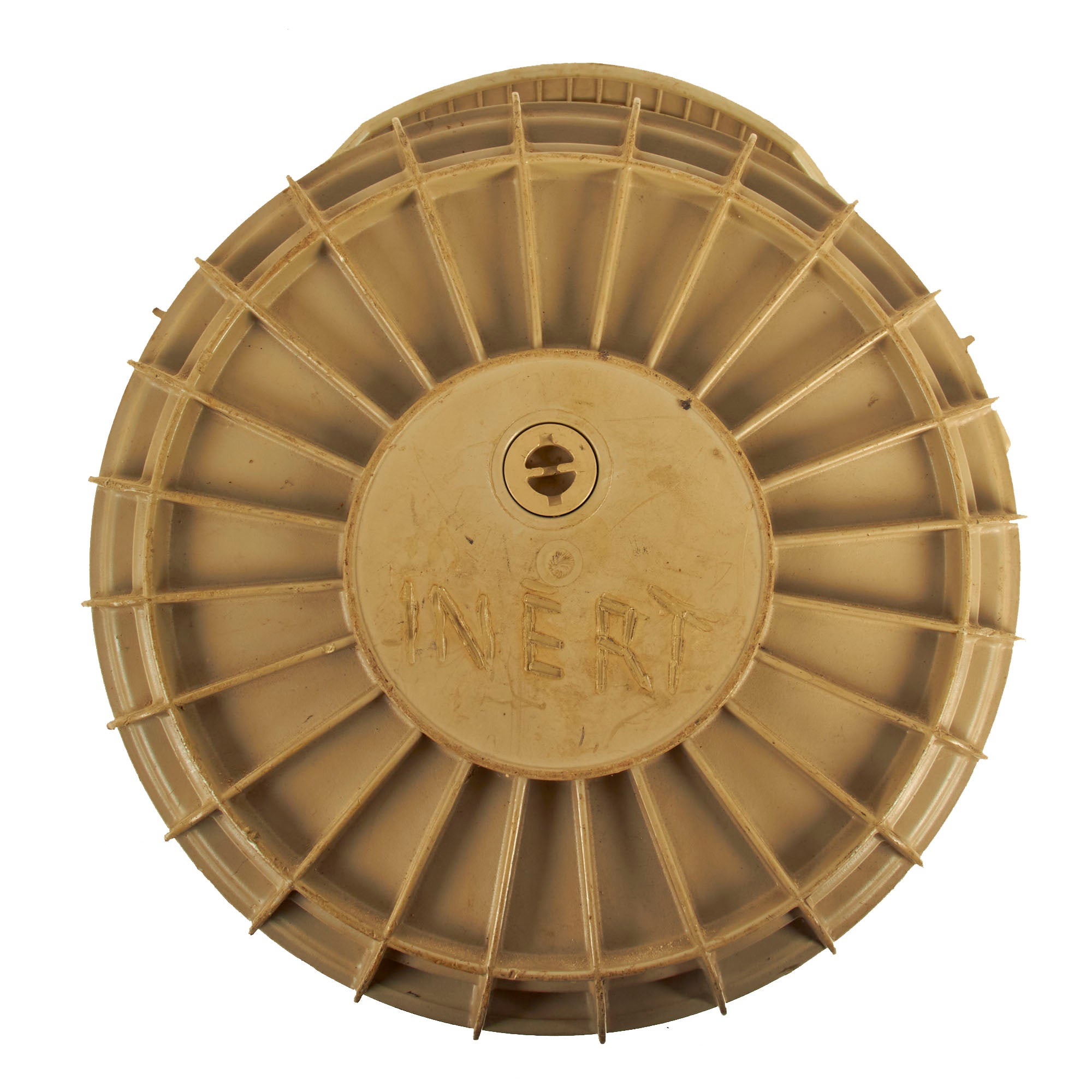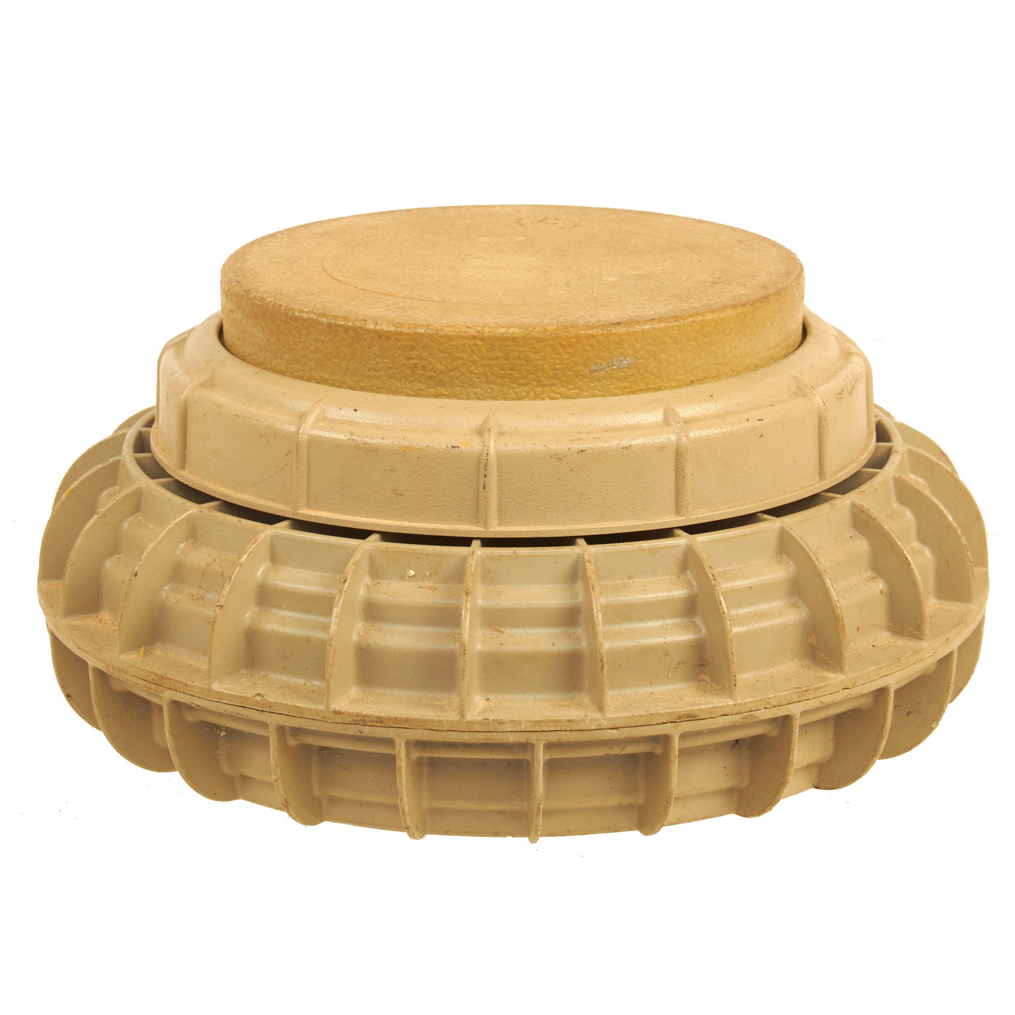 This mine has a secondary fuze well on the bottom (where it cannot be seen) which is slightly off-set from the center of the mine. This secondary fuze well can easily be fitted with a pull-fuze which functions as an anti-handling device.