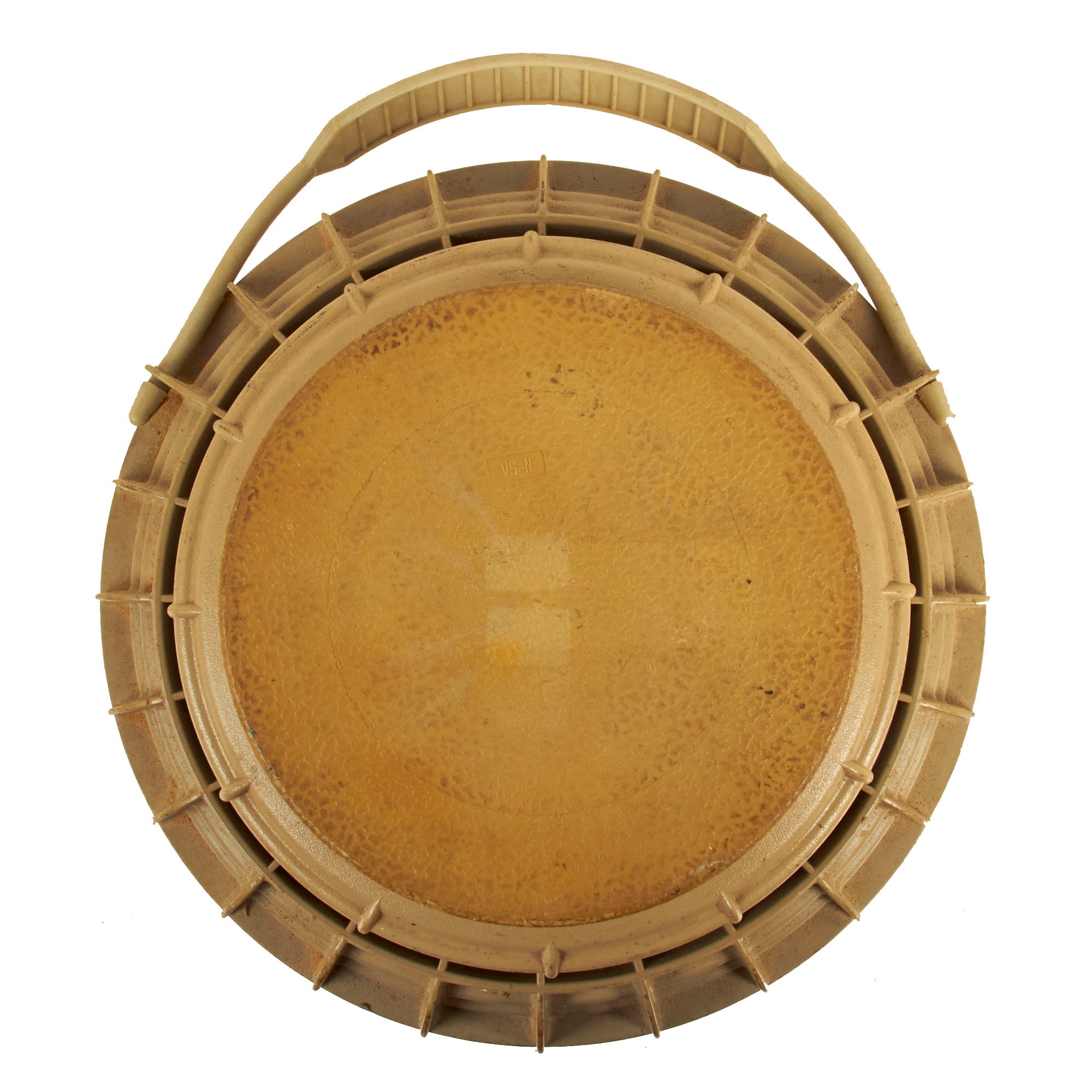 The mines are normally olive green or sand coloured like this one and are circular. The VS-2.2 and VS-3.6 consist of a ribbed main body containing the main charge and a large circular VS-N fuze which sits on top. The SH-55 is larger, and the circular main body is not as ribbed, it uses the same VS-N fuse as the other mines.