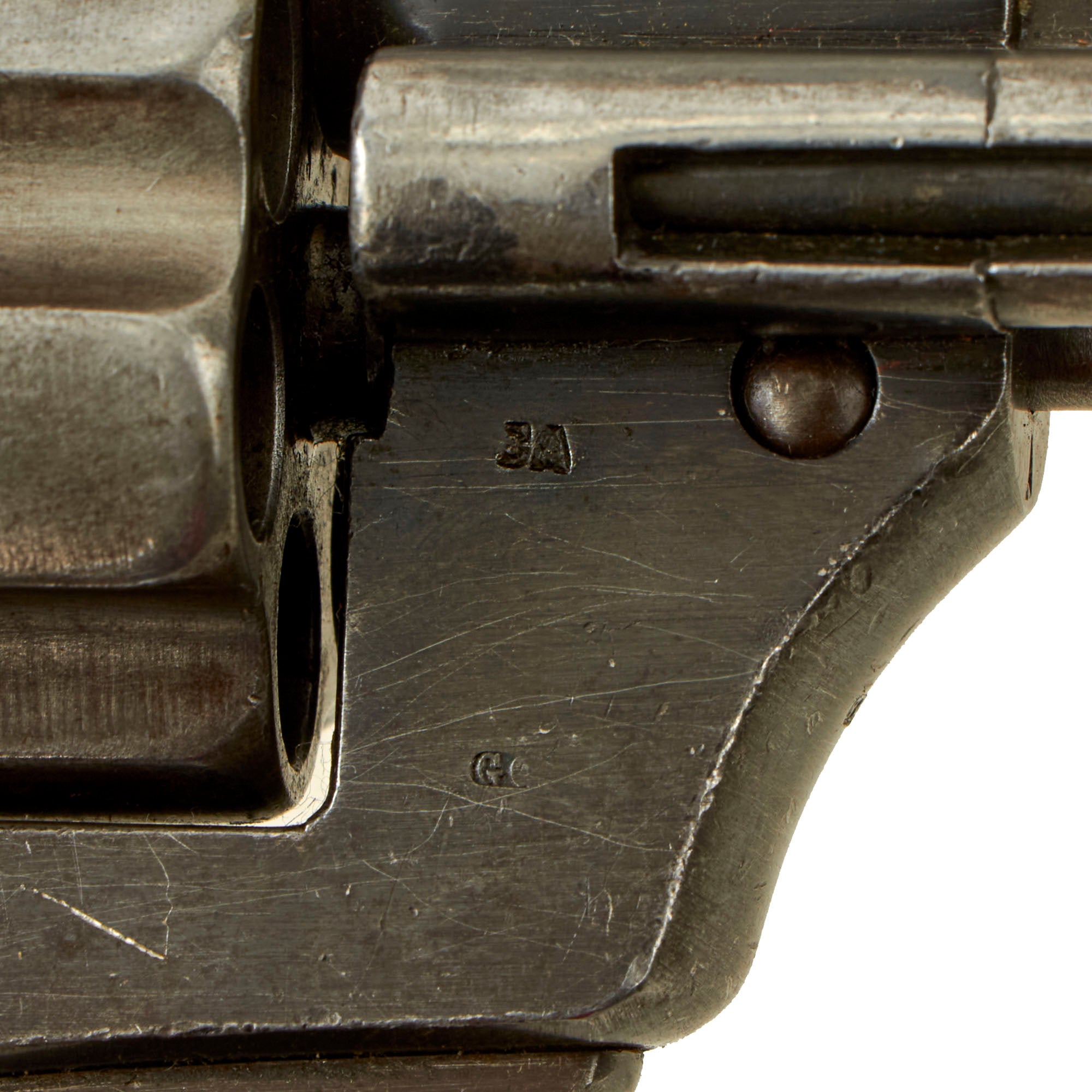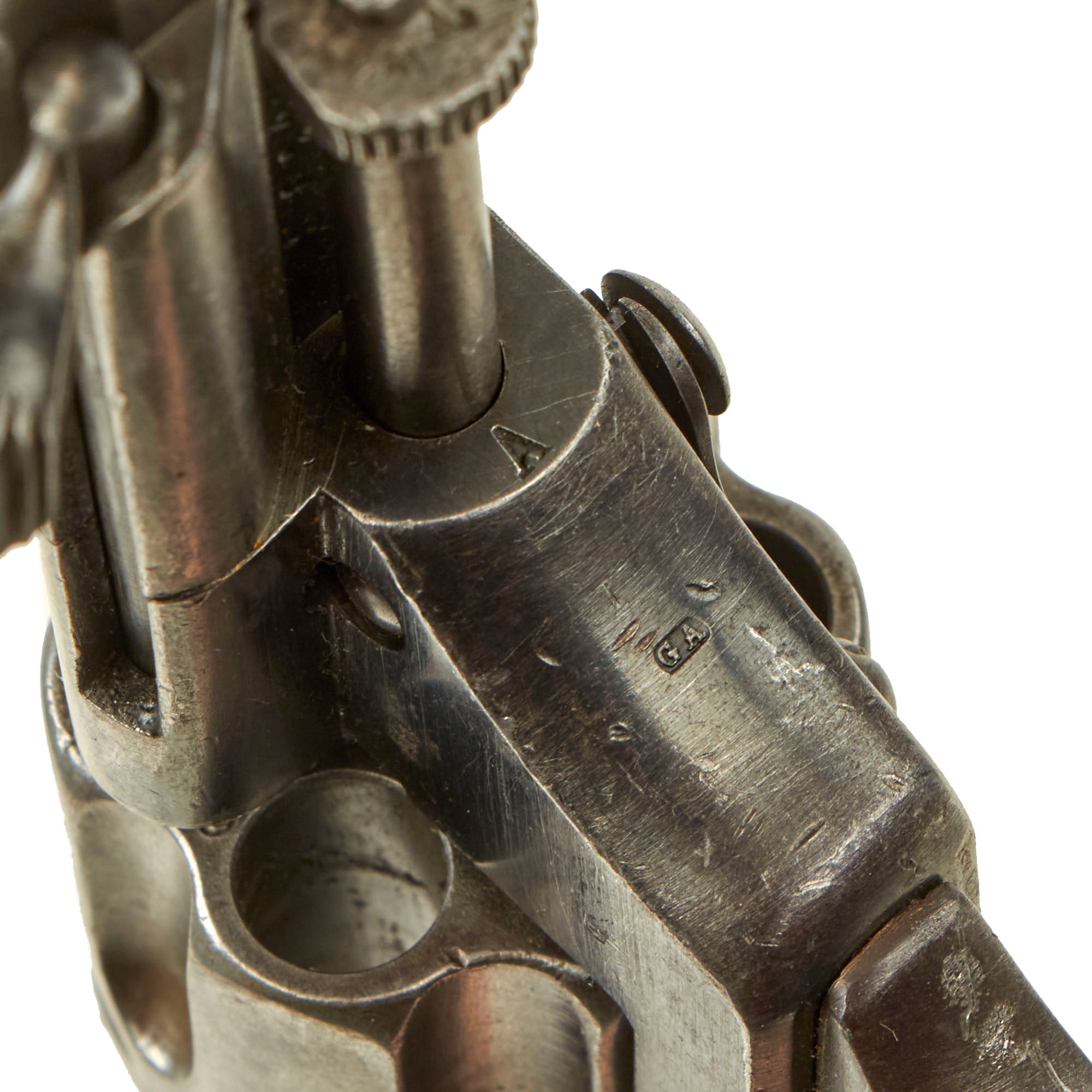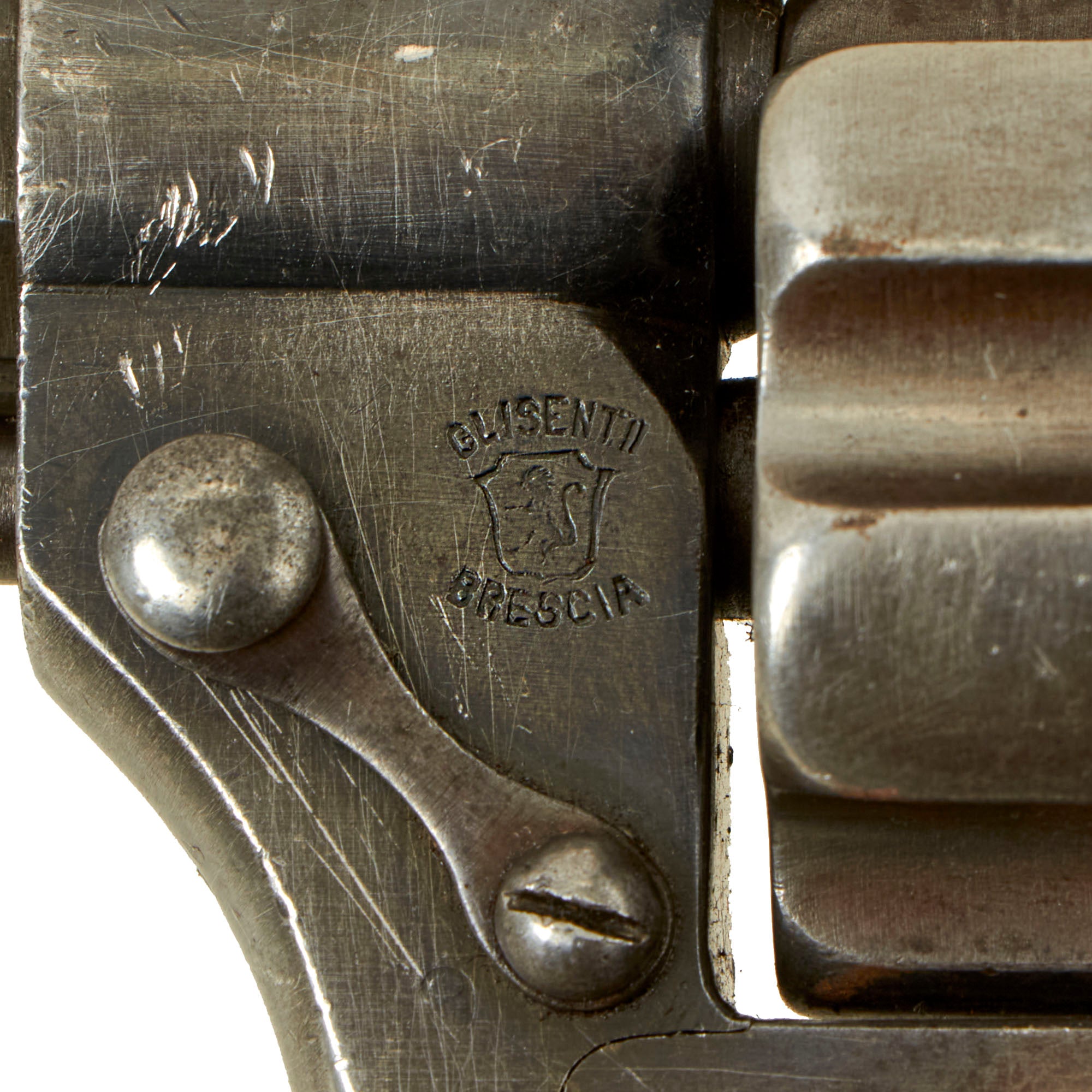 The Italian version, called the Pistola a rotazione modello 1874, was chambered for the 10.35×20 mm centerfire cartridge, and contracts were placed with many arms manufacturers throughout Italy. Brescia has long been a center of Italian gunsmithing, and had it's own arsenal, as well as many well-equipped gunmakers working independently. This revolver was manufactured by the Glisenti Weapons factory, and is marked GLISENTI / BRESCIA on the left side of the frame around the company coat of arms. On the right rear side of the frame it is marked with a very faint serial number where the number between the two 7's is completely worn away: NP7*7. We checked elsewhere, but this would only usually be stamped on the outside of the revolver, so we cannot confirm the true serial.