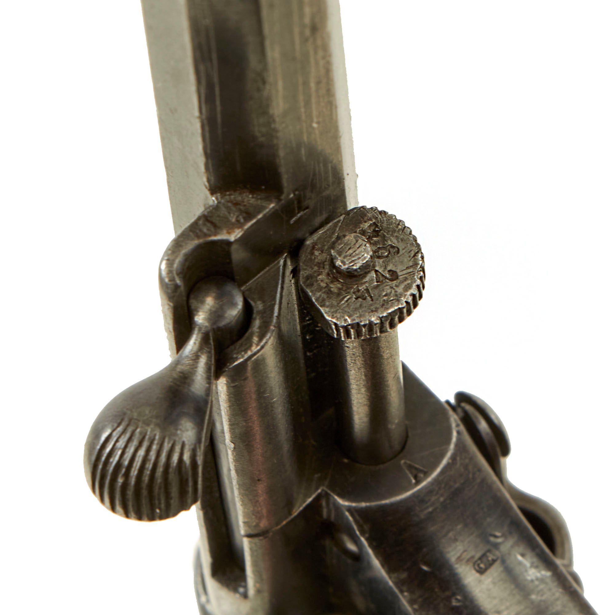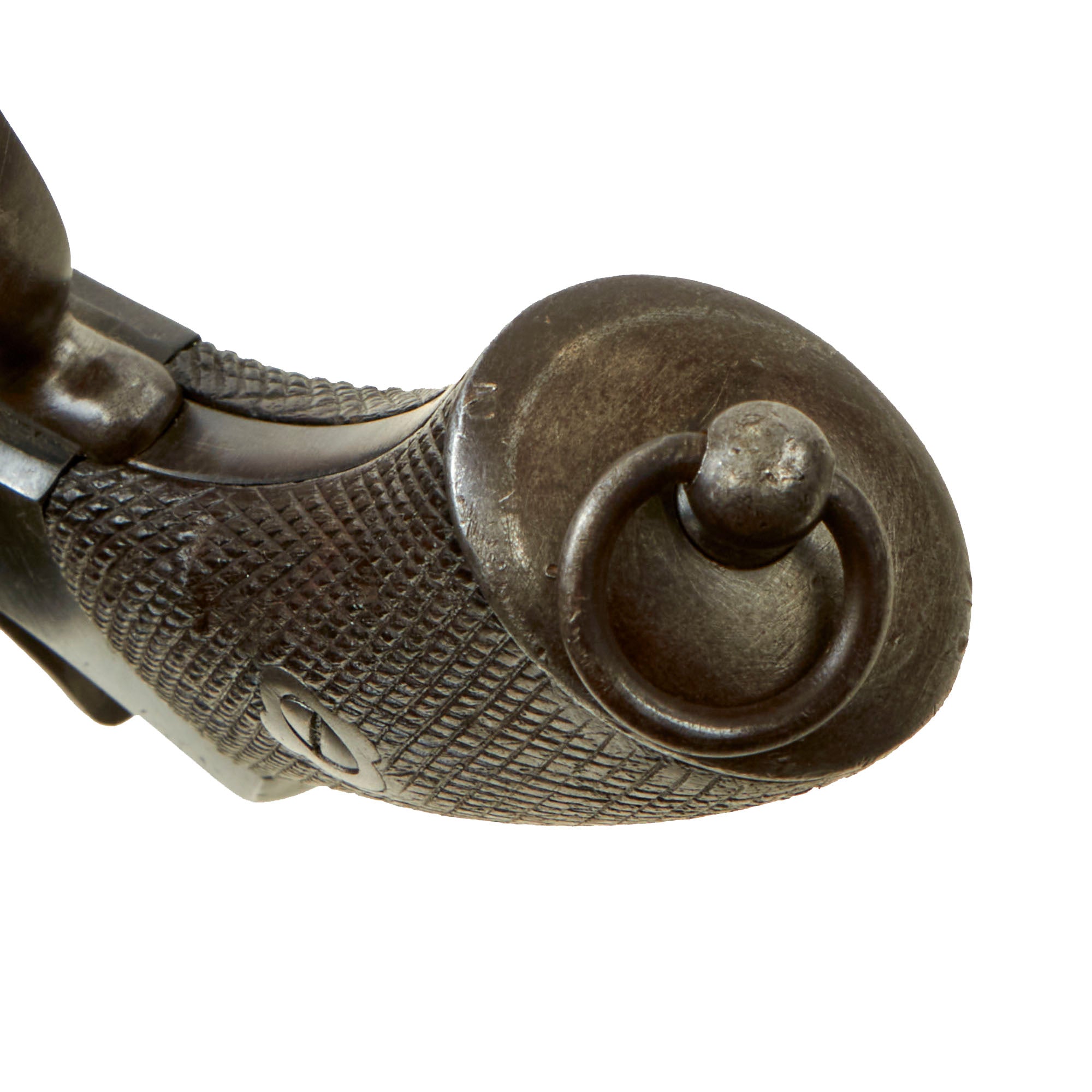 The action works great, with good cylinder lockup and indexing in both single and double action. The revolver breaks down correctly for cleaning, and both the loading gate and ejector rod are fully functional. The bore is in excellent condition, showing a bright finish with crisp lands and grooves. It does not look to have seen any major firing use during its service life. The lanyard ring is still present, and is not damaged or dented.