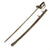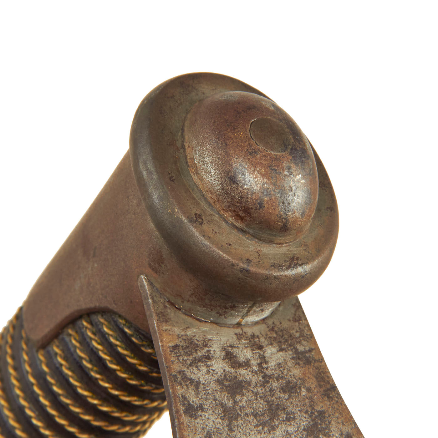 The hilt and scabbard, exposed to the air and elements, have fared a bit worse, with the scabbard showing an overall gray patina, with some pit rusting on the bottom of the drag, most likely from contact with a damp floor. The hilt has a similar gray patina, with some light rust on the pommel cap. The wire wrapped leather grip is in very good condition, showing only light wear, though it was damaged a bit on the back.