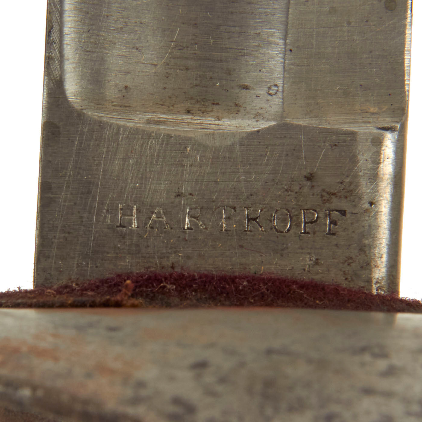 The saber is marked HARTKOPF on the blade ricasso, which be believe refers to Friedrich Hartkopf of Solingen, the legendary "City of Blades" in Western Germany. The Friedrich Hartkopf company has a long knife tradition. Founded in 1890 by Friedrich Wilhelm Hartkopf in the city of Solingen (Germany). Hartkopf specialized in the production of high quality pocket folding knives, daggers, swords and other edged weapons. Due to its good reputation, Hartkopf knives are known all over the world.
